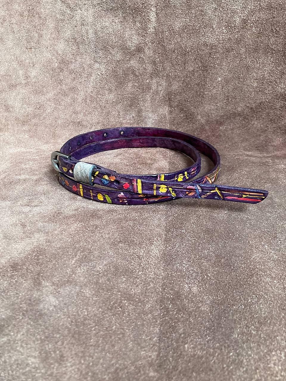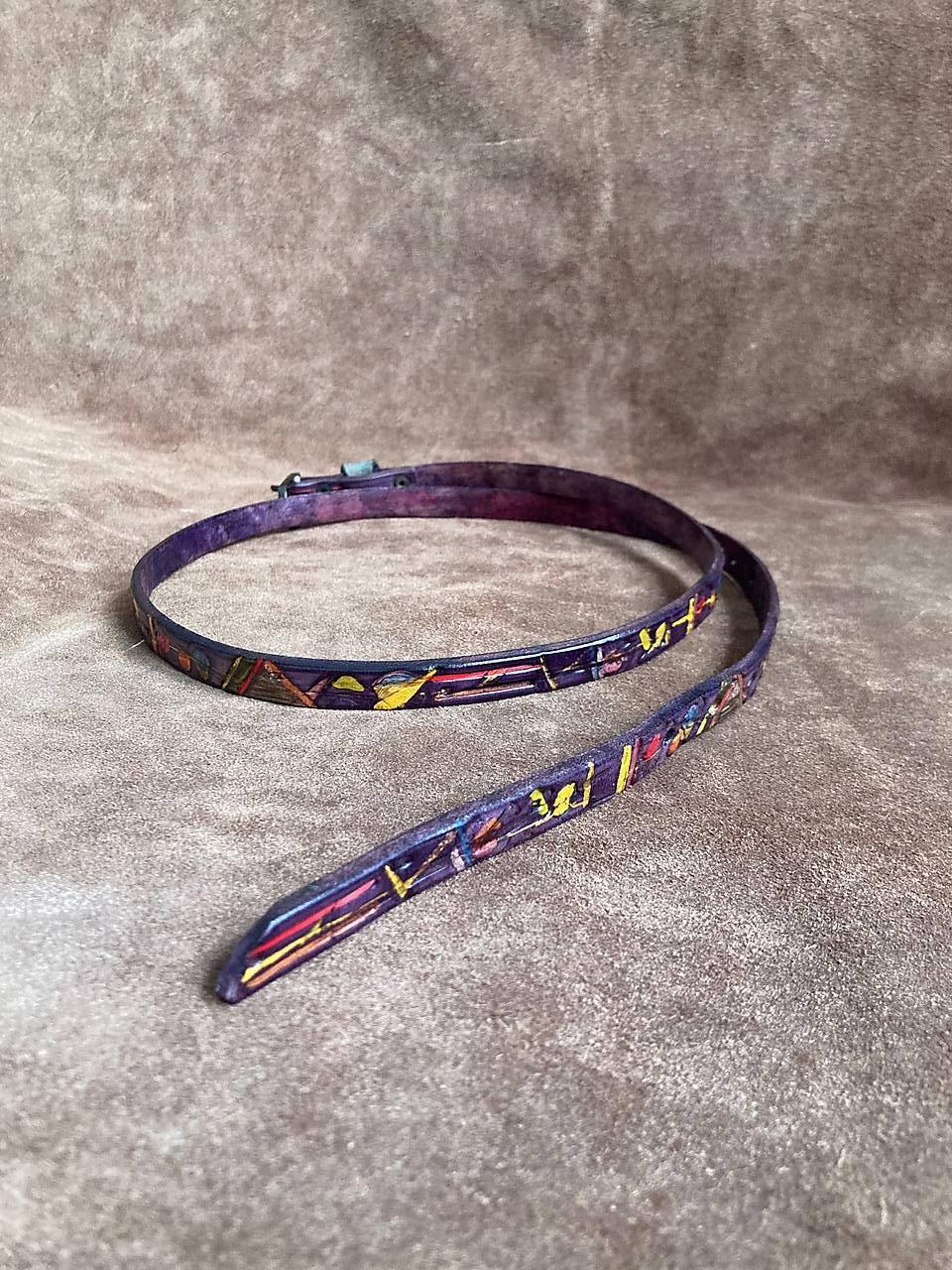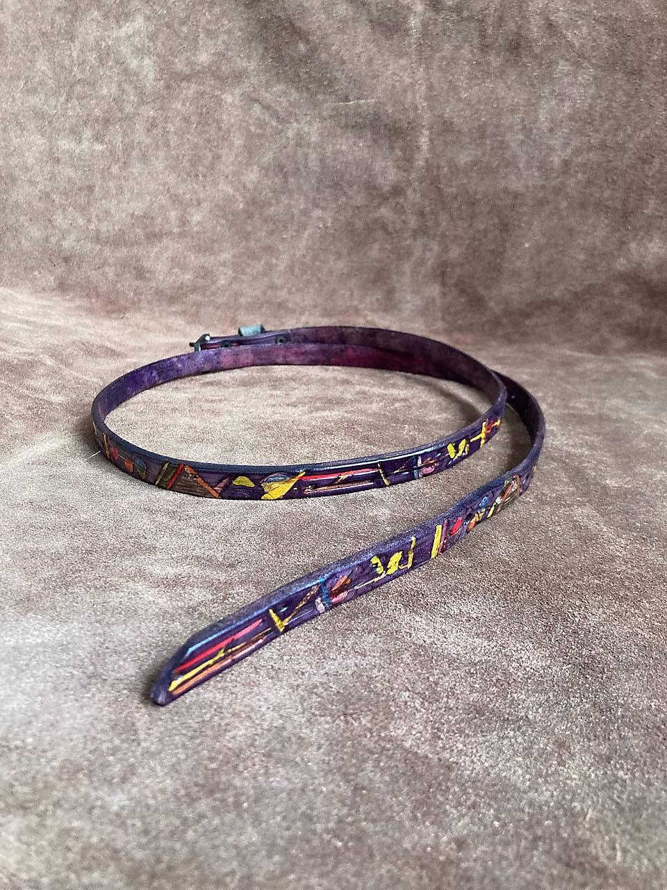 Zdobený po celé délce abstraktním vzorem, který je vytvořen / rytím / raznicemi vlisovaným vzorem / malováním / dobarvený je do fialové.
