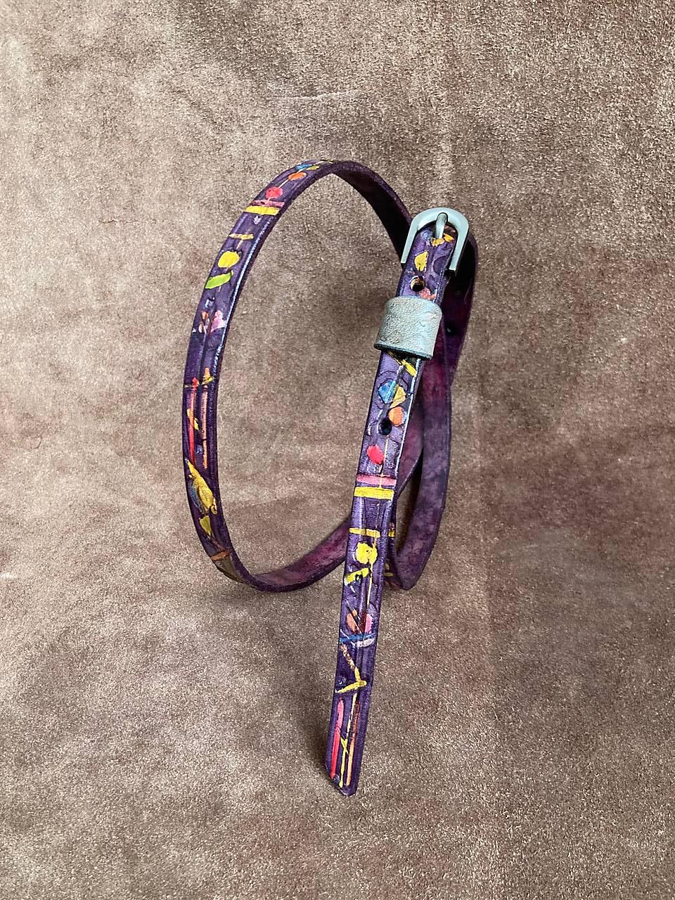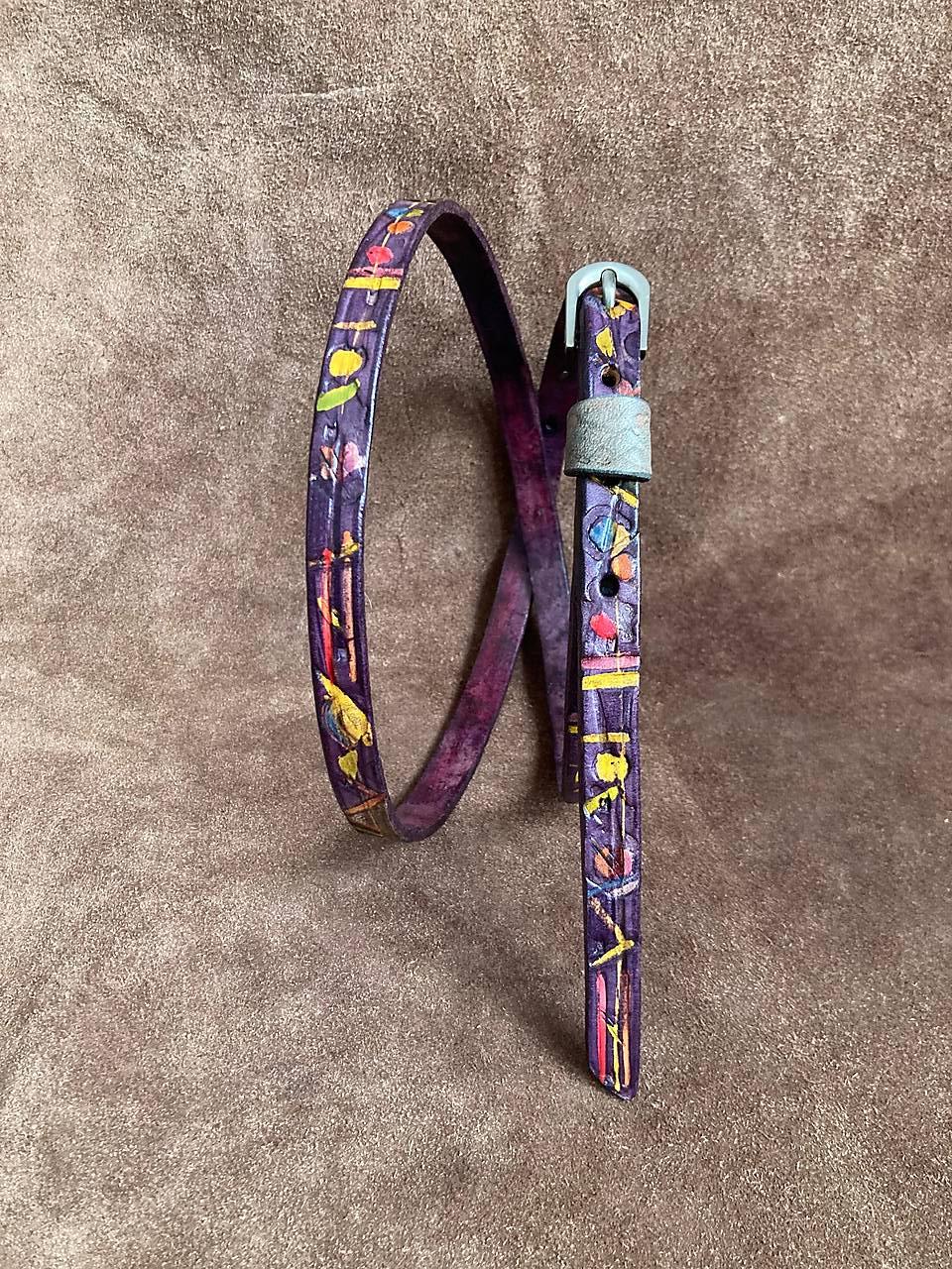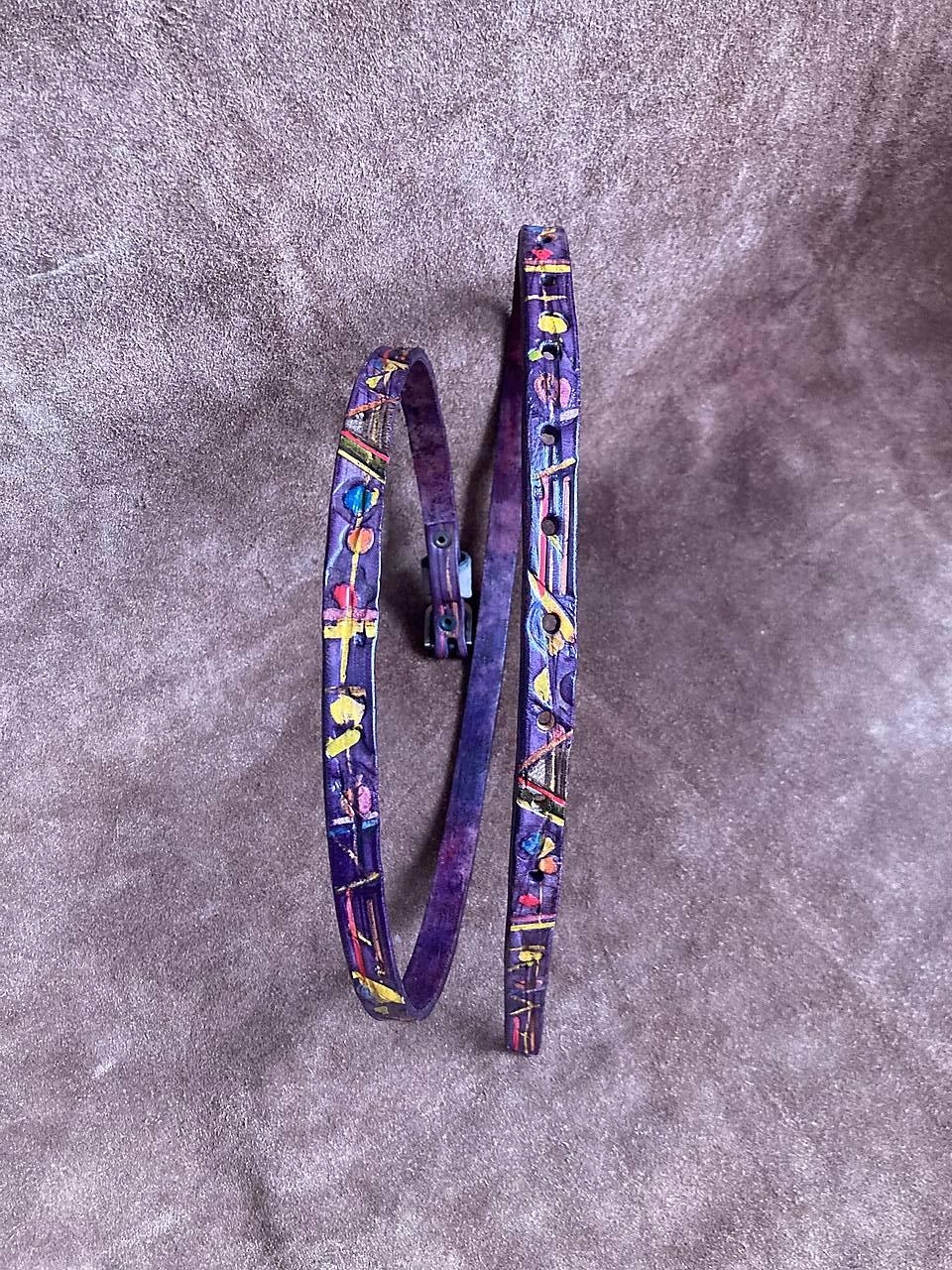 Zdobený po celé délce abstraktním vzorem, který je vytvořen / rytím / raznicemi vlisovaným vzorem / malováním / dobarvený je do fialové.