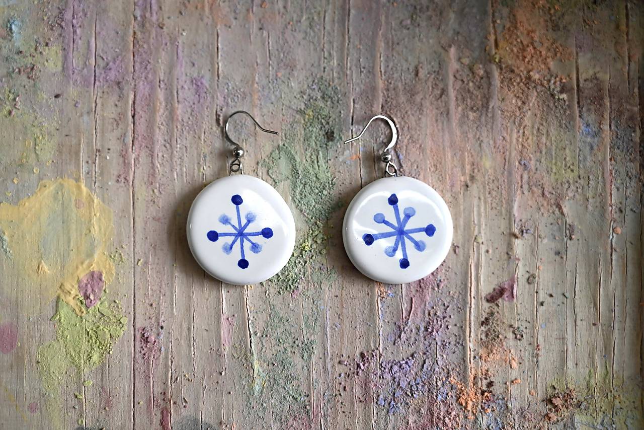 Každý pár je originál, ručne tvarovaný a maľovaný podľa starých modranských vzorov. Keramika je glazovaná z oboch strán. Kovové komponenty sú z chirurgickej ocele, takže sú hypoalergénne a vhodné aj pre citlivú pokožku. Priemer náušníc je 3 cm.