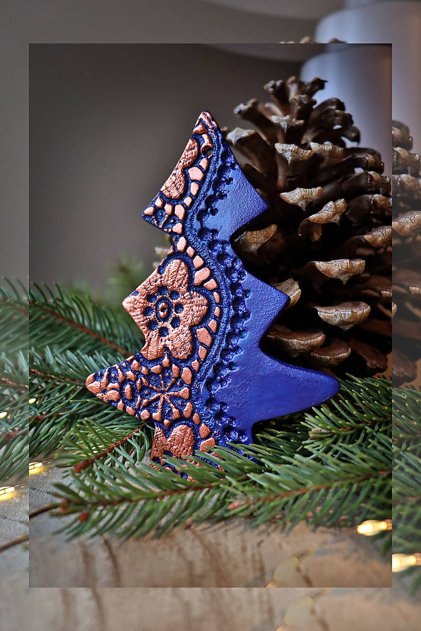 Ručne vyrobený vianočný stromček zo samo tvrdnúcej hlinenej hmoty s elegantnou pretláčanou textúrou.