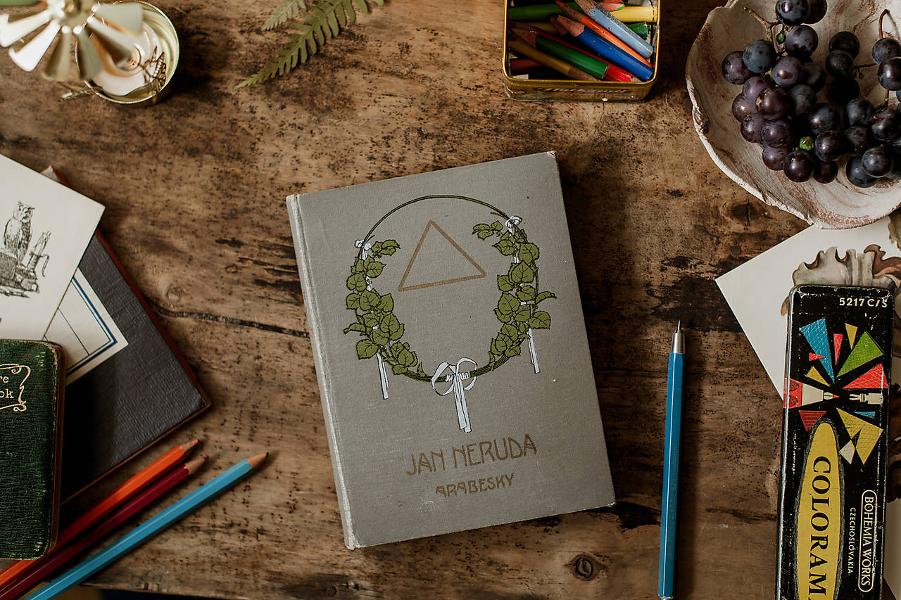 Jan Neruda - Arabesky. 140 strán, 135 x 175 mm. Pekná antikvariátna väzba s ražbou. Trhané okraje strán.