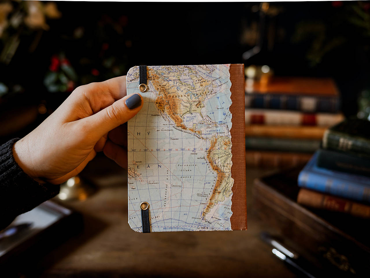 Malý zápisník či skicár, ktorého obálku zdobia ilustrácie zo starej poškodenej knihy. Zápisník má chrbát z knihárskeho plátna, oblé roky a praktické zatváranie na gumičku. 120 strán, 107 x 147 mm.