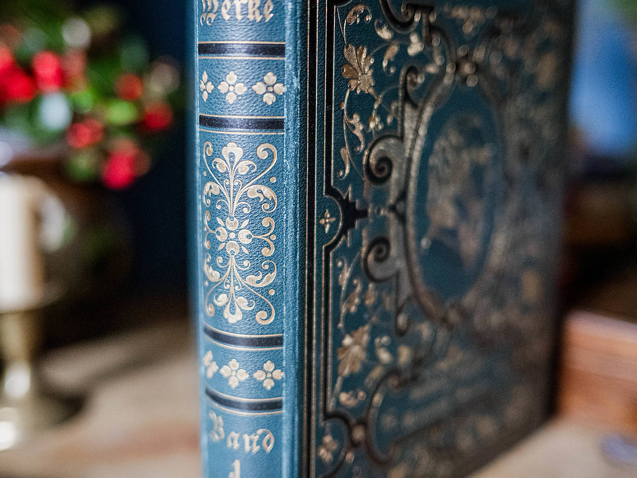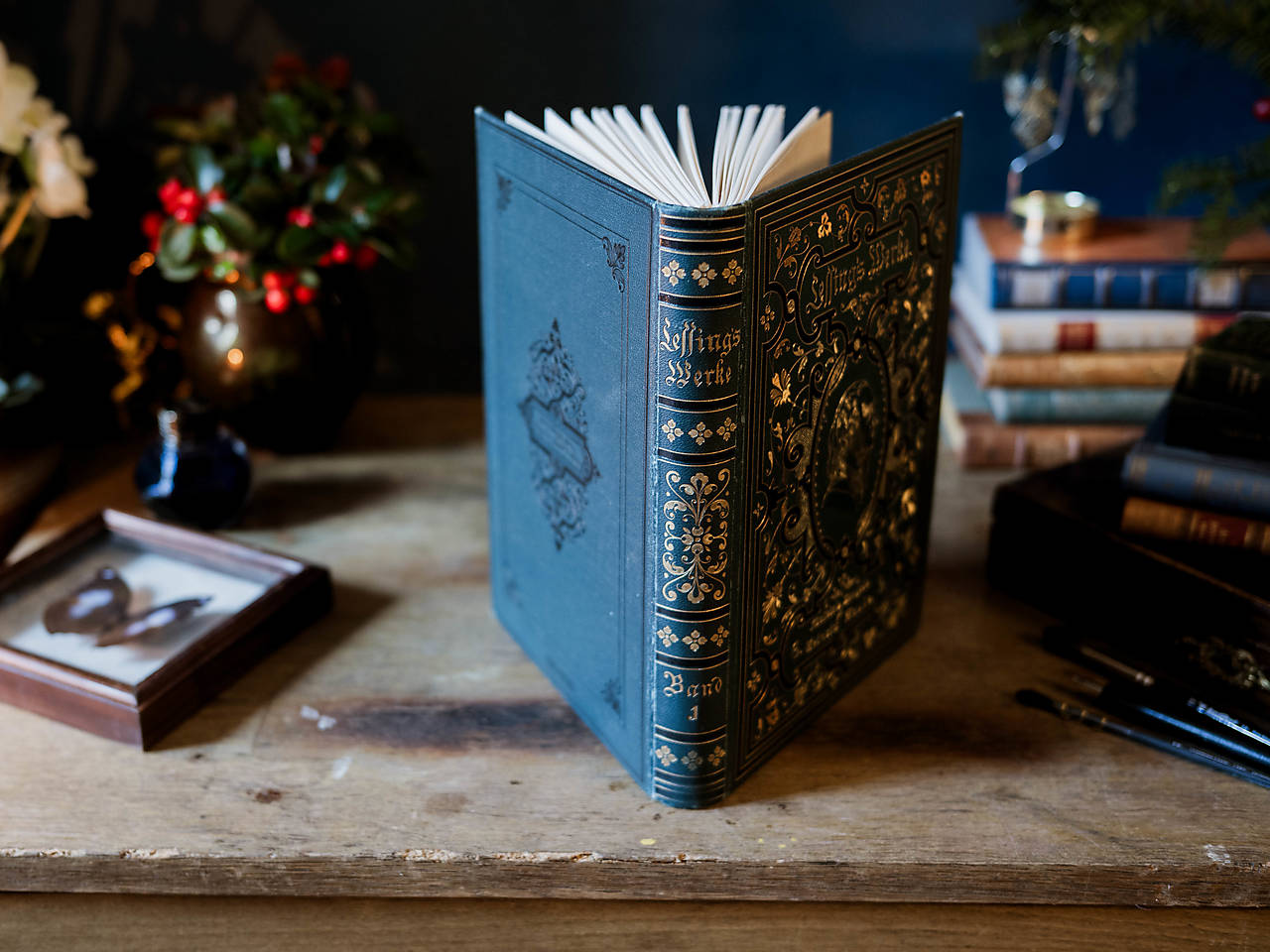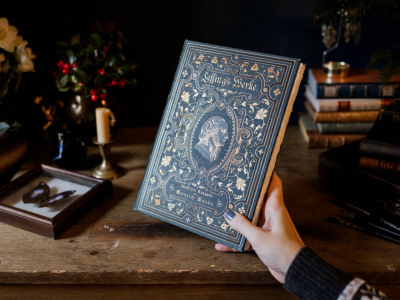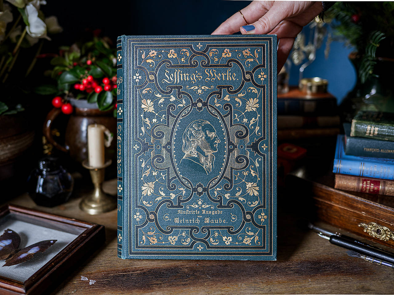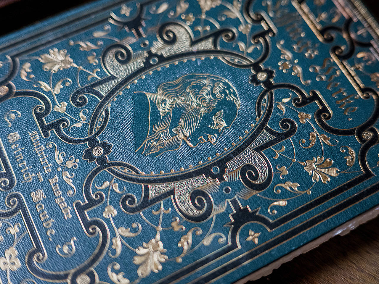 Lessing's Werke, 96 strán, 185 x 265 mm. Antikvariátna väzba bohato zdobená zlatou ražbou, väčší formát. Trhané okraje strán. Skicár sa dá rozložiť naplocho.