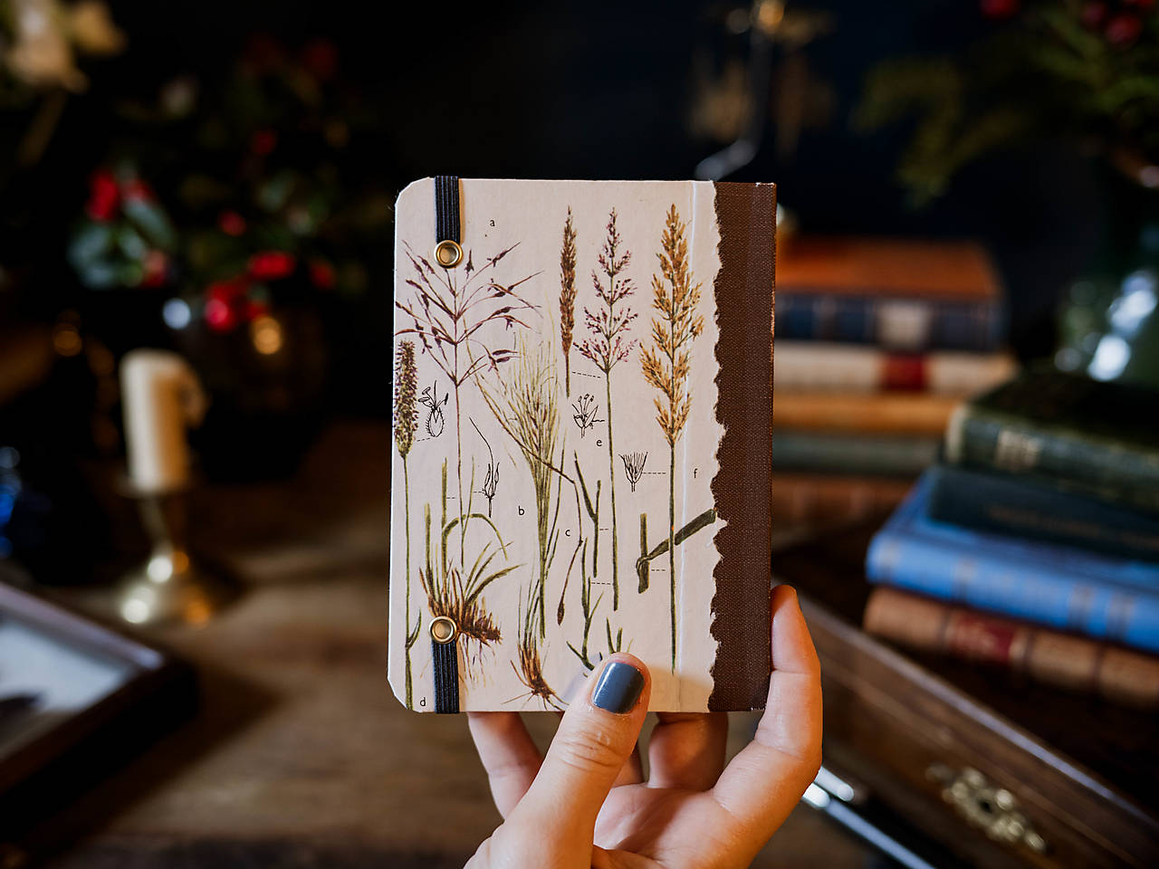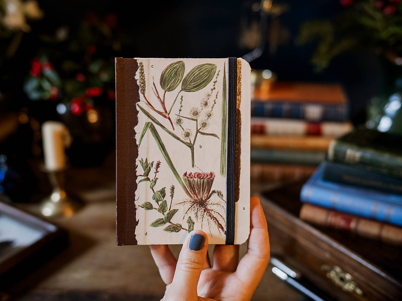 Malý zápisník či skicár, ktorého obálku zdobia ilustrácie zo starej poškodenej knihy. Zápisník má chrbát z knihárskeho plátna, oblé roky a praktické zatváranie na gumičku. 120 strán, 107 x 147 mm.