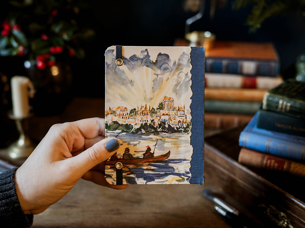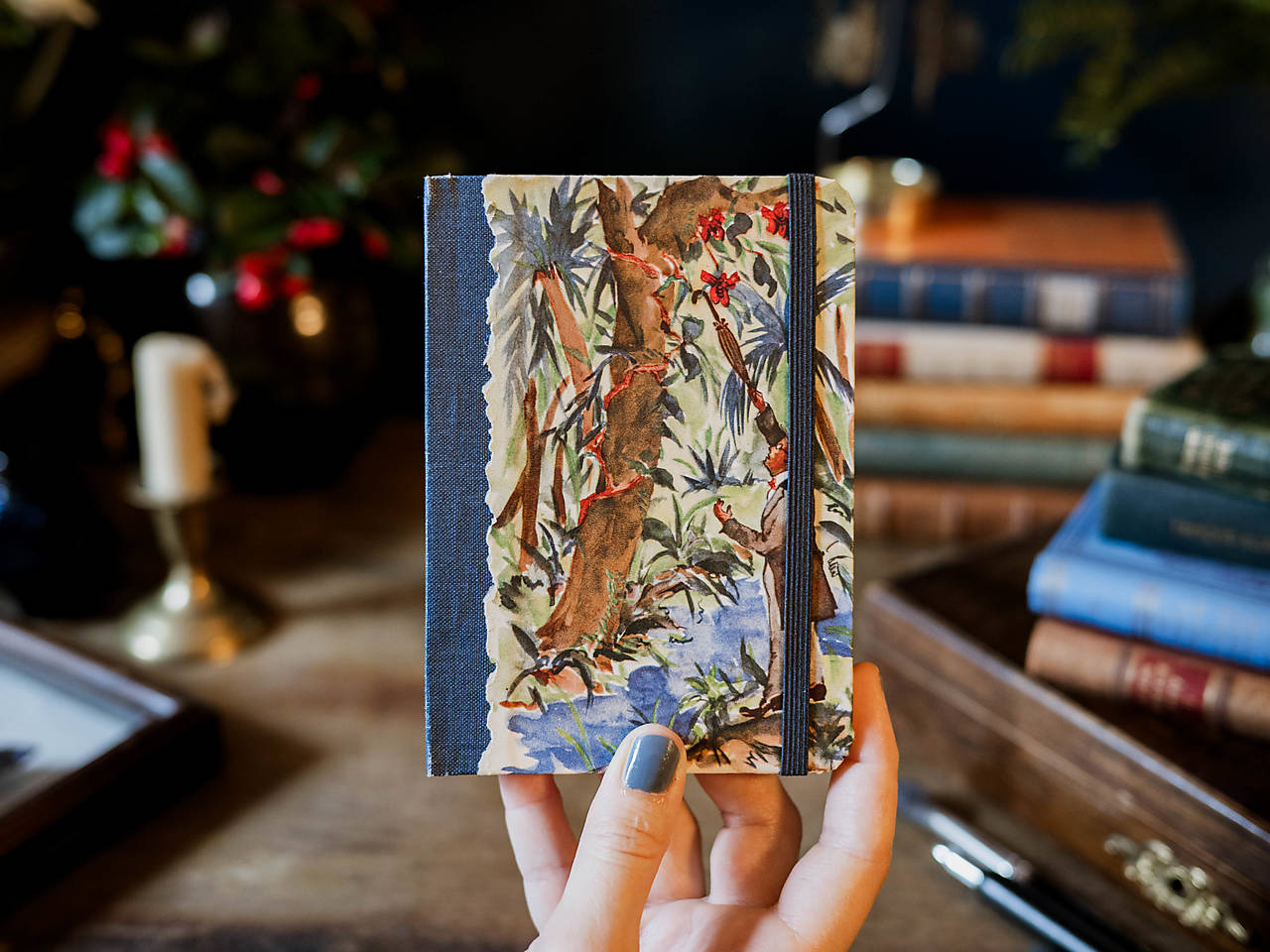 Malý zápisník či skicár, ktorého obálku zdobia ilustrácie zo starej poškodenej knihy. Zápisník má chrbát z knihárskeho plátna, oblé roky a praktické zatváranie na gumičku. 120 strán, 107 x 147 mm.