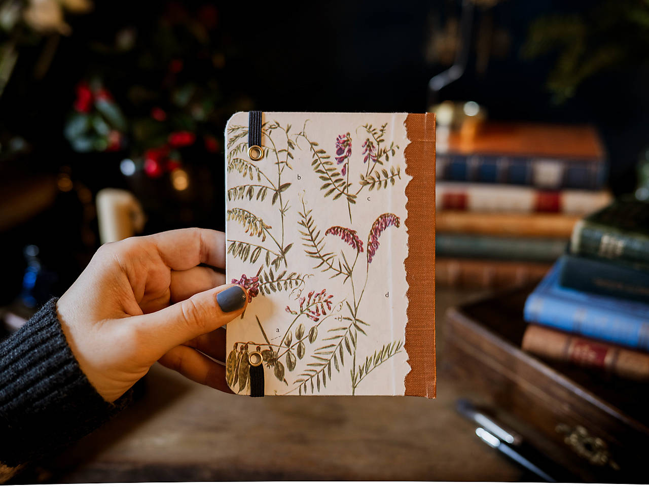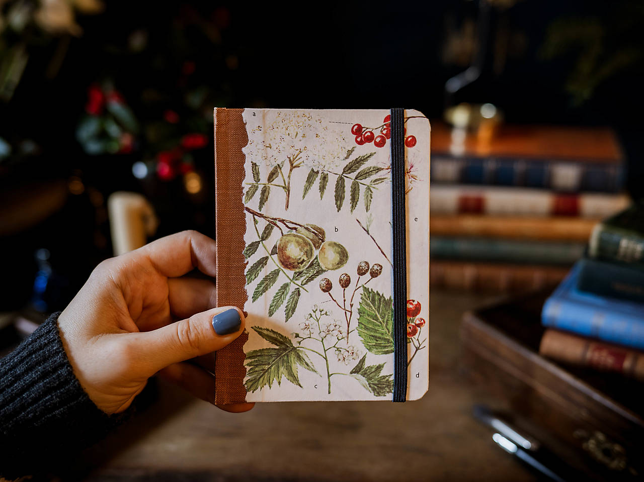 Malý zápisník či skicár, ktorého obálku zdobia ilustrácie zo starej poškodenej knihy. Zápisník má chrbát z knihárskeho plátna, oblé roky a praktické zatváranie na gumičku. 120 strán, 107 x 147 mm.