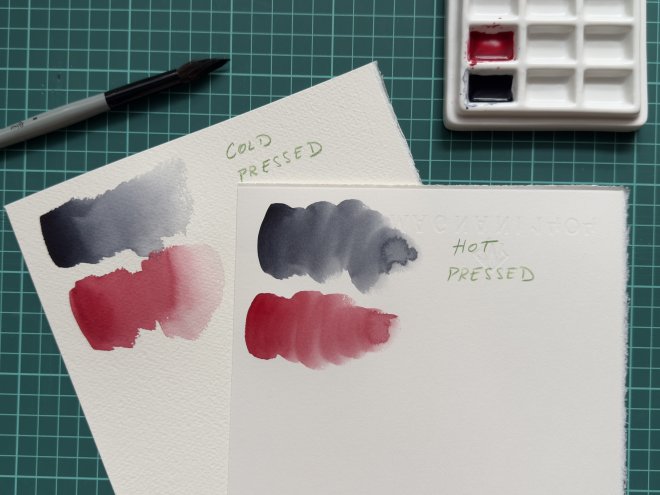 Papiere lisované za studena (cold pressed) majú výraznejšiu typicky akvarelovú štruktúru.