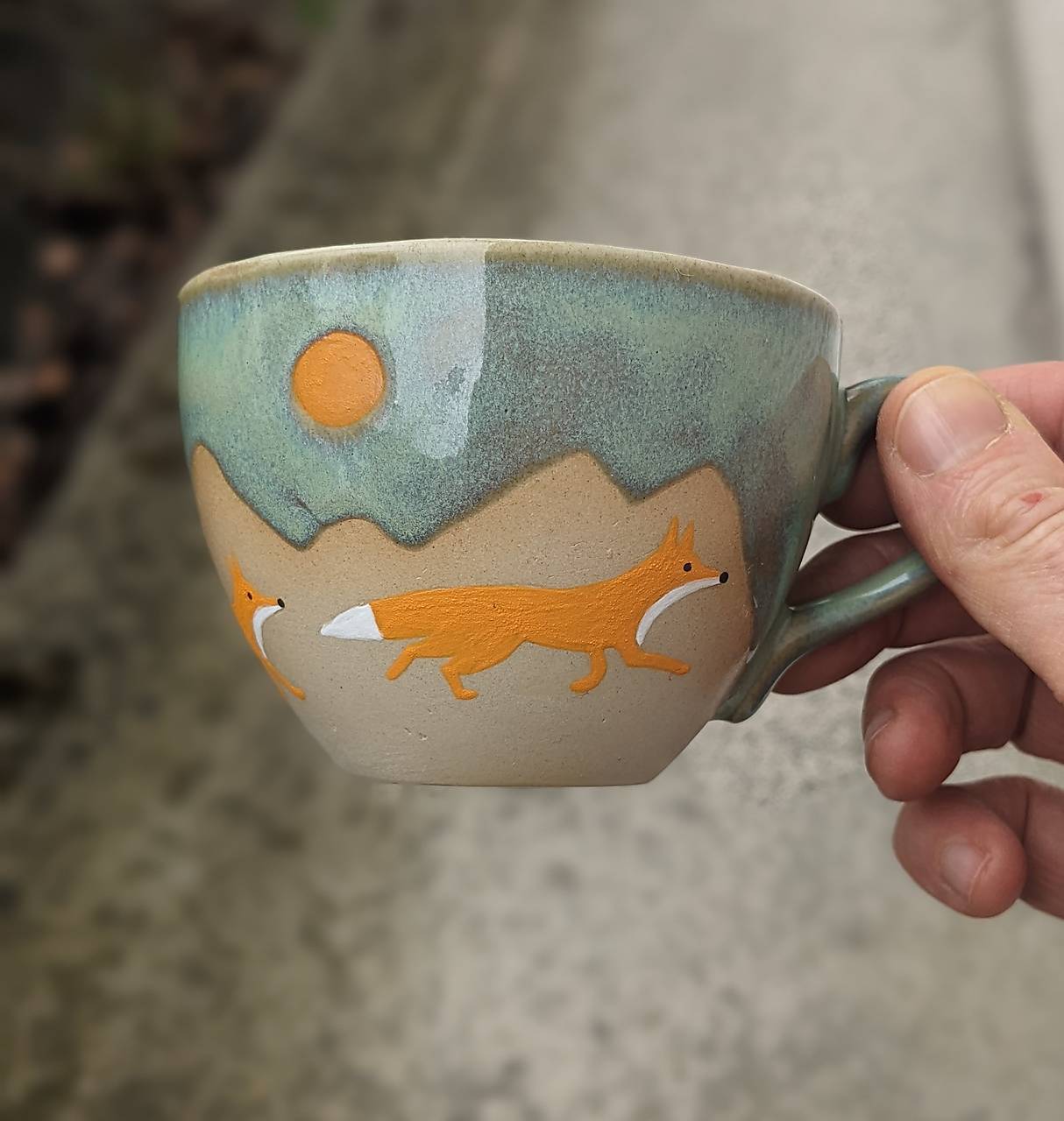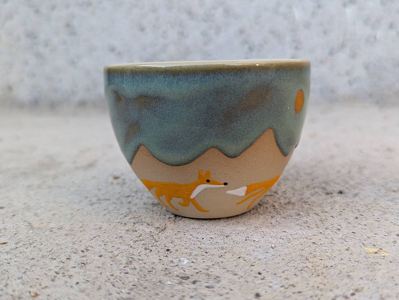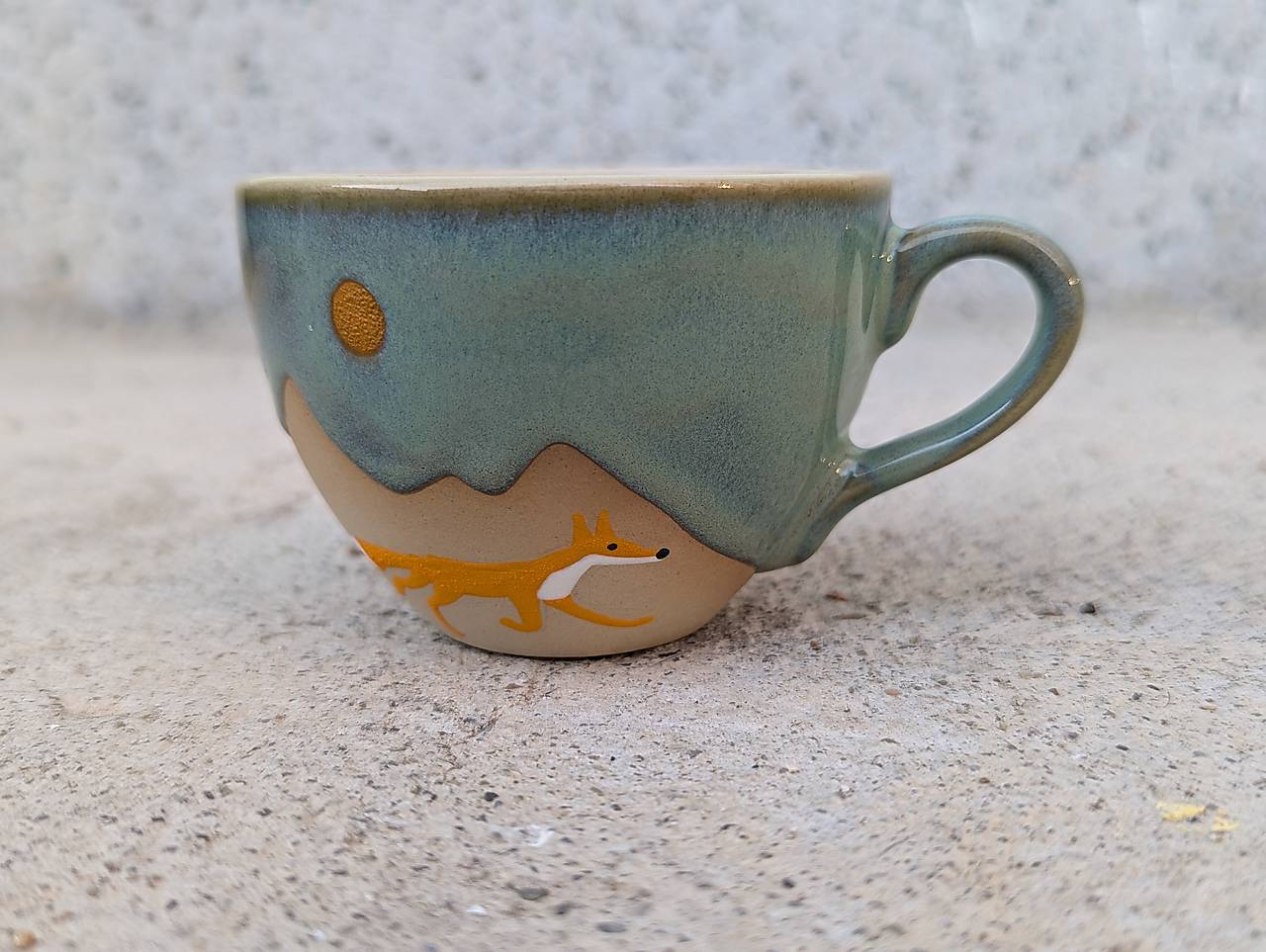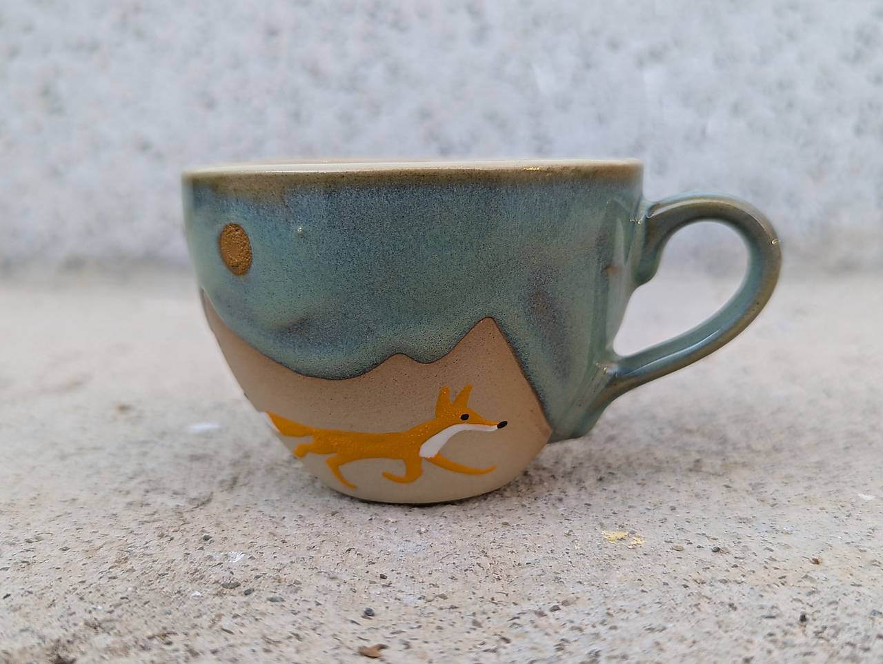Odlievaná z bledej kameniny, ručne maľovaná, glazovaná z hornej časti zelenkavou lesklou efektnou glazúrou. Z vnútra je glazovaná transparentnou lesklou glazúrou. Časť na ktorej sú líšky je ponechaná bez glazúry, trochu drsná.