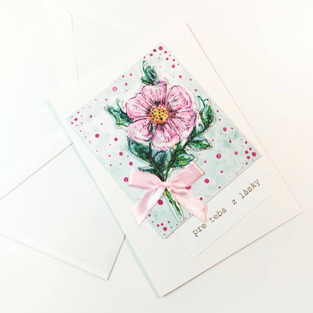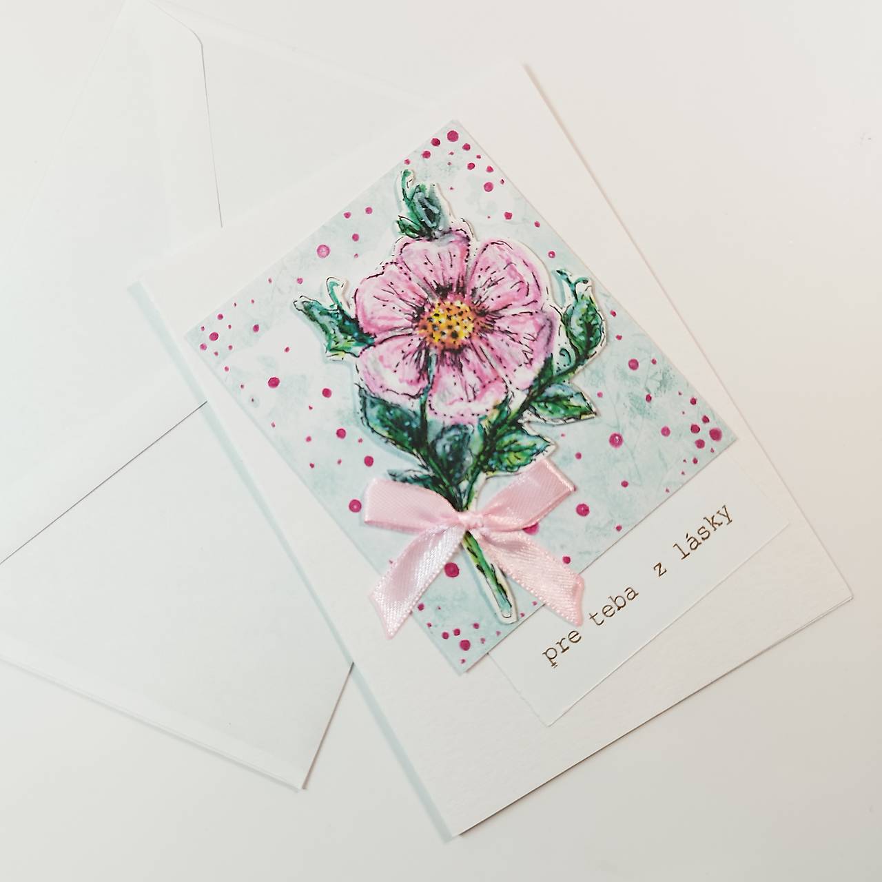 Materiál: akvarelový papier, stužka, potlačený papier