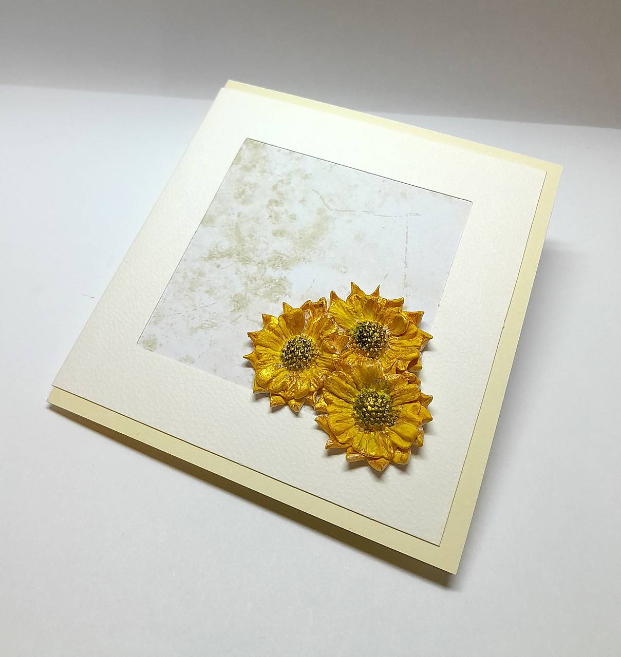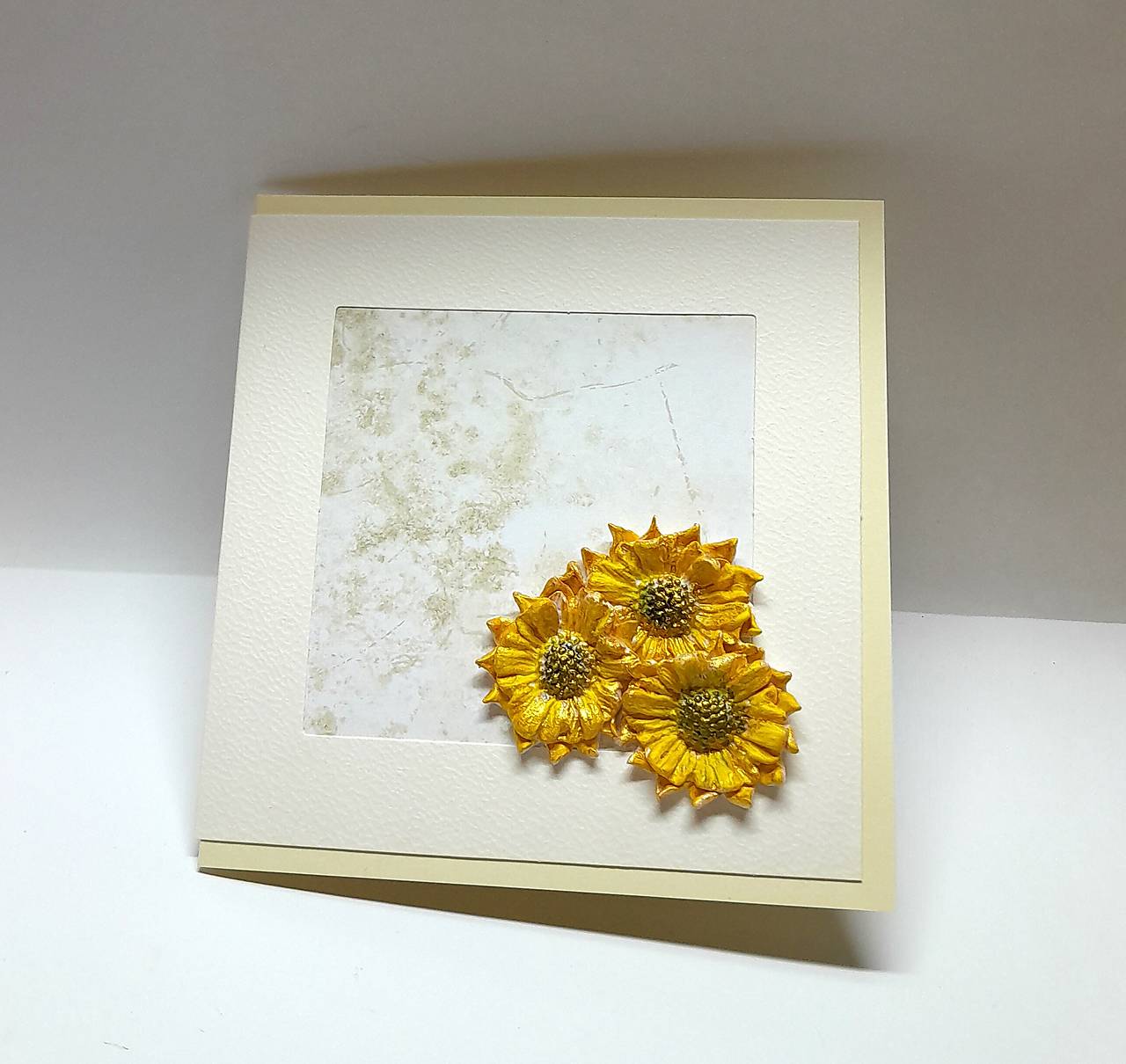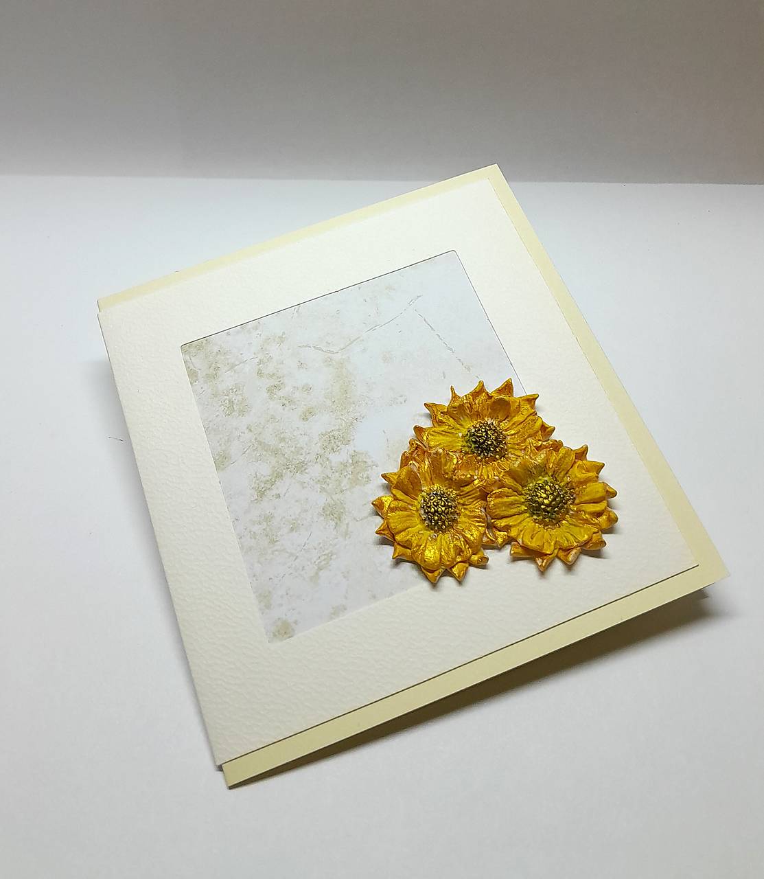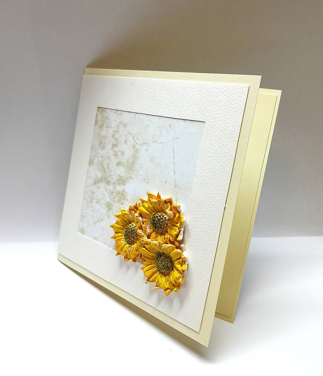 Prednú a zadnú stranu pohľadnice zdobí pohľadnicový základ s výrezom okna na prednej strane, v prírodnej farbe, papier je s jemnou štruktúrou ... v okne je nalepený dizajnový papier a 3 slnečnice - ručne modelované, vytvorené z polymérovej hmoty, farbené akrylovou farbou (žltou, zlatou, hnedou) ... na požiadanie vlepím záložku alebo malú obálku na peňažný darček ...