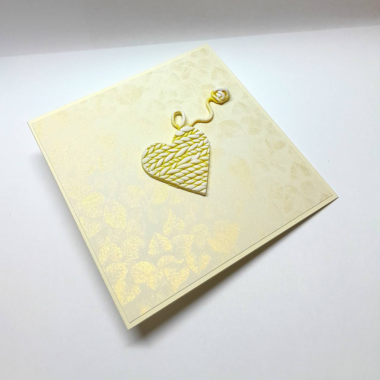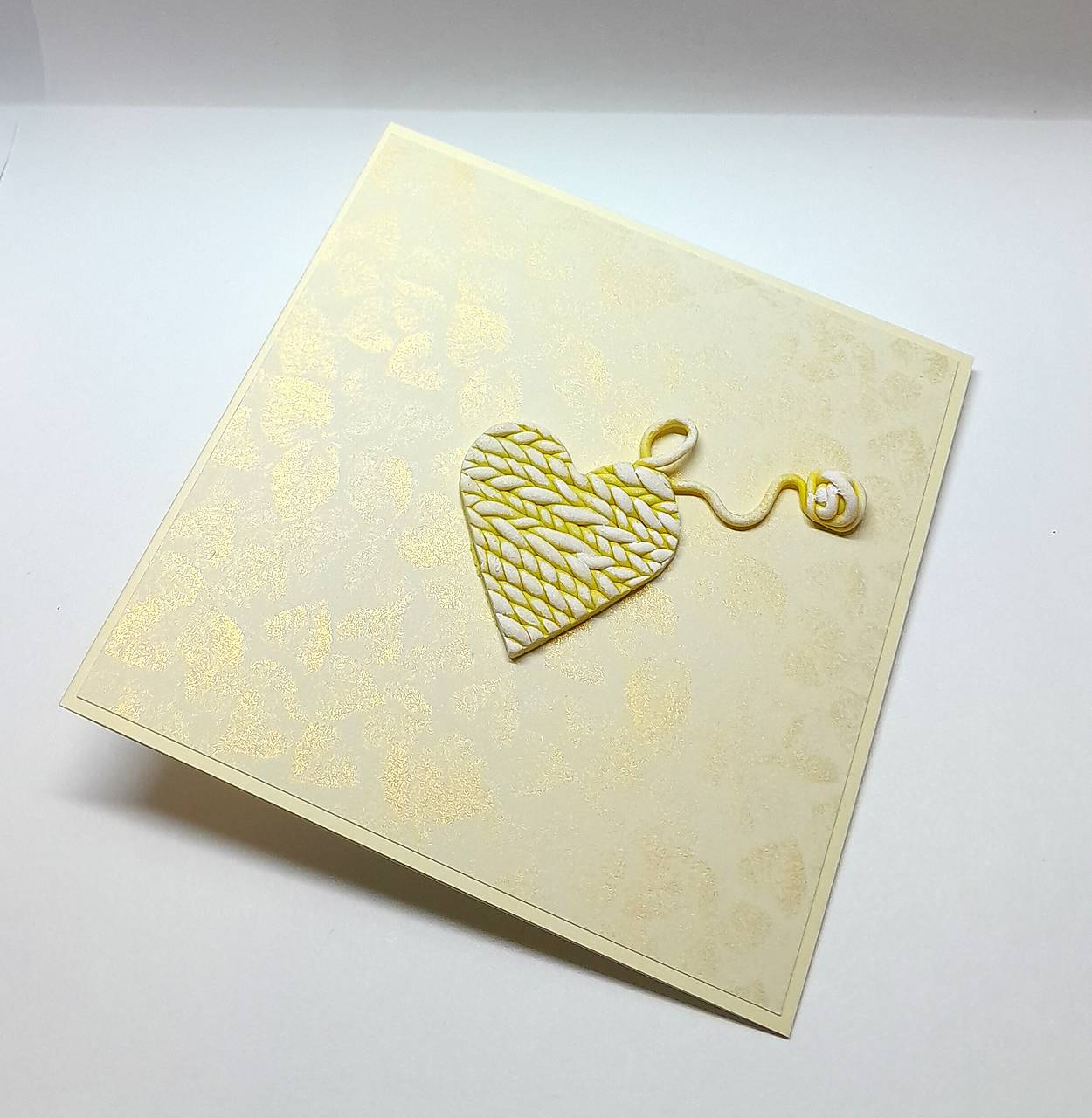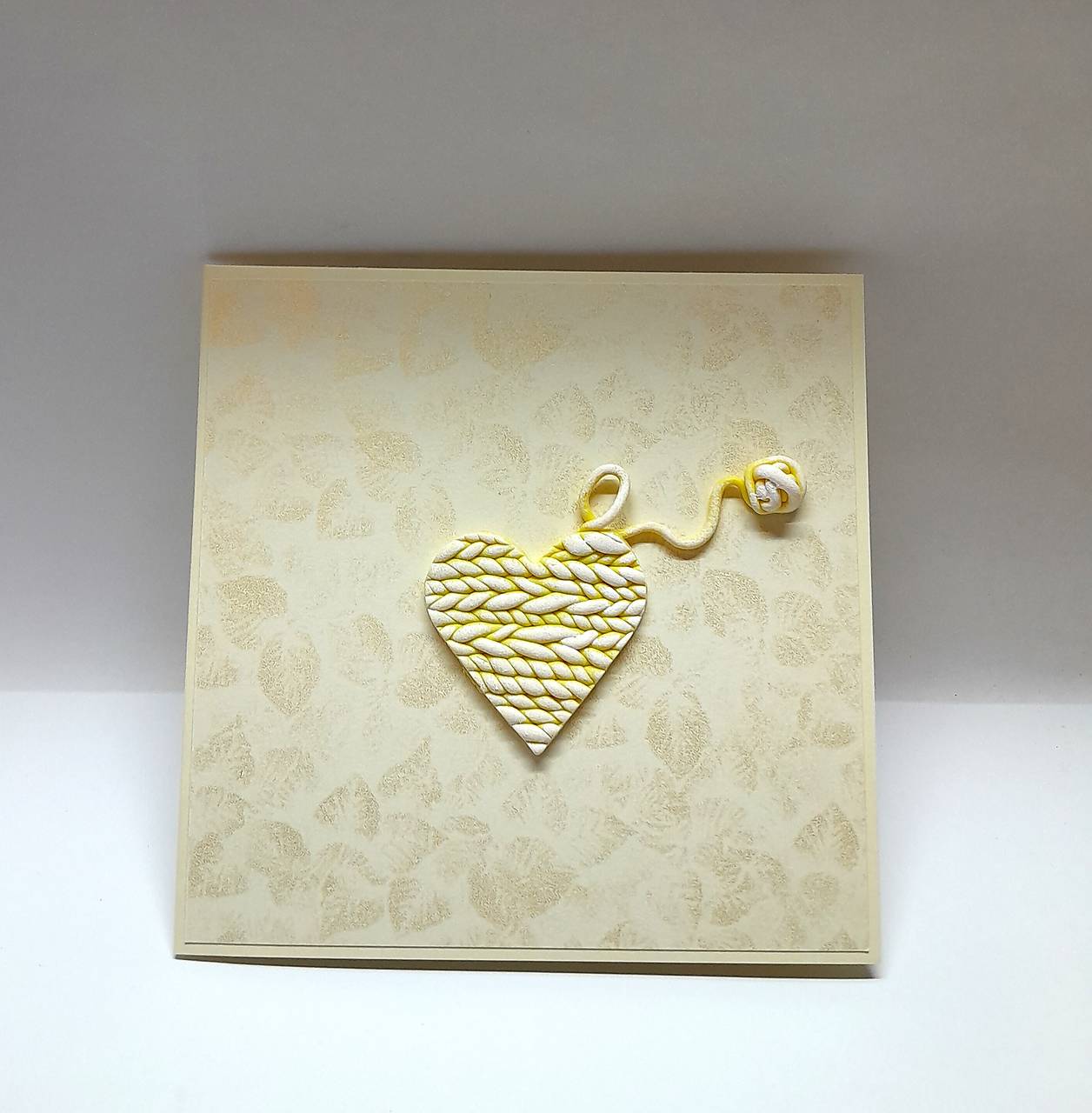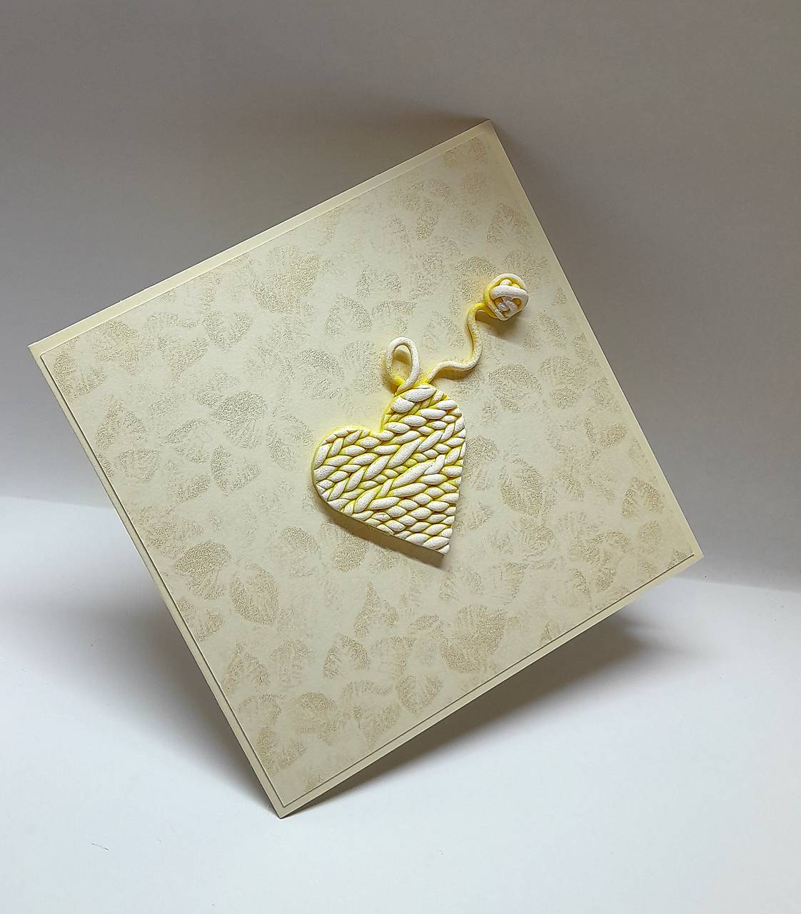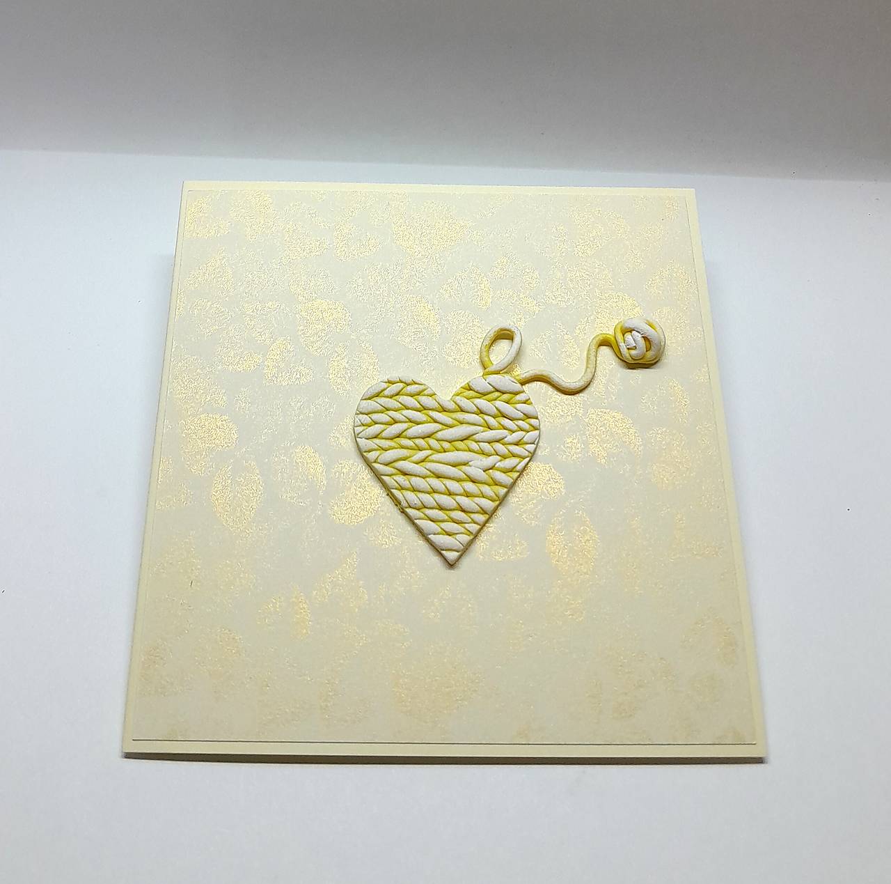 Prednú stranu pohľadnice zdobí pletené srdce s klbkom - je ručne modelované, vytvorené z polymérovej hmoty, maľované akrylovou farbou ...