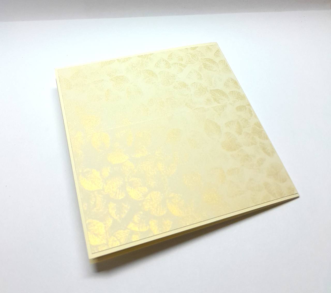 Pohľadnica / blahoželanie má základ jemnej maslovej farby rozmerov 13,5 x 13,5 cm, je otváracia, vo vnútri bez textu. Pohľadnicu zdobia a spevňujú dizajnové papiere podľa fotografií na prednej, zadnej i vnútornej strane pohľadnice ( maslovozlatavé so vzorom lístkov tón v tóne ), vo vnútri na pravej strane je nalepený papier na napísanie priania / blahoželania ...