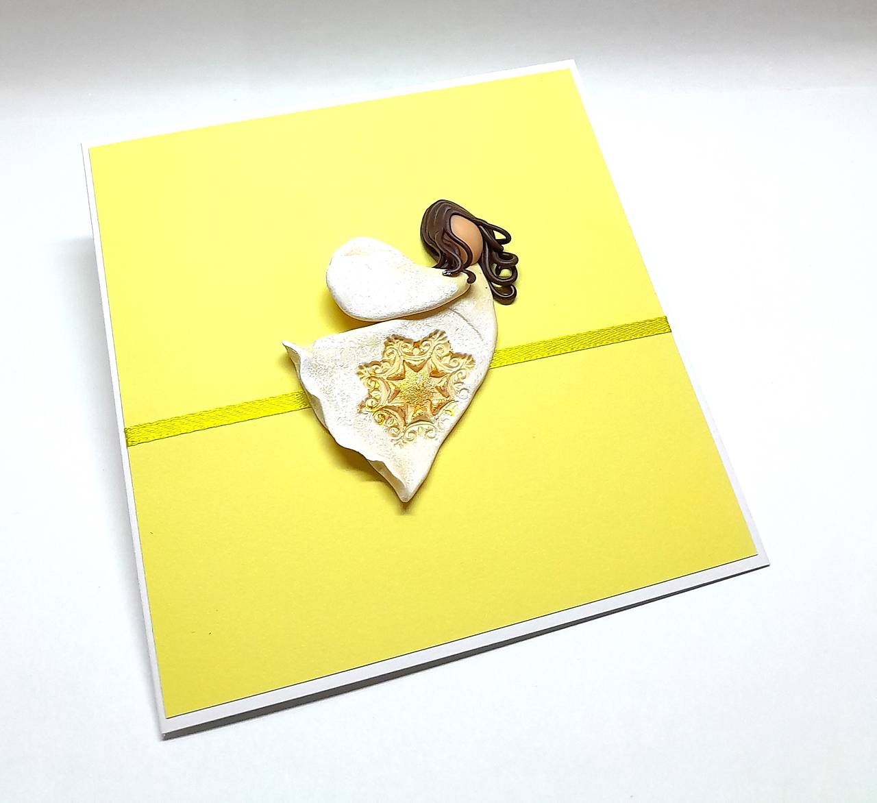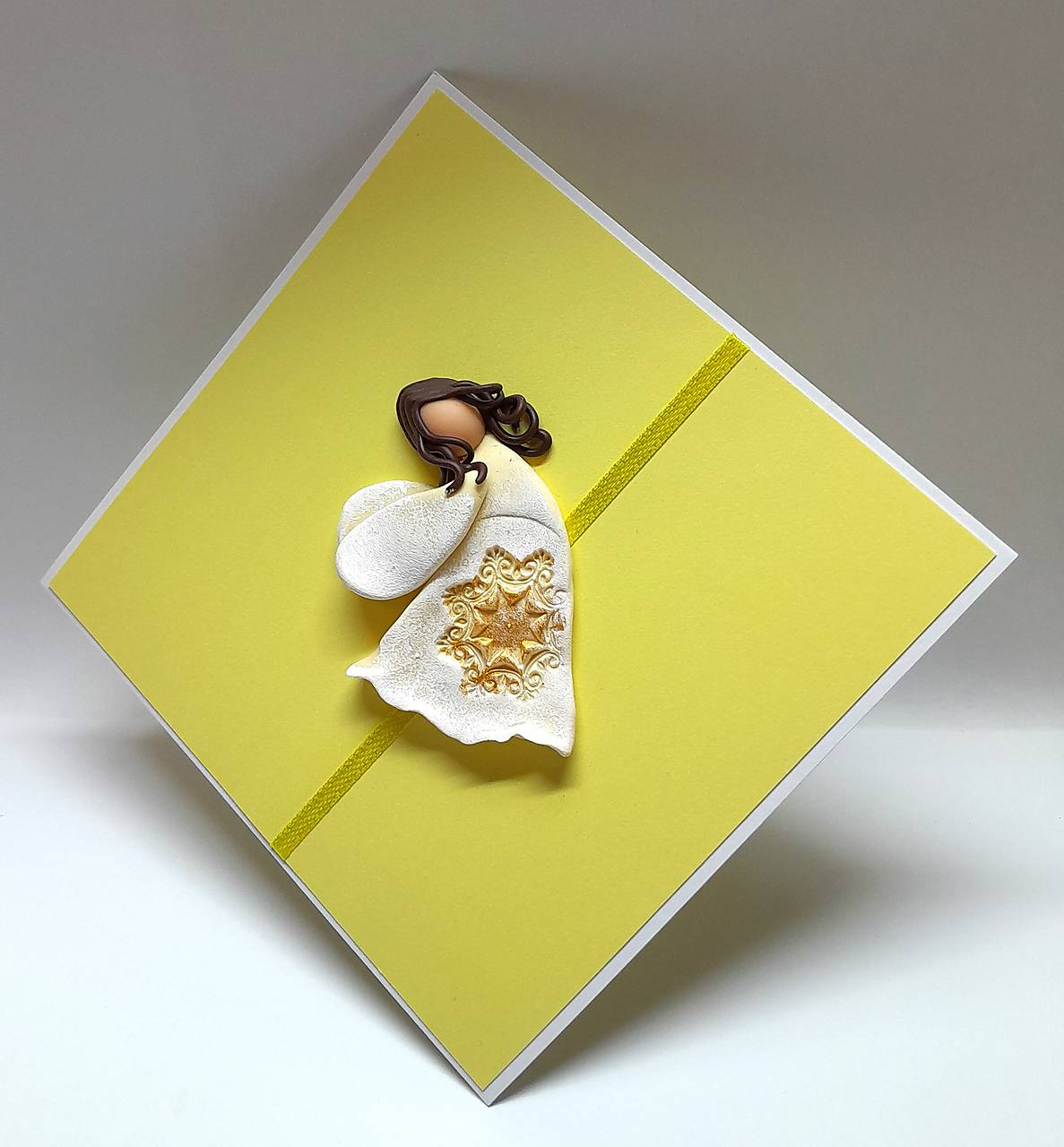 Na prednej strane pohľadnice je nalepený  Anjelik - je ručne modelovaný a vytvorený z polymérovej hmoty, primaľovaný akrylovou farbou (bielou) ...  prednú stranu dopĺňa aj farebne ladiaca stužka  ...