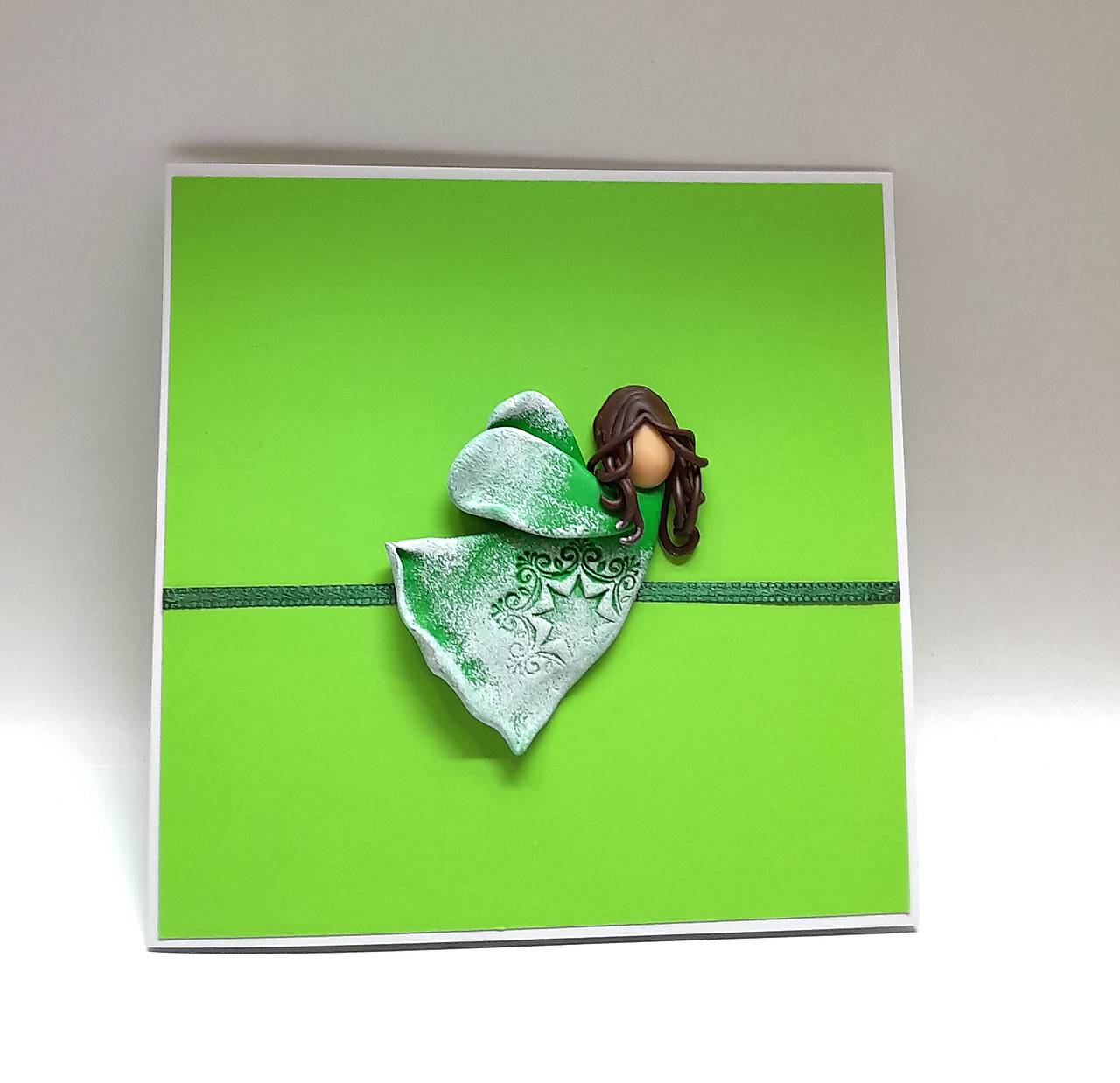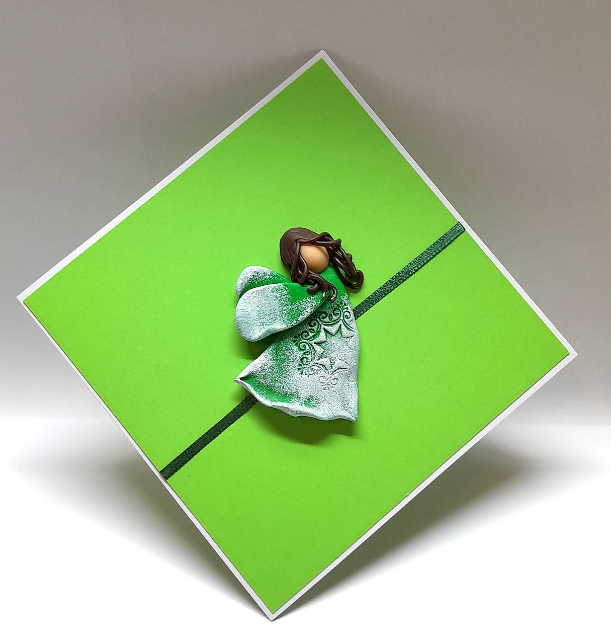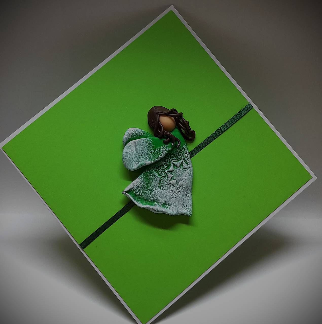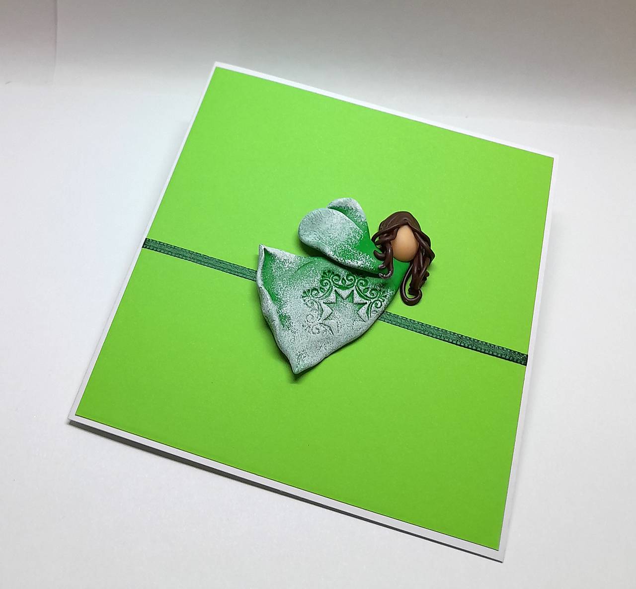 Na prednej strane pohľadnice je nalepený Anjelik - je ručne modelovaný a vytvorený z polymérovej hmoty, primaľovaný akrylovou farbou (bielou) ... prednú stranu dopĺňa aj farebne ladiaca stužka ...