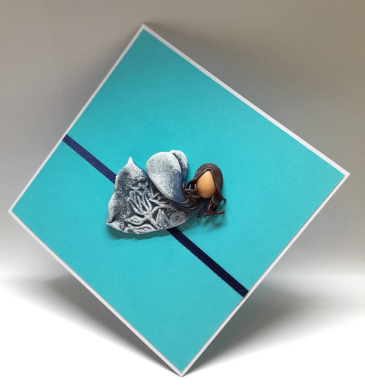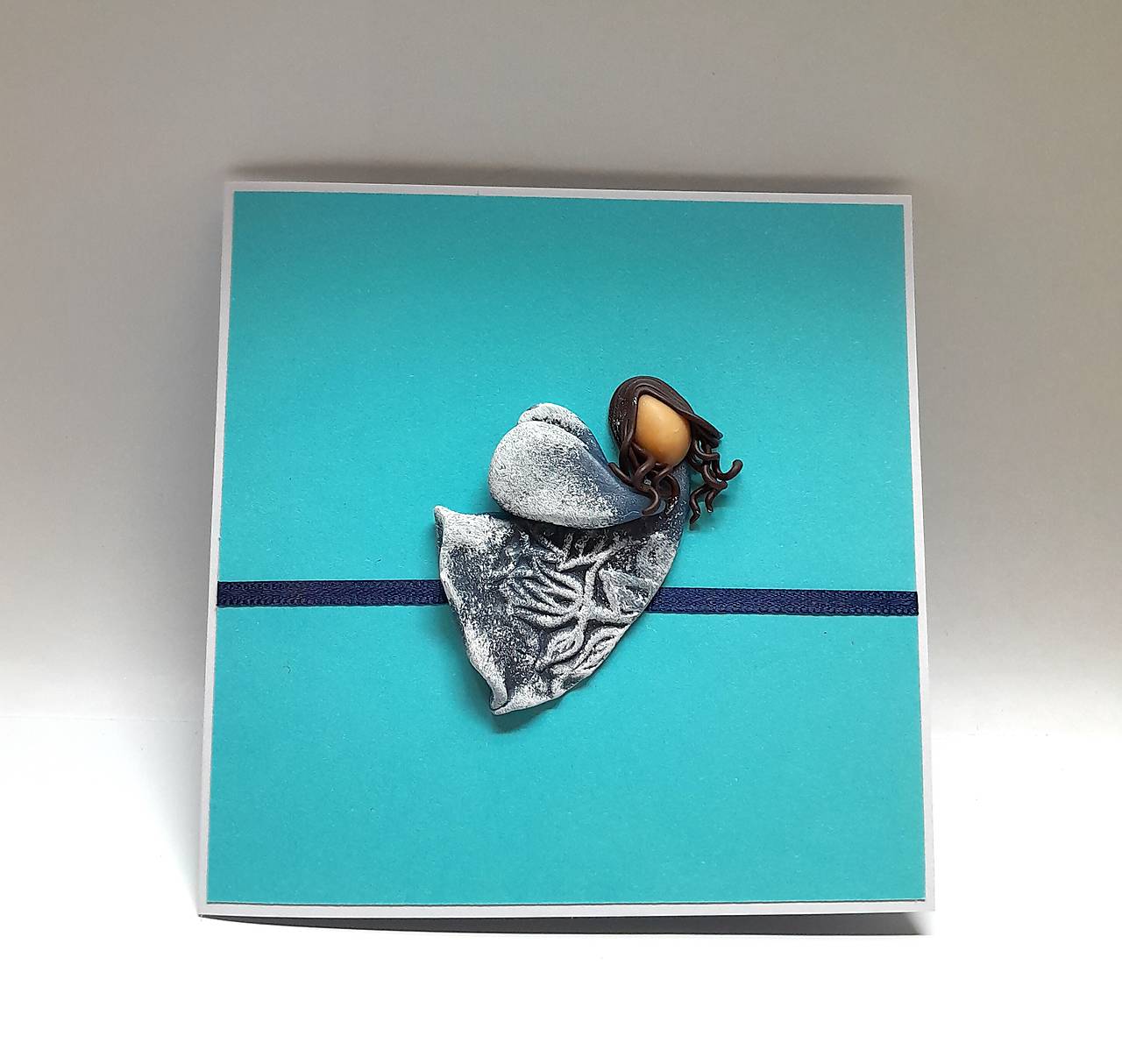 Na prednej strane pohľadnice je nalepený Anjelik - je ručne modelovaný a vytvorený z polymérovej hmoty, primaľovaný akrylovou farbou (bielou) ... prednú stranu dopĺňa aj farebne ladiaca stužka ...