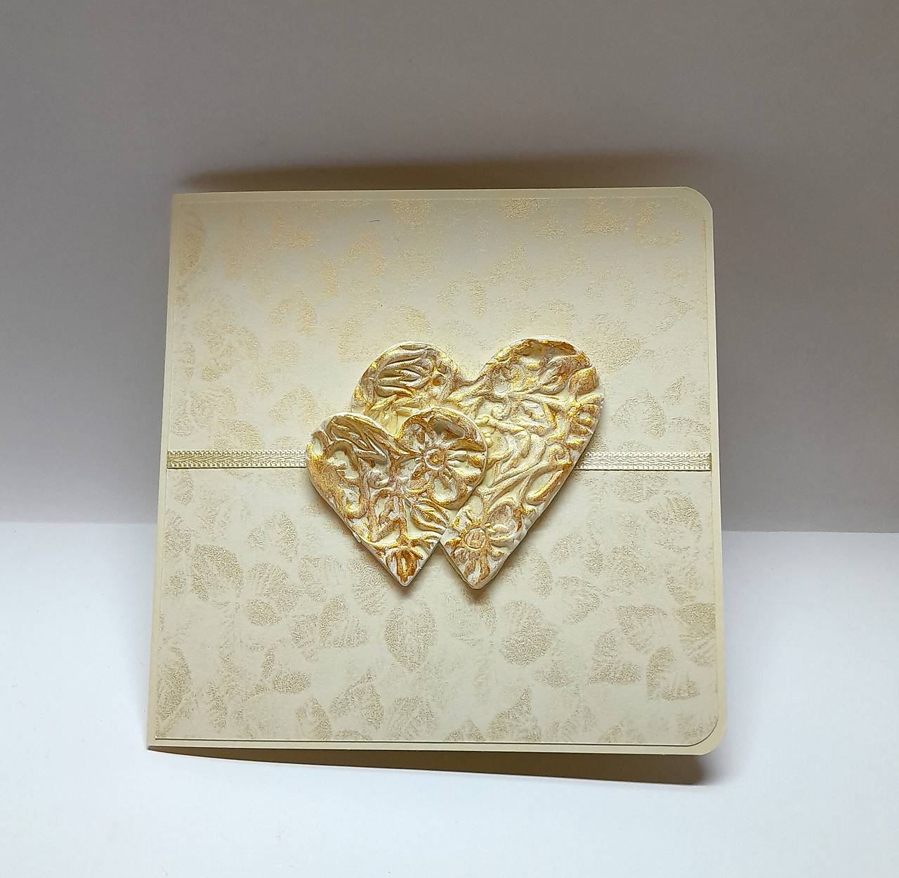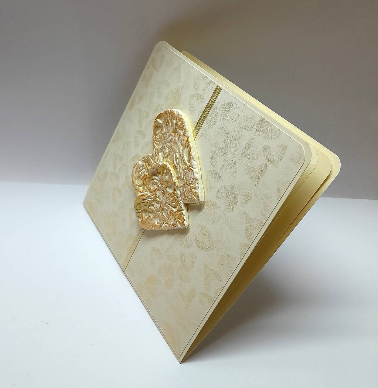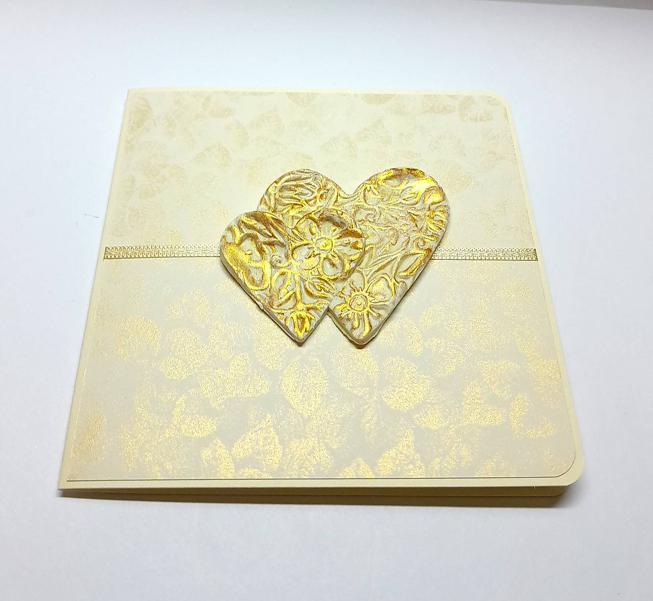 Prednú stranu pohľadnice zdobia dve srdiečka - sú ručne modelované, vytvorené z polymérovej hmoty, maľované akrylovou farbou ... pod nimi je uložená tenká maslová stužka, vo vnútri pohľadnice je na ľavej starne na rovnakej stužke upevnené kovové srdiečko, tvorí záložku na peňažný darček ...