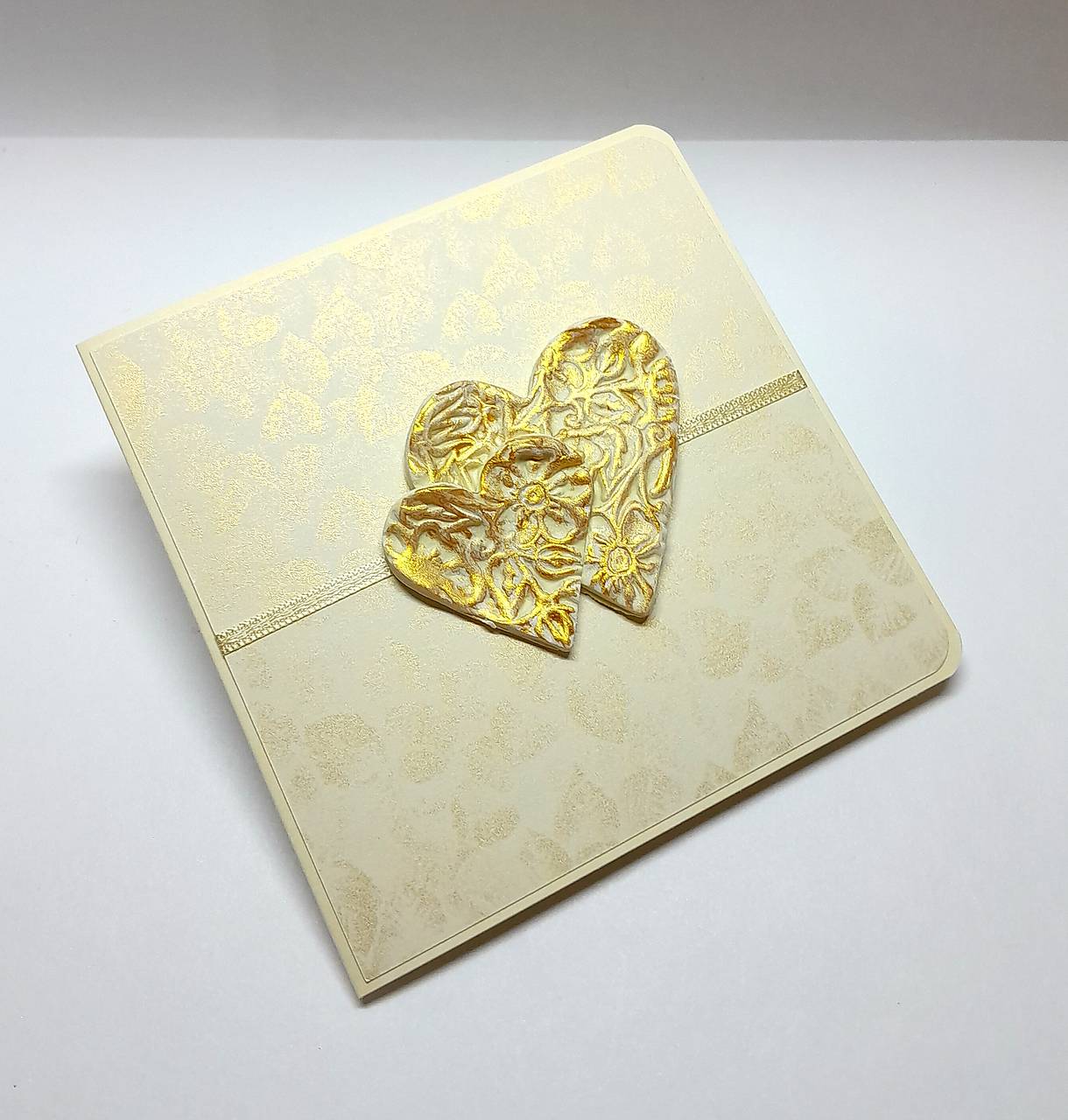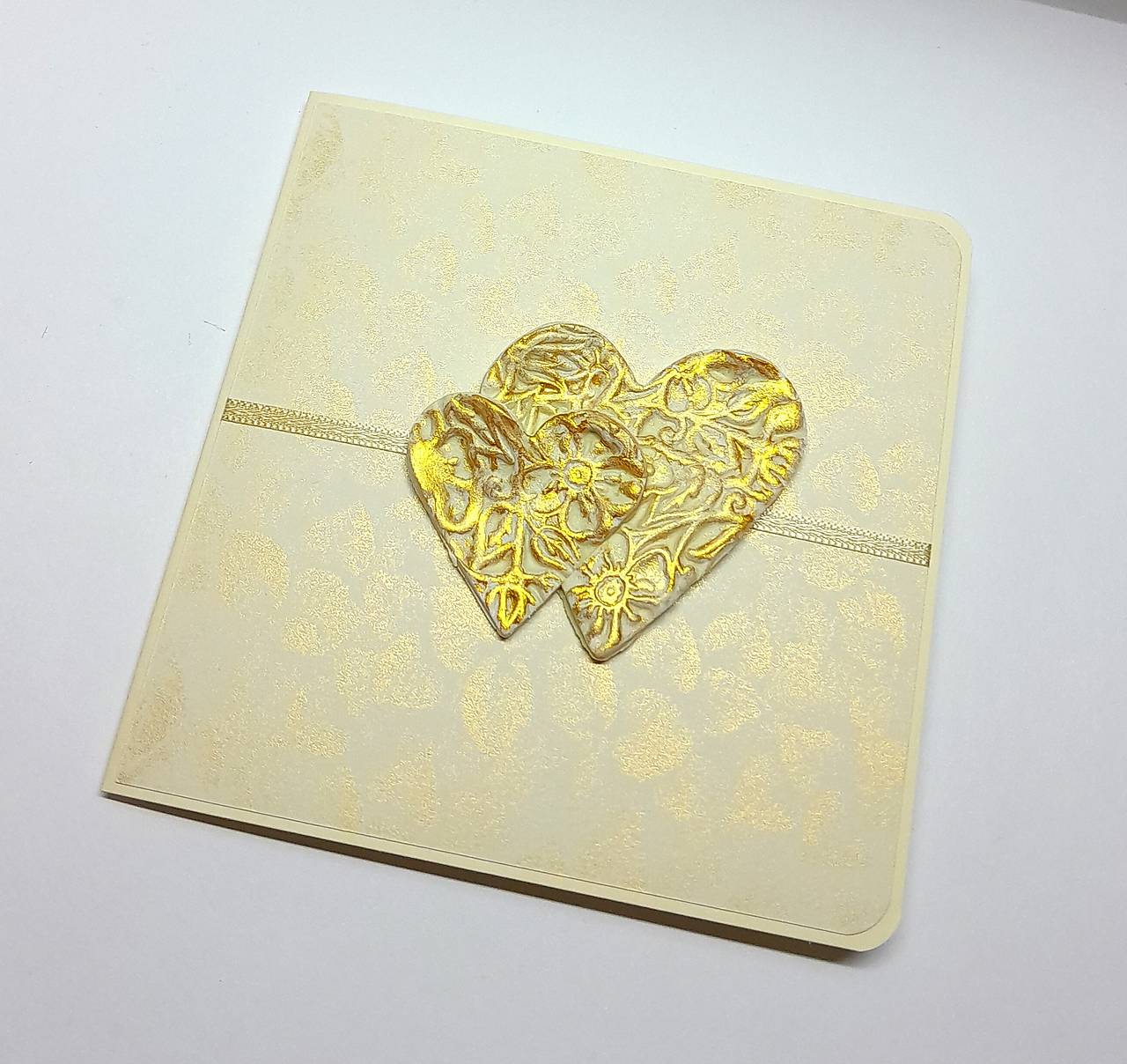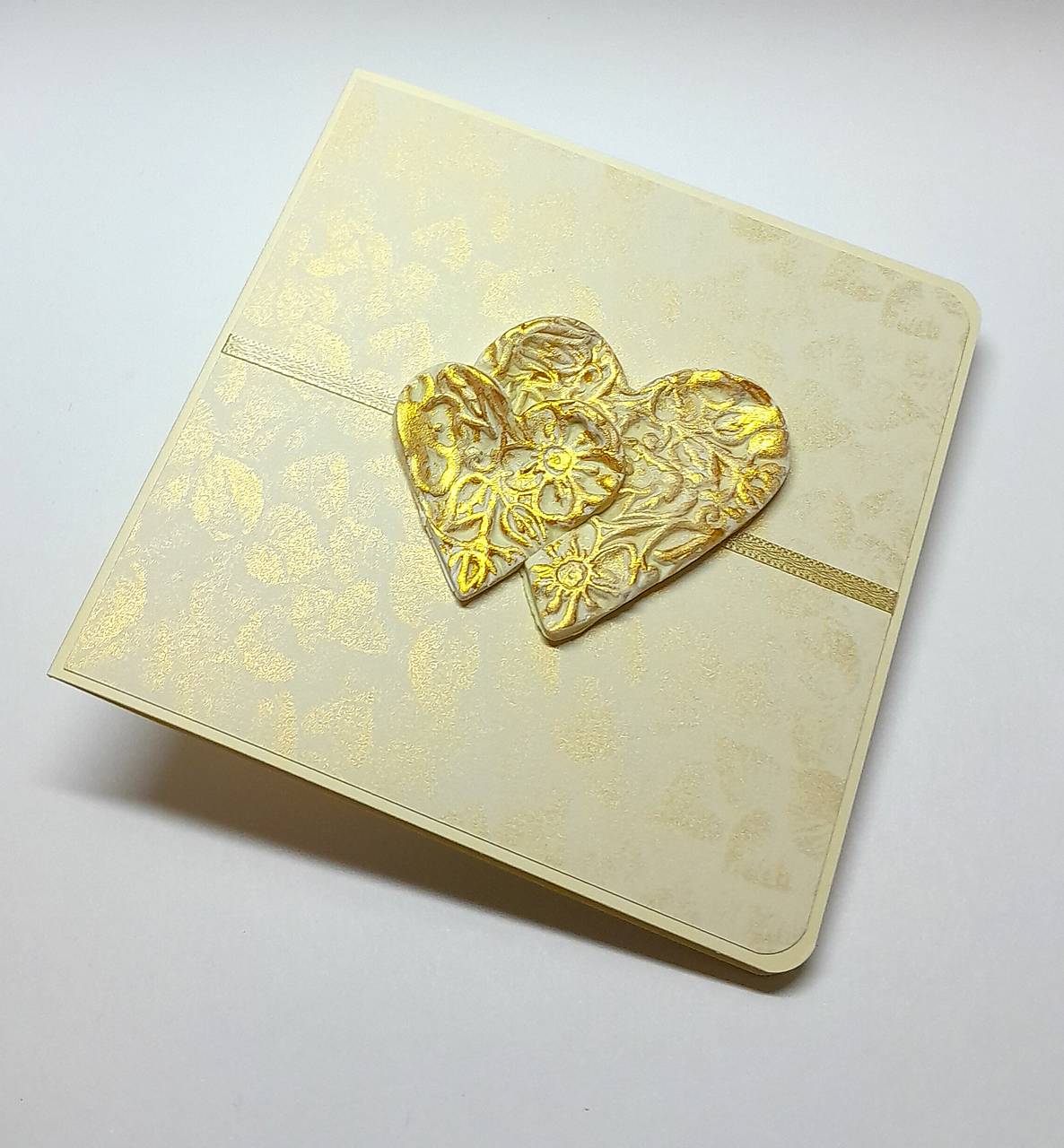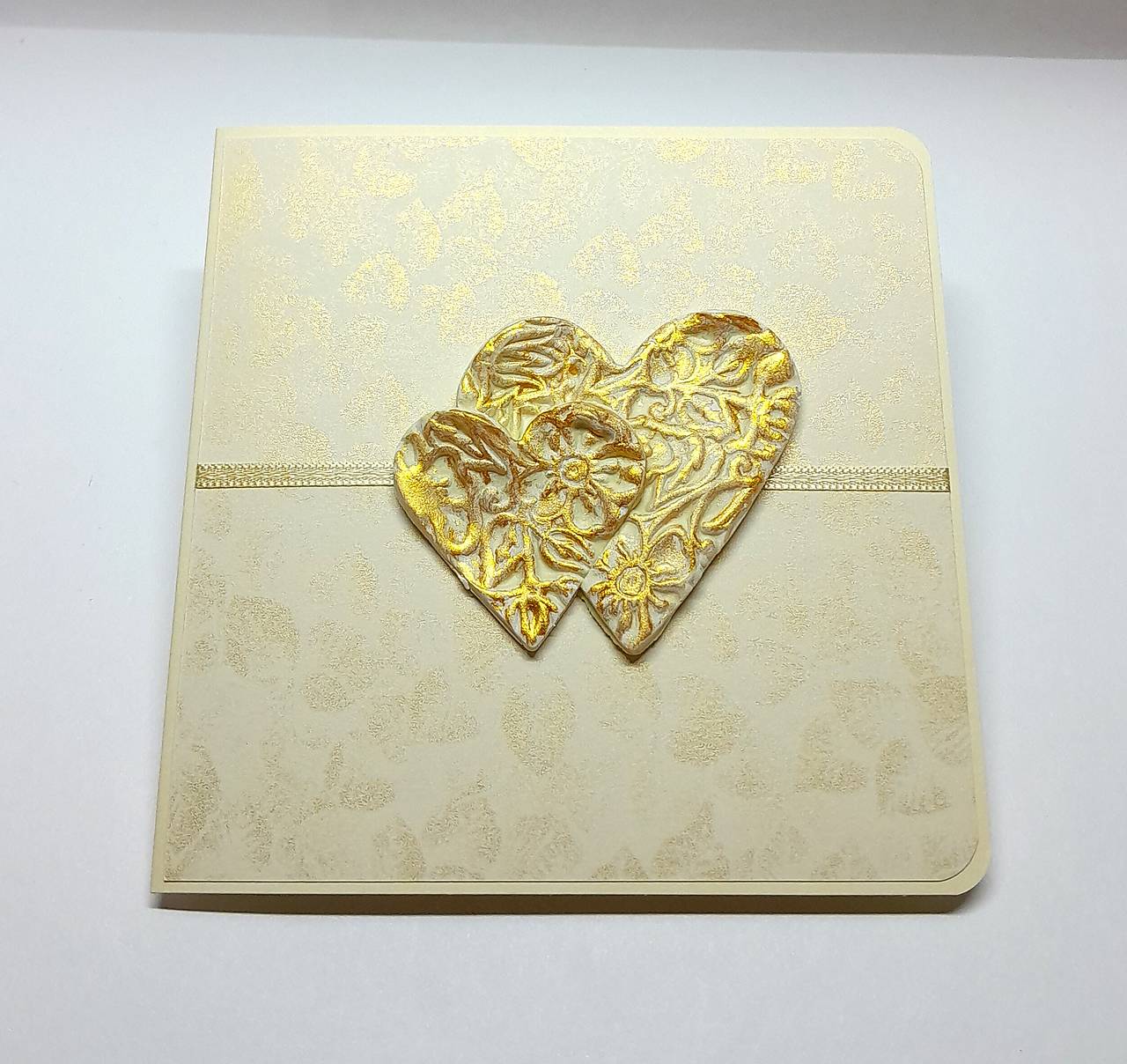 Prednú stranu pohľadnice zdobia dve srdiečka - sú ručne modelované, vytvorené z polymérovej hmoty, maľované akrylovou farbou ... pod nimi je uložená tenká maslová stužka, vo vnútri pohľadnice je na ľavej starne na rovnakej stužke upevnené kovové srdiečko, tvorí záložku na peňažný darček ...