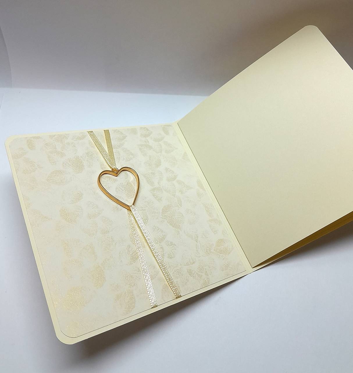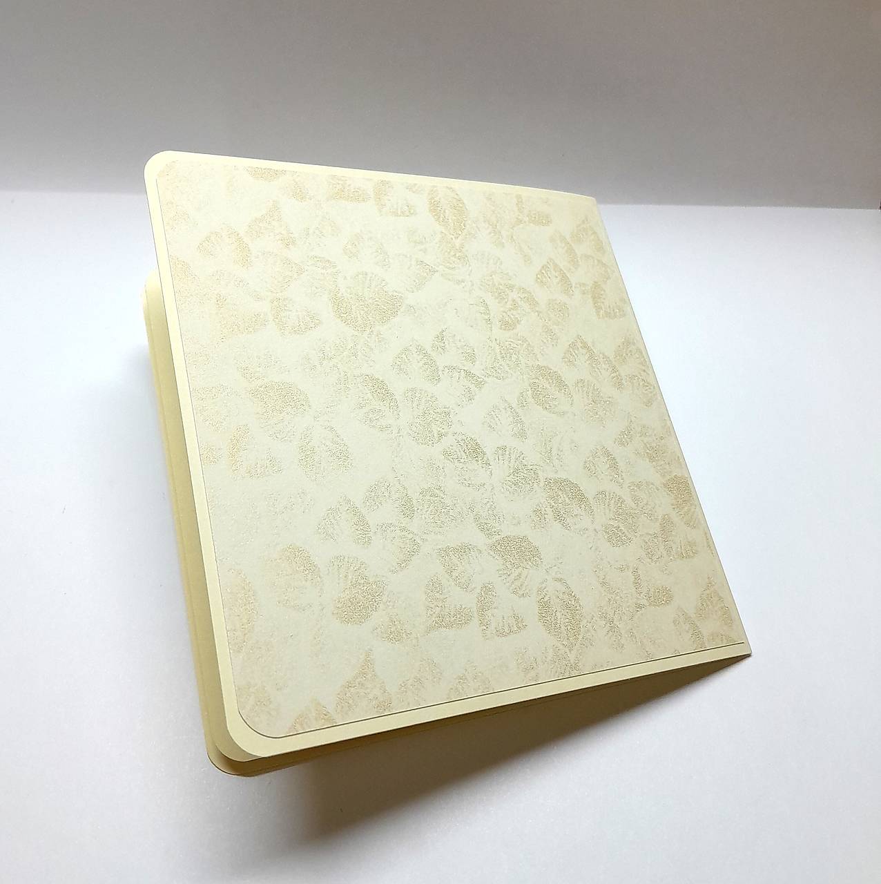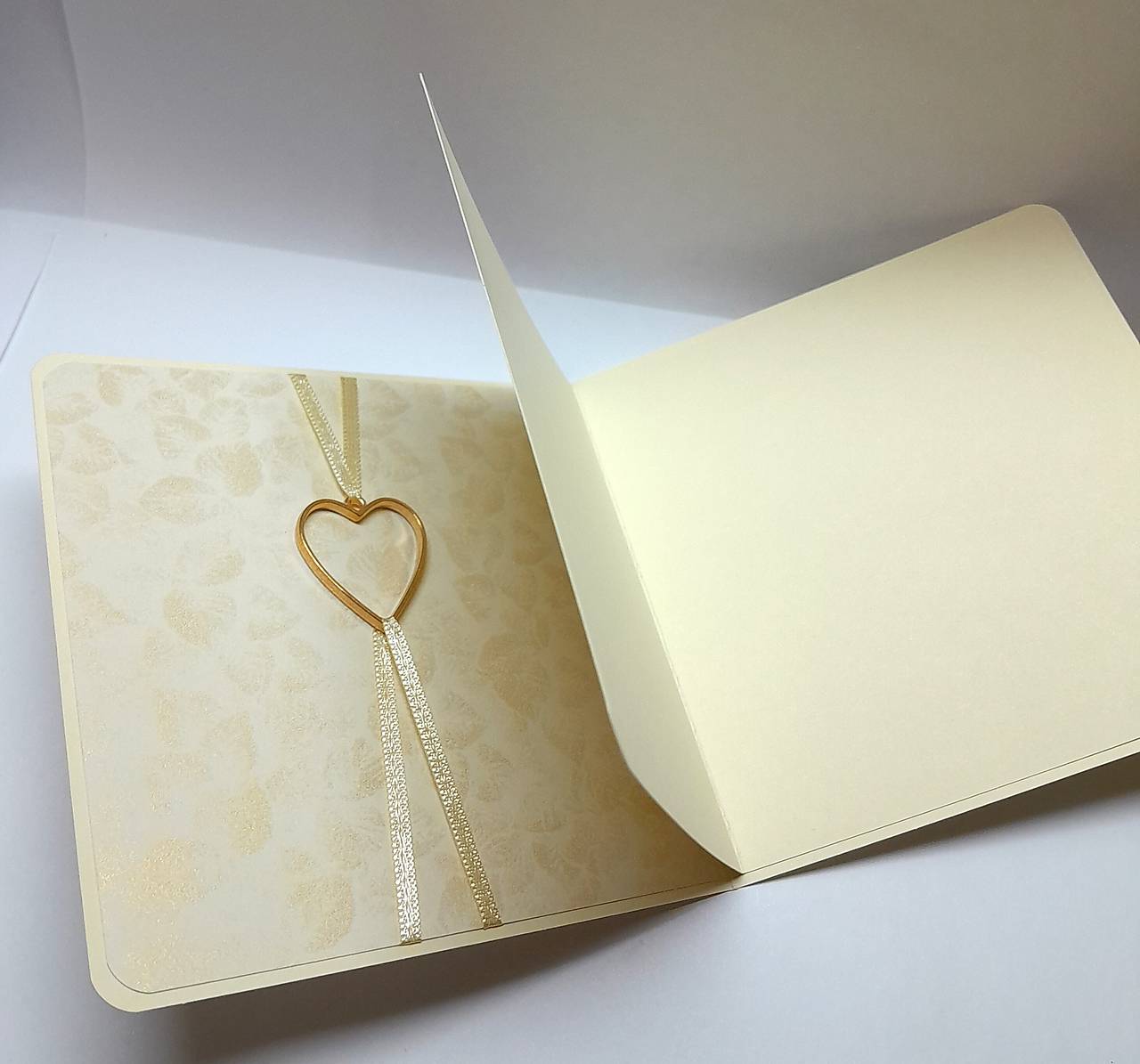 Pohľadnica / blahoželanie má základ jemnej maslovej farby rozmerov 13,5 x 13,5 cm, je otváracia, vo vnútri bez textu. Pohľadnicu zdobia a spevňujú dizajnové papiere podľa fotografií na prednej, zadnej i vnútornej strane pohľadnice ( maslovozlatavé so vzorom lístkov tón v tóne ), vo vnútri na pravej strane je nalepený papier na napísanie priania / blahoželania ...