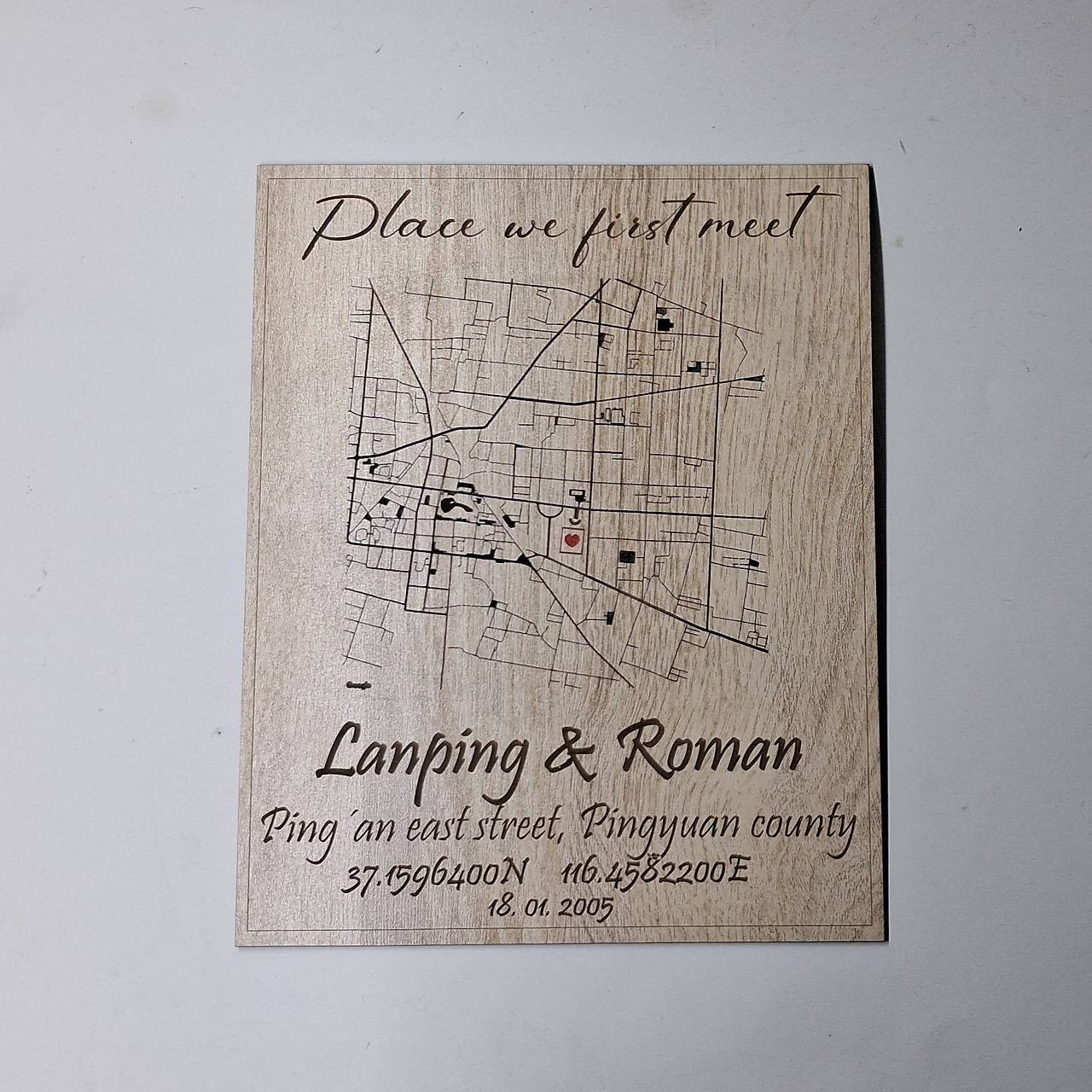 Tabuľa na zavesenie s popisom prvého stretnutia, vygravírovanou mapkou a červeným srdiečkom označujúce presné miesto prvého stretnutia. Ďalej koordináty, poprípade popisu miesta alebo adresa. Tabuľka je vhodná či už na zavesenie alebo postavenie do poličky. Tiež je možné dodať pätky na postavenie. Ideálny darček k výročiu svadby, k Valentínovi a pod.