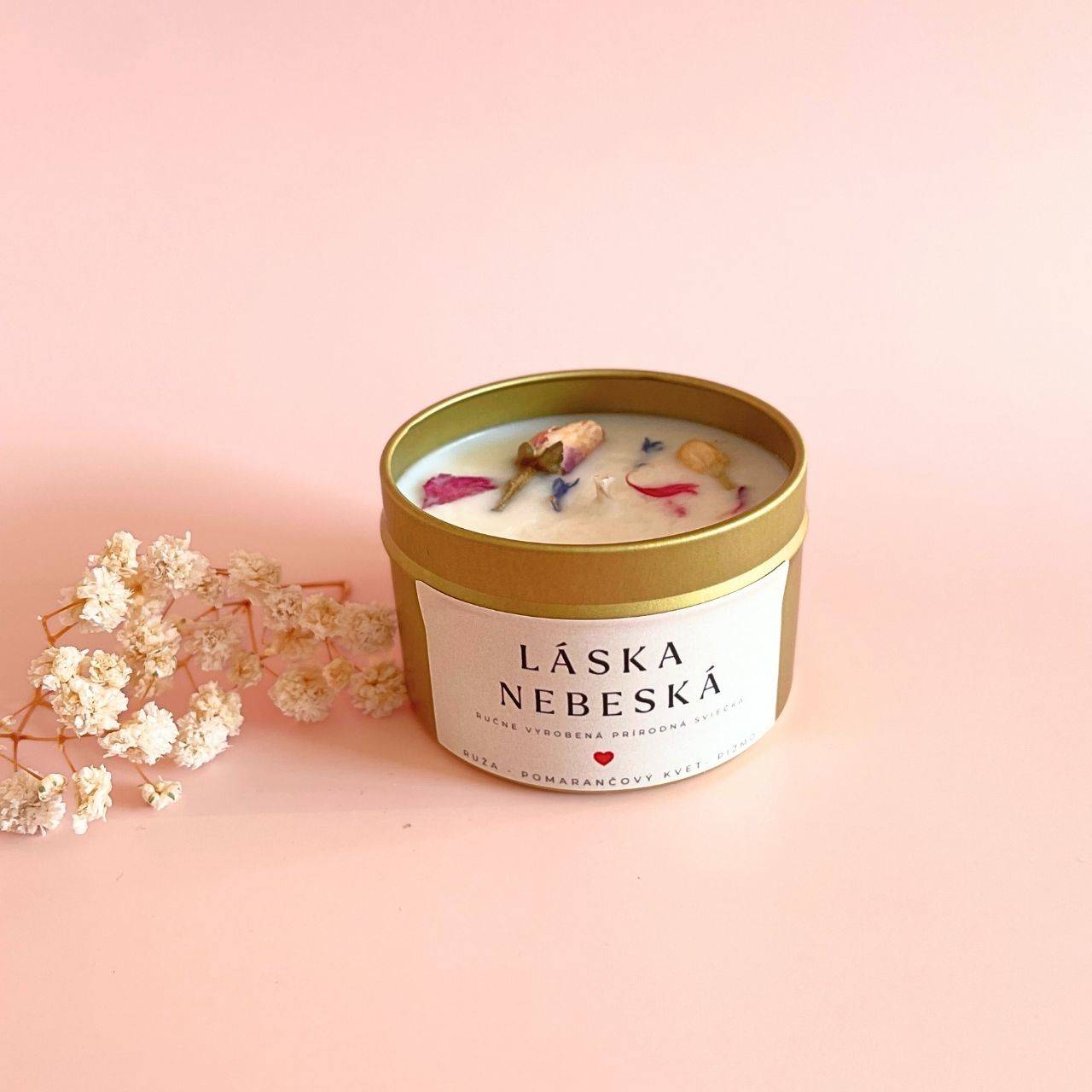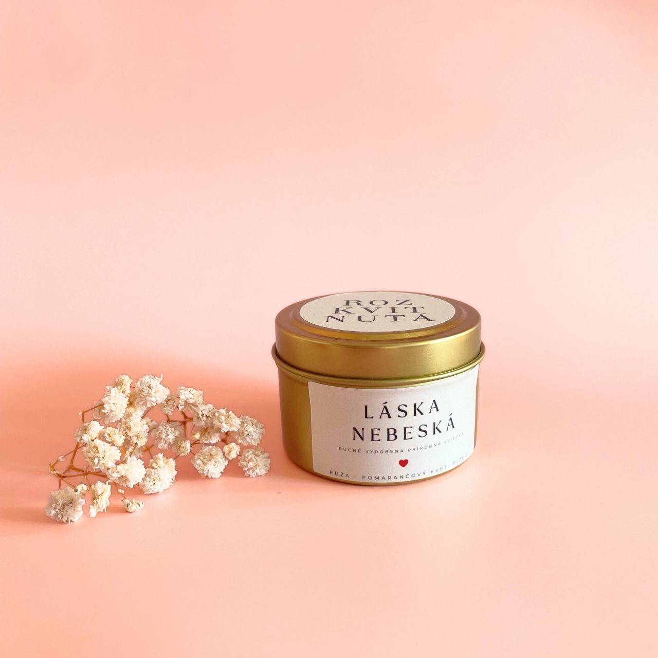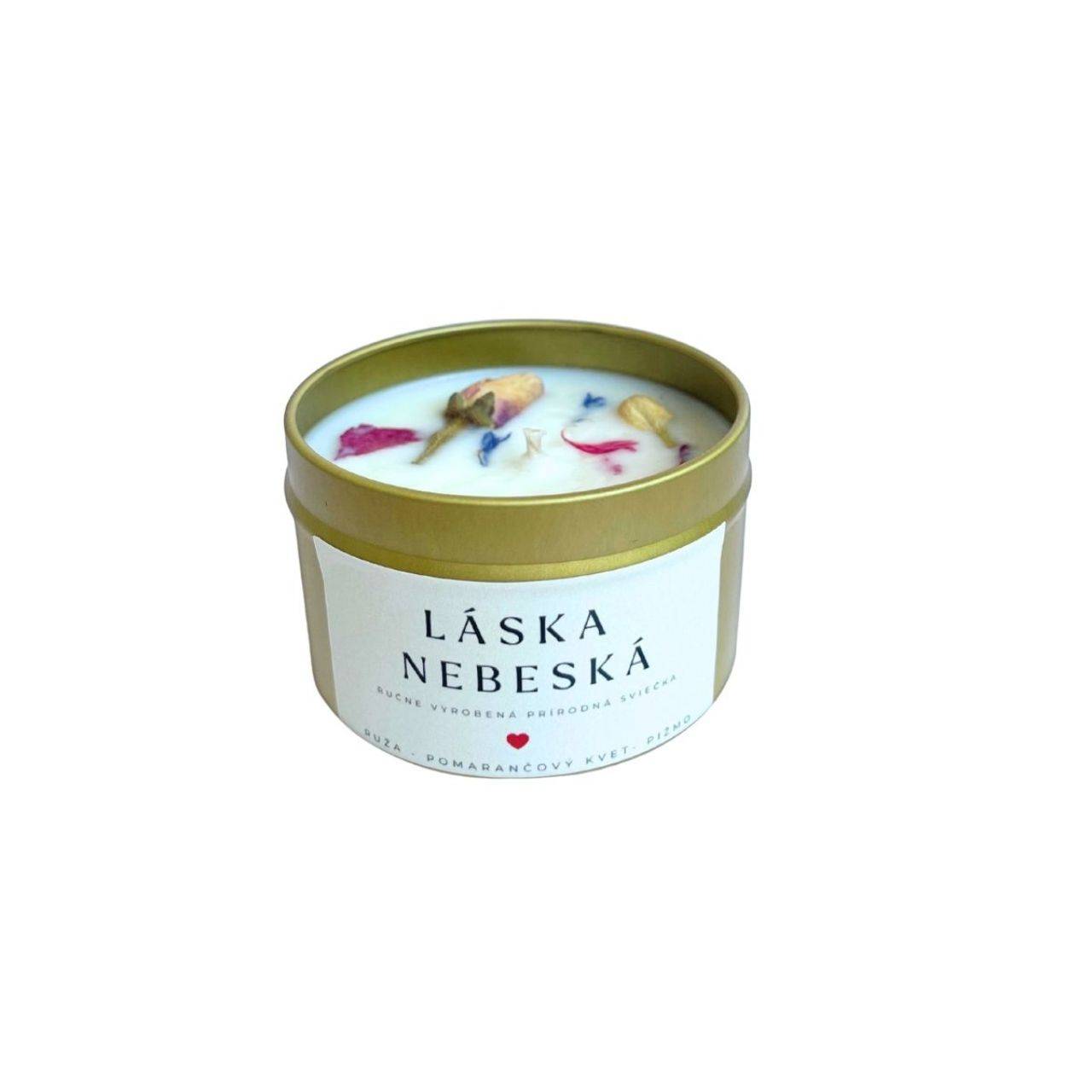 Láska nebeská je romantická sójová sviečka vytvorená ako súčasť valentínskej kolekcie. Zmyselná kombinácia ruže, pomarančového kvetu a bieleho pižma symbolizuje nehu, lásku a spojenie dvoch duší.