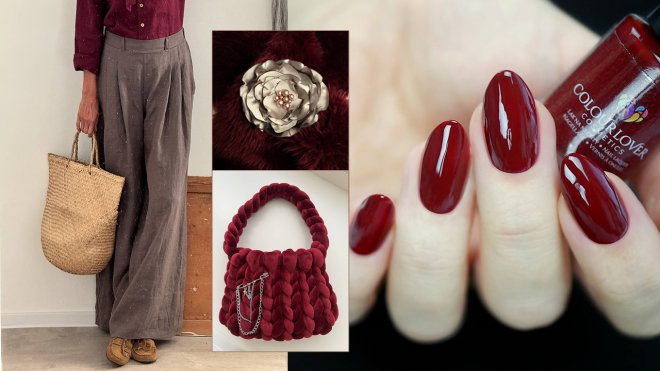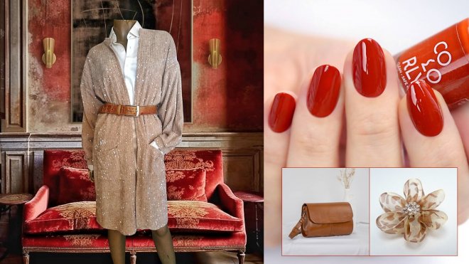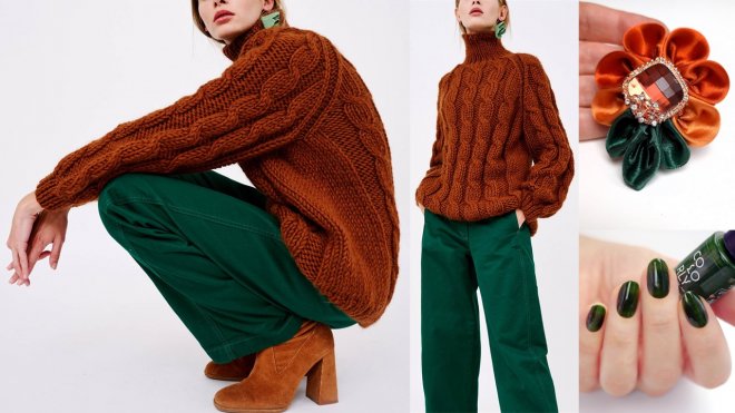 hnedý lak na nechty, hnedá brošňa, sveter, nohavice, taupe brošňa, kabelka, bordový lak na nechty