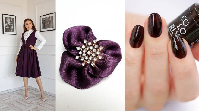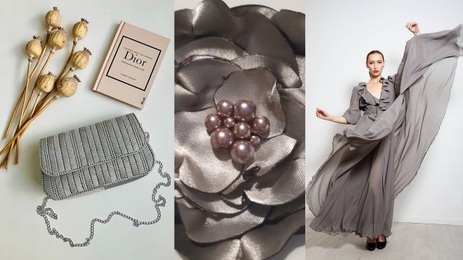 kabelka, taupe brošňa, sivé spoločenské šaty, vestové šaty, fialová brošňa, lak na nechty