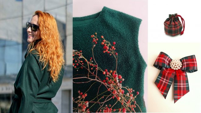 zelený kabátik, bucle vesta, vianočný mešec, vianočná mašľová brošňa. šaty, červená brošňa, kabátik