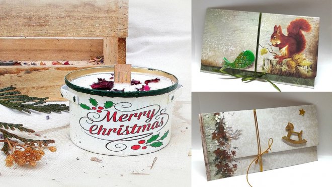 vianočná sviečka, vianočná obálka so zlatou rybkou, vianočná obálka s koníkom