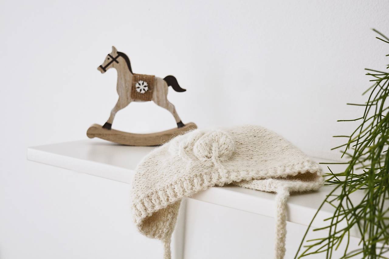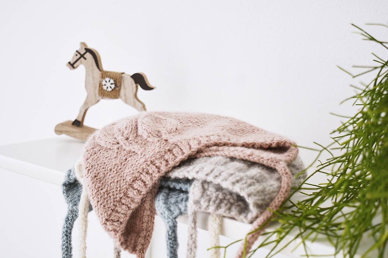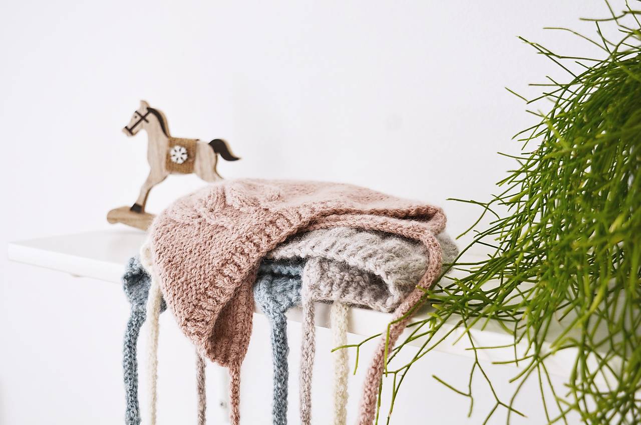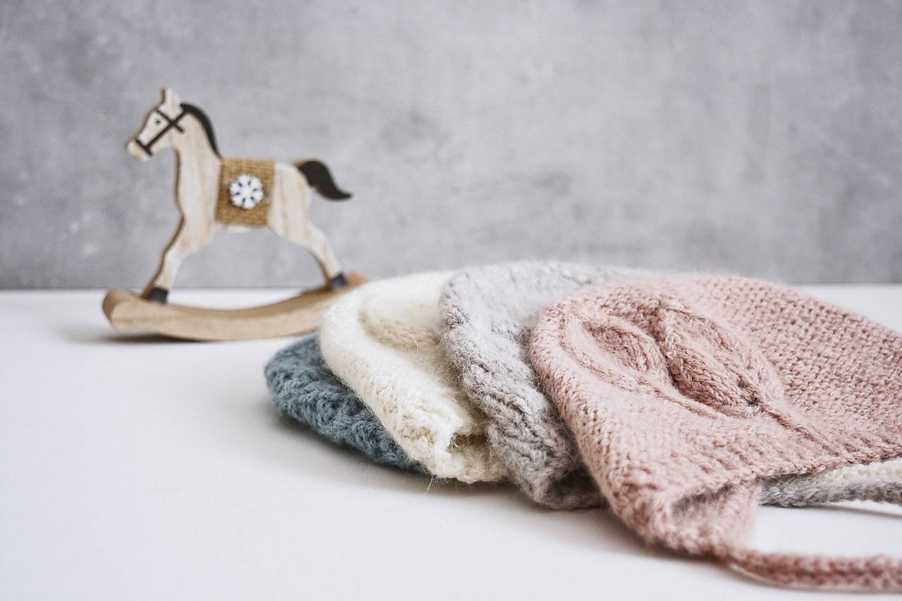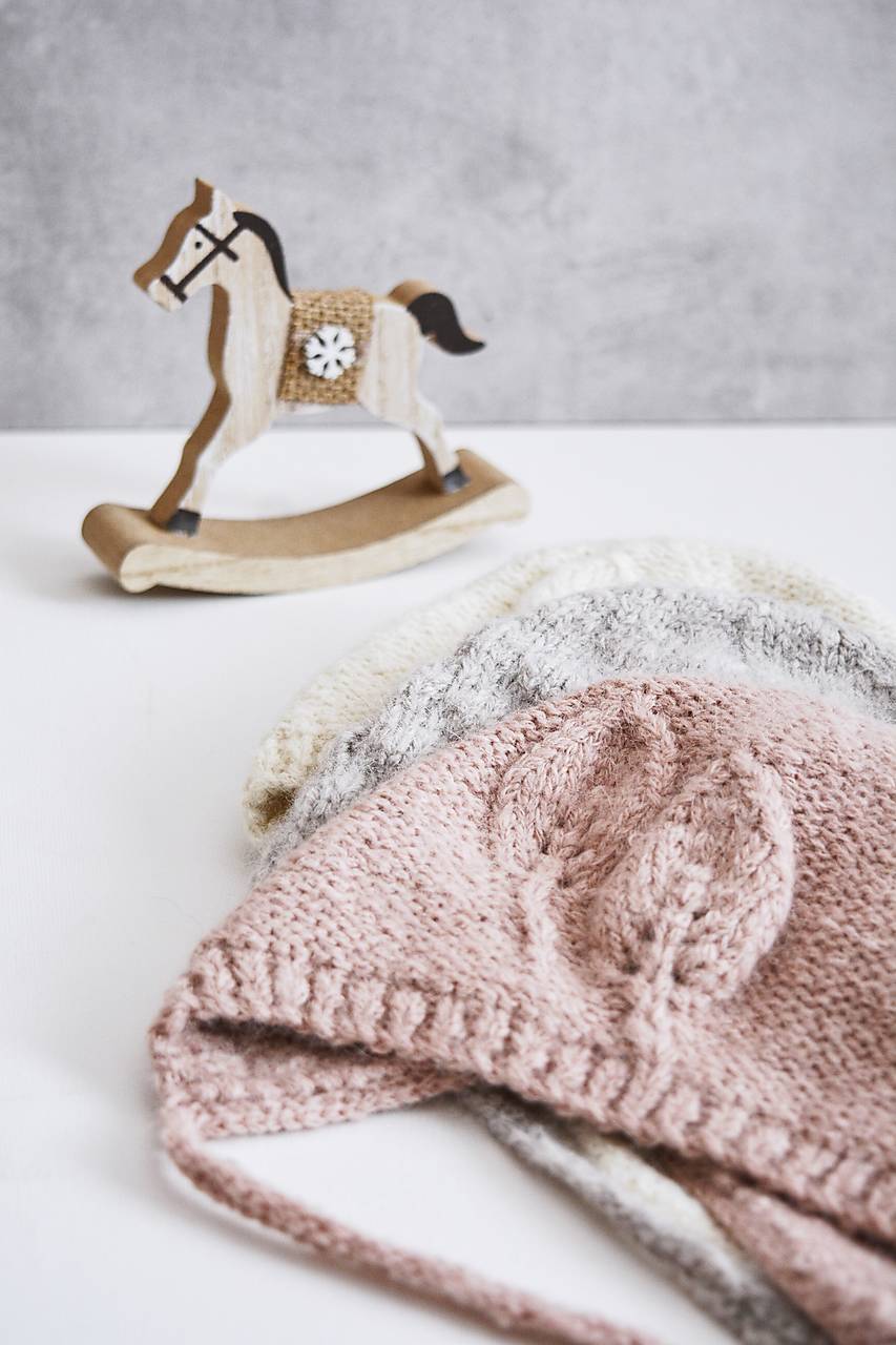 Ručne pletená (bez zošívania) hebká čiapočka pre bábätko/novorodenca so vzorom lístkov, guľôčok alebo štvorčekov.