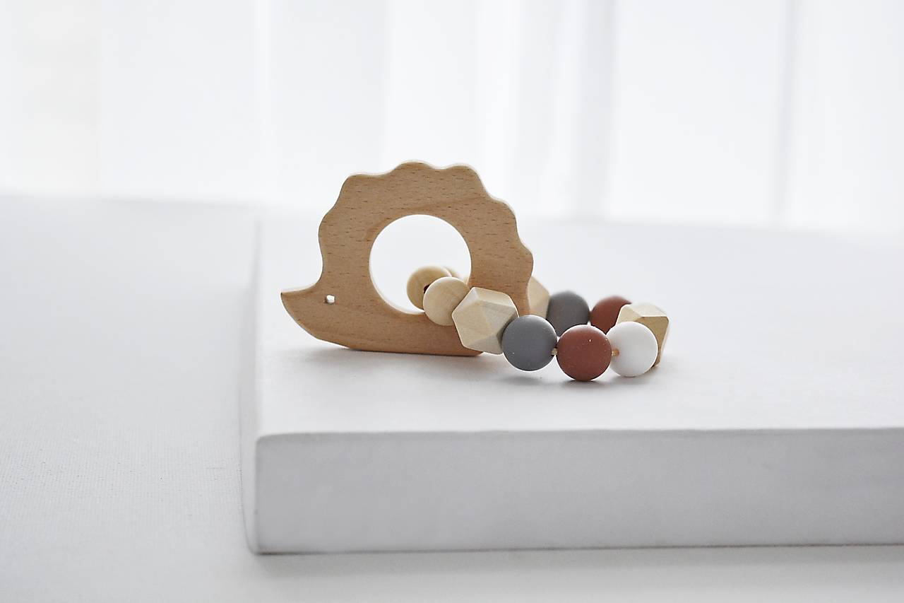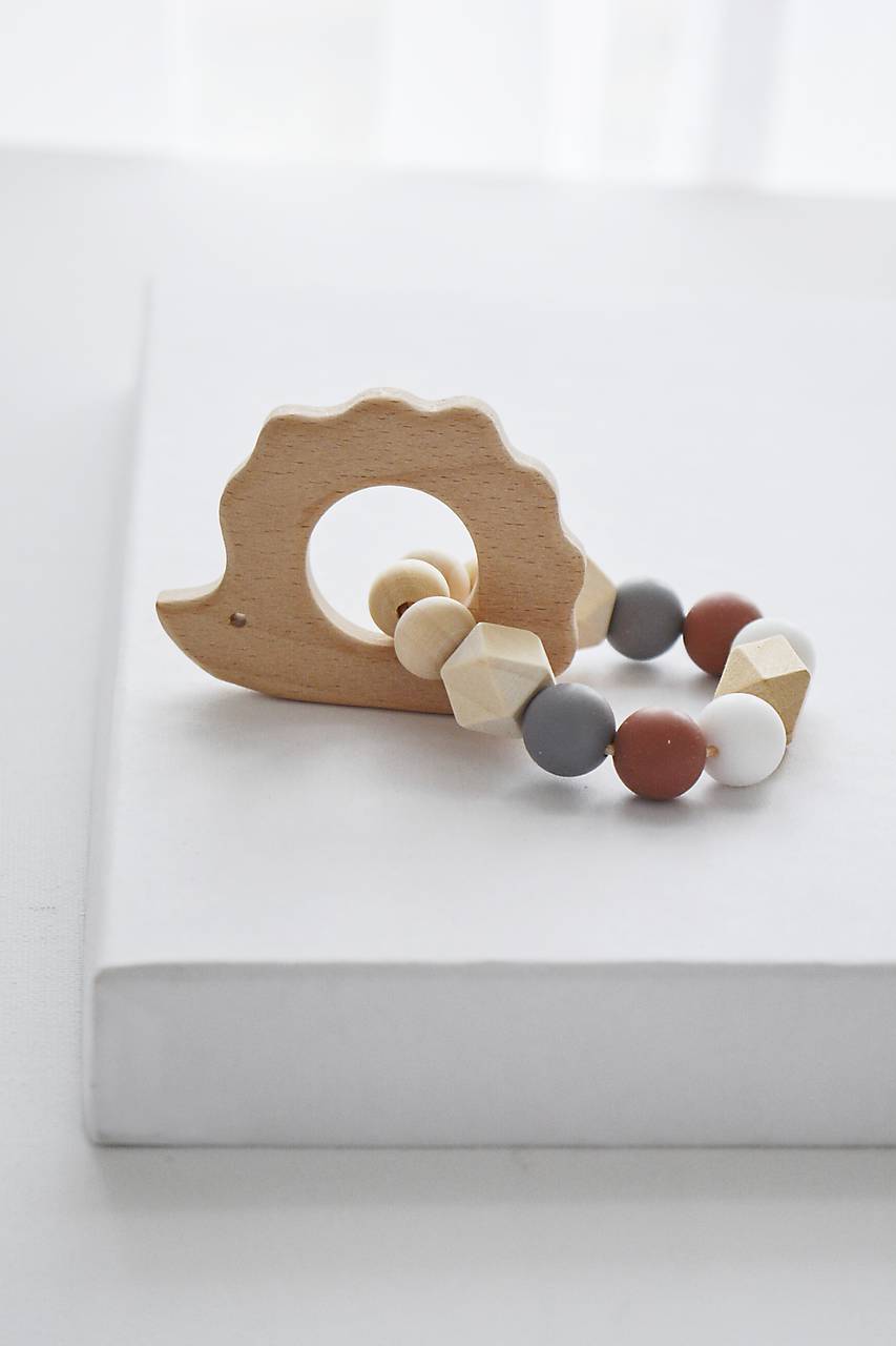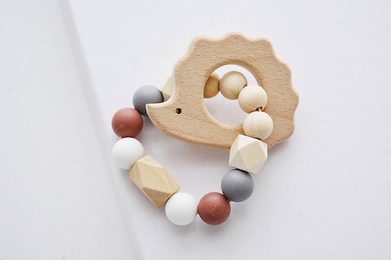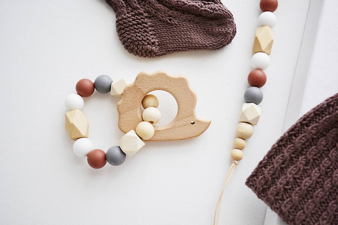 Detské hryzadielko s motívom ježka v prírodnej, bielej a hnedej farbe, vyrobené z drevených a certifikovaných silikónových korálikov s jemnou ale pevnou polyesterovou šnúrkou.