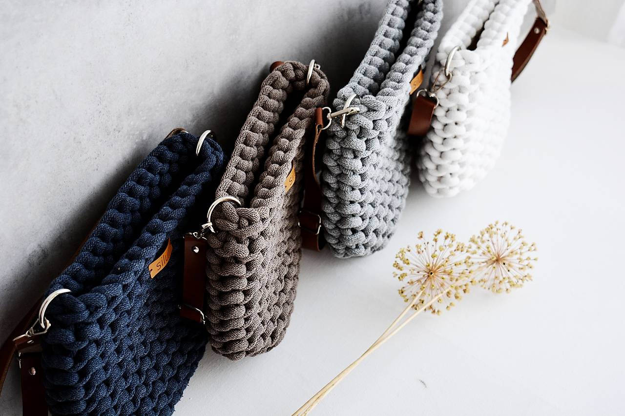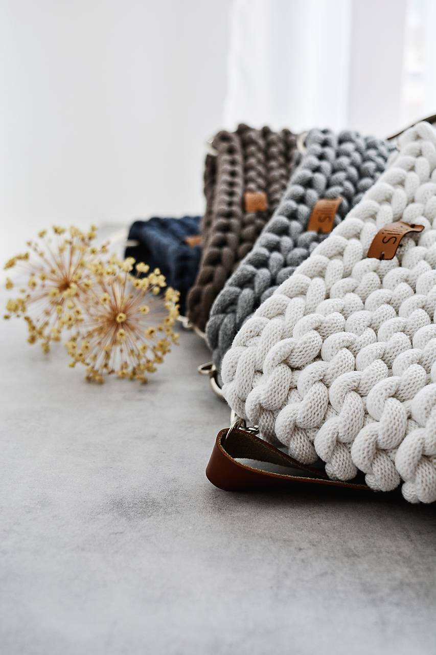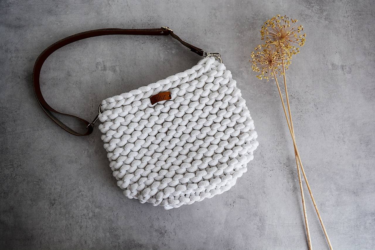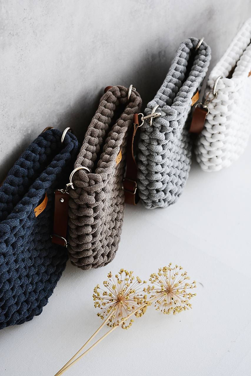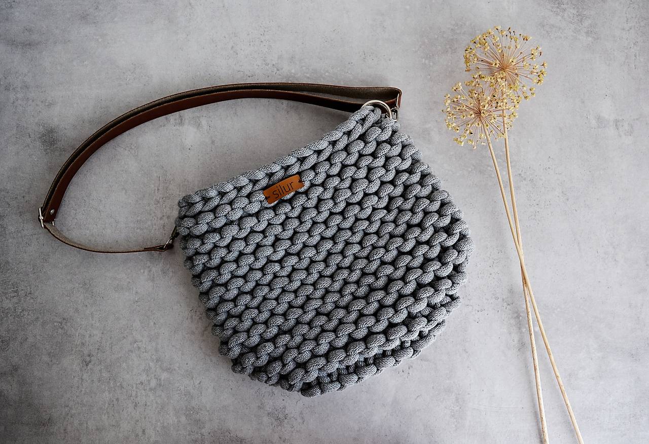 Ručne pletená kabelka s koženými remienkami v štyroch farbách. Materiál: hrubý 9 mm špagát. V prípade znečistenia sa obráťte na špeciálne čistiarne.