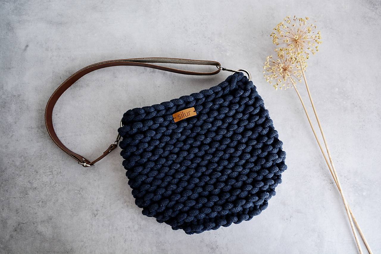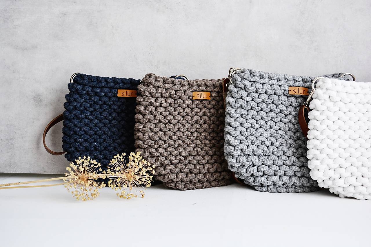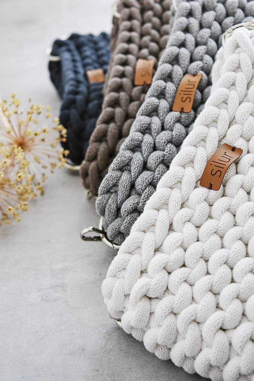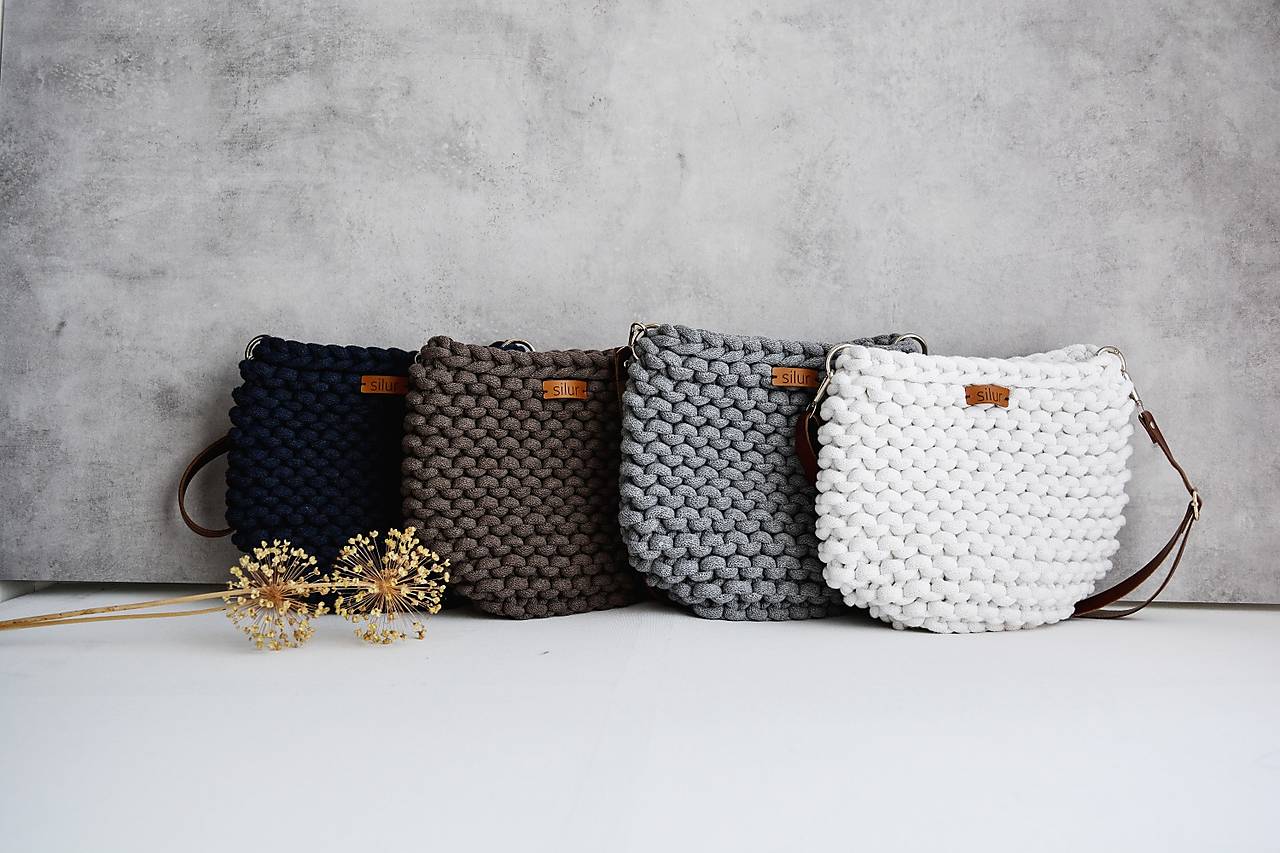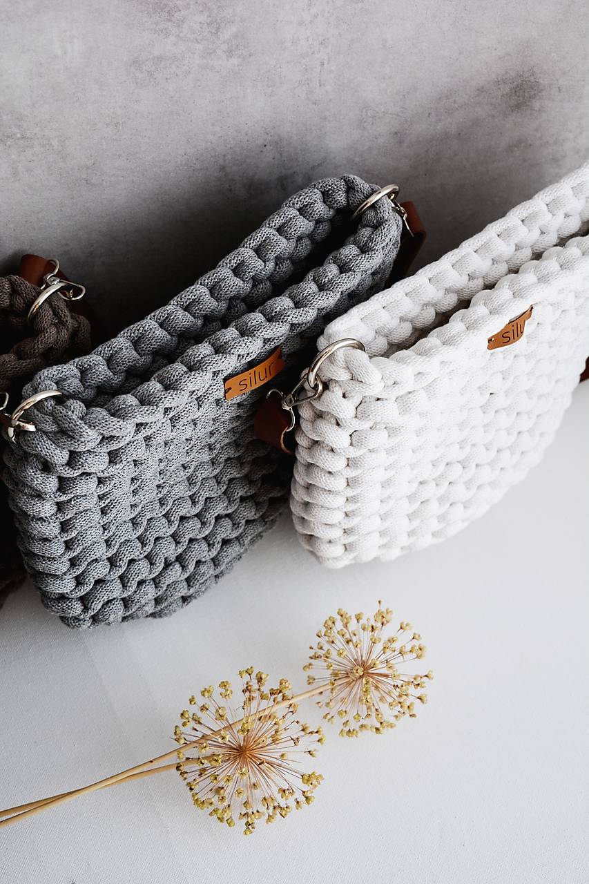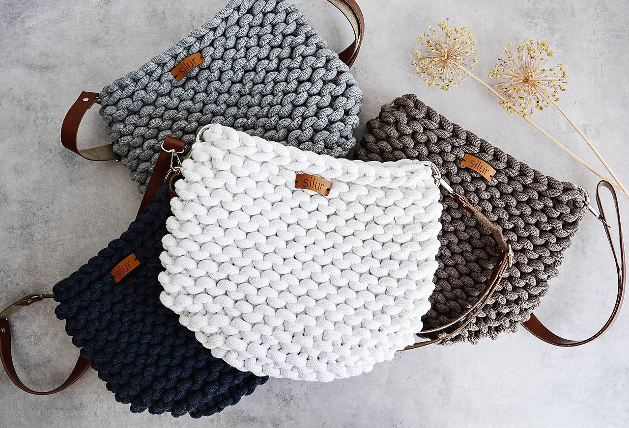 Ručne pletená kabelka s koženými remienkami v štyroch farbách. Materiál: hrubý 9 mm špagát. V prípade znečistenia sa obráťte na špeciálne čistiarne.