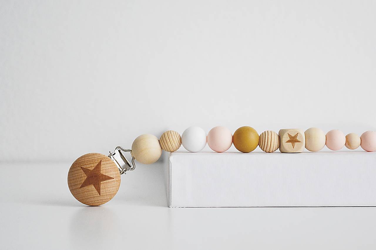 Retiazka na cumlík s klipom v tvare guľôčky s hviezdičkou v prírodnej a ružovej farbe, vyrobená z drevených a certifikovaných silikónových korálikov s jemnou ale pevnou polyesterovou šnúrkou.