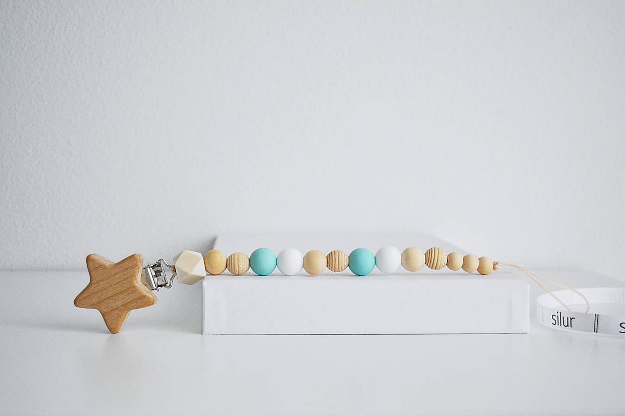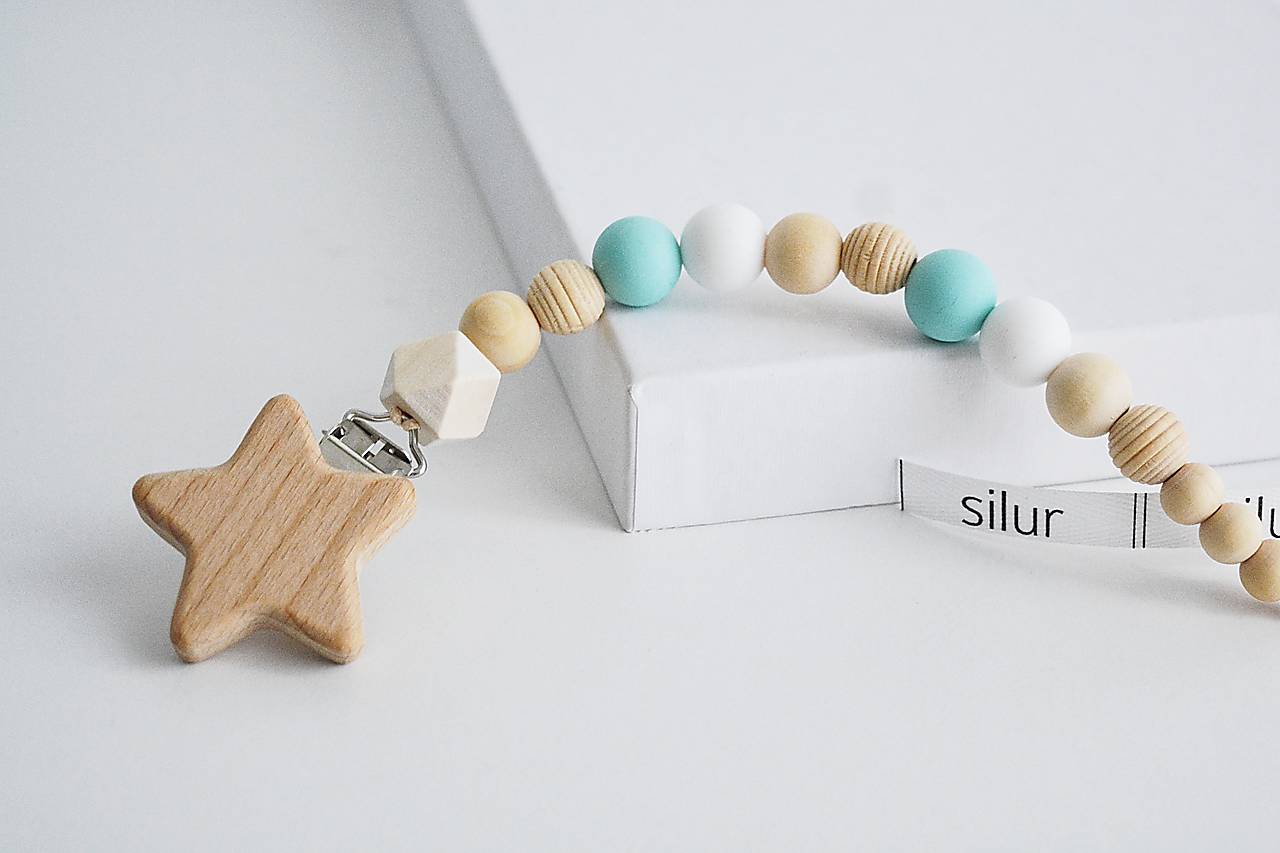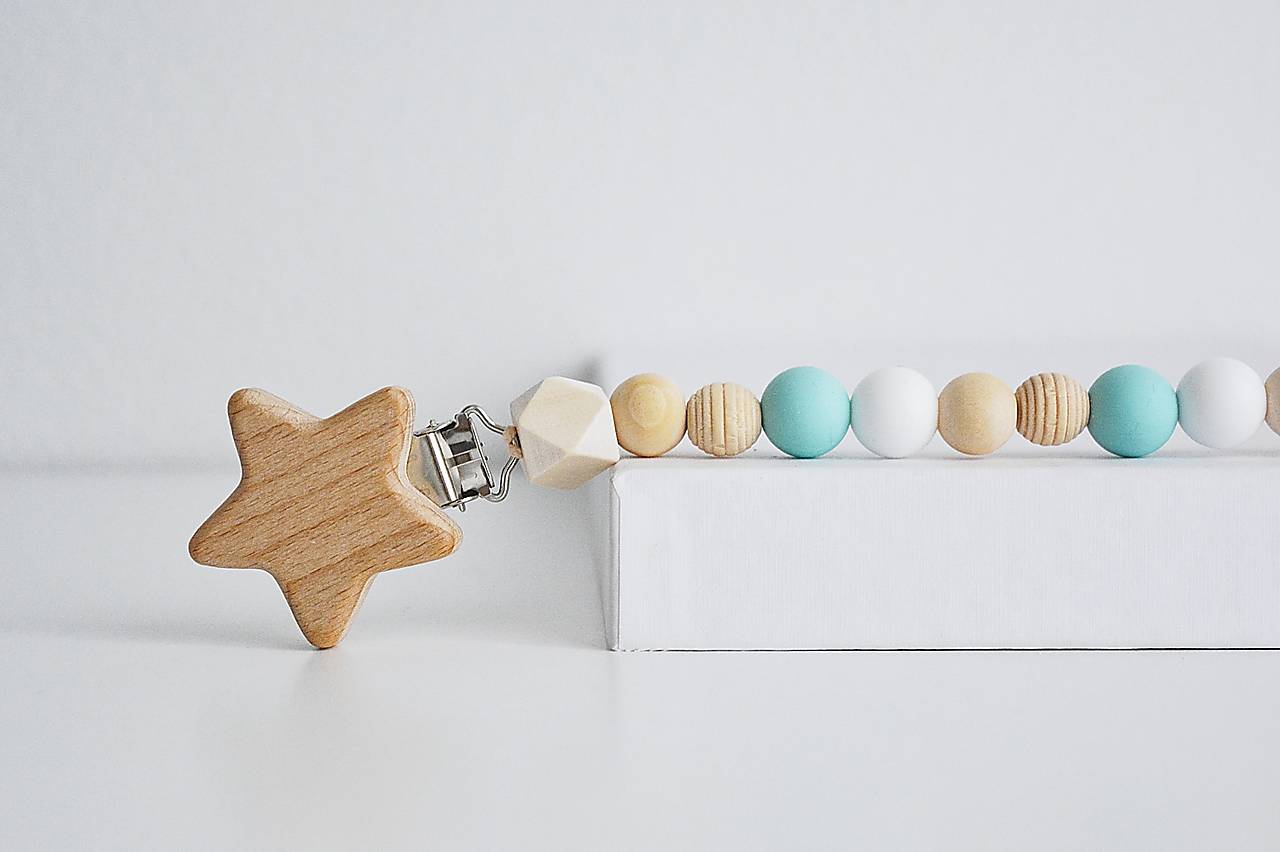 Retiazka na cumlík s klipom v tvare hviezdičky v prírodnej a tyrkysovej farbe, vyrobená z drevených a certifikovaných silikónových korálikov s jemnou ale pevnou polyesterovou šnúrkou.