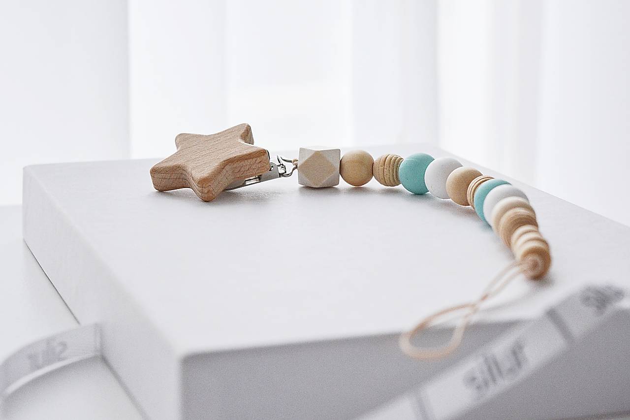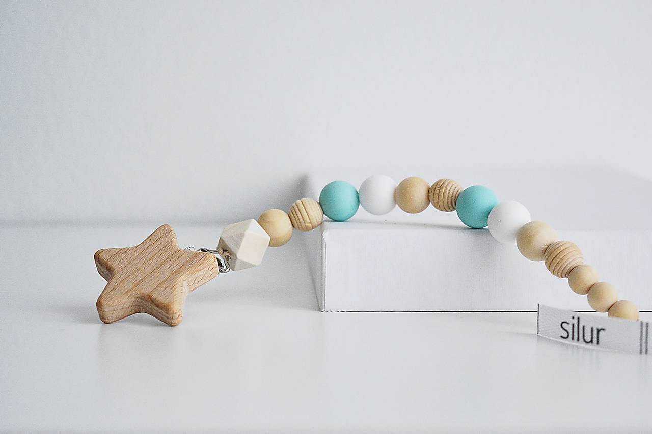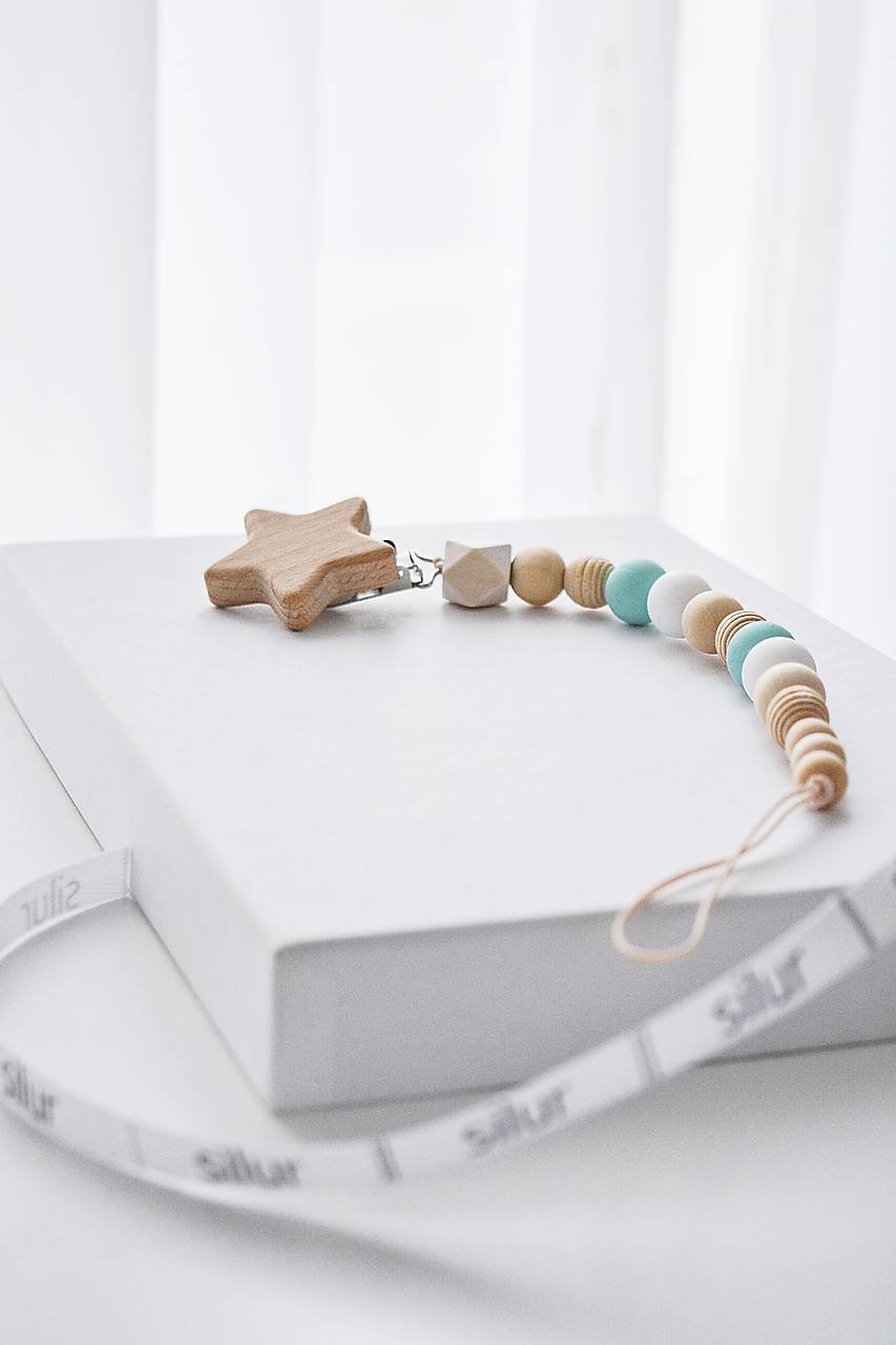 Retiazka na cumlík s klipom v tvare hviezdičky v prírodnej a tyrkysovej farbe, vyrobená z drevených a certifikovaných silikónových korálikov s jemnou ale pevnou polyesterovou šnúrkou.