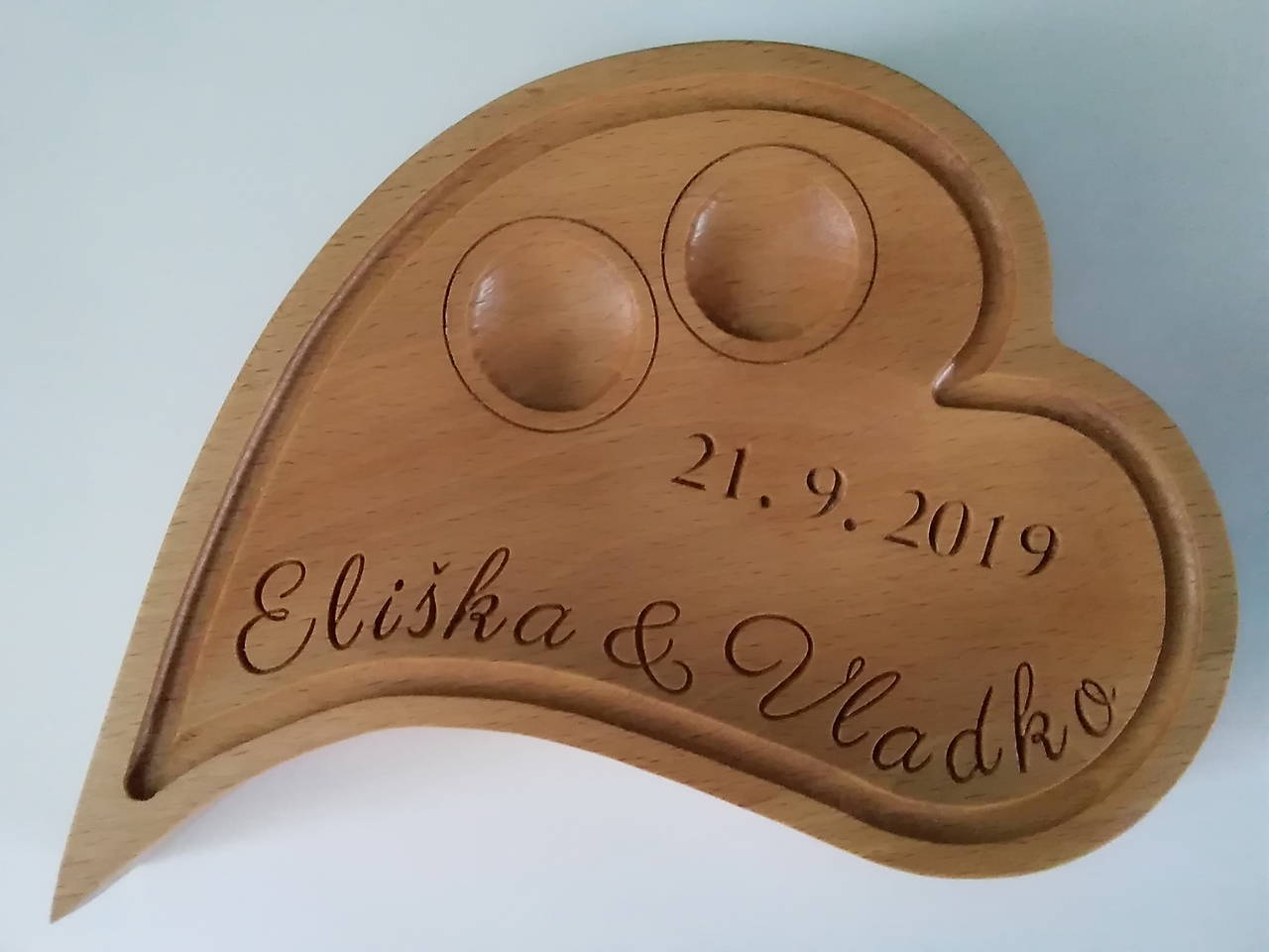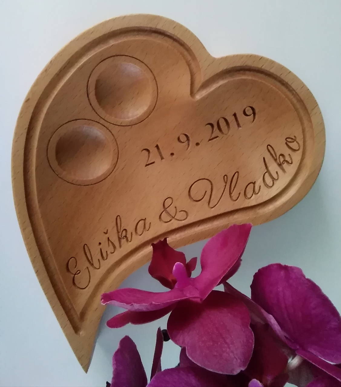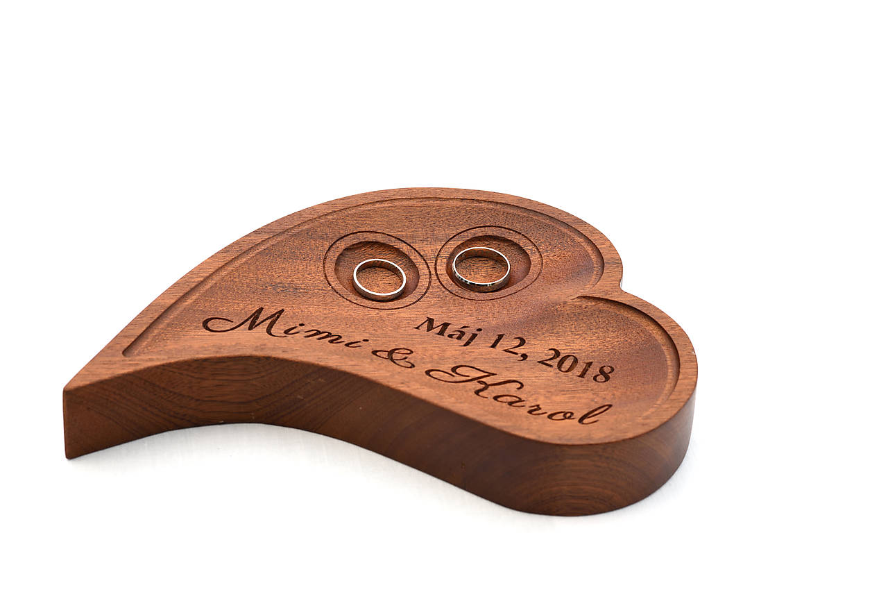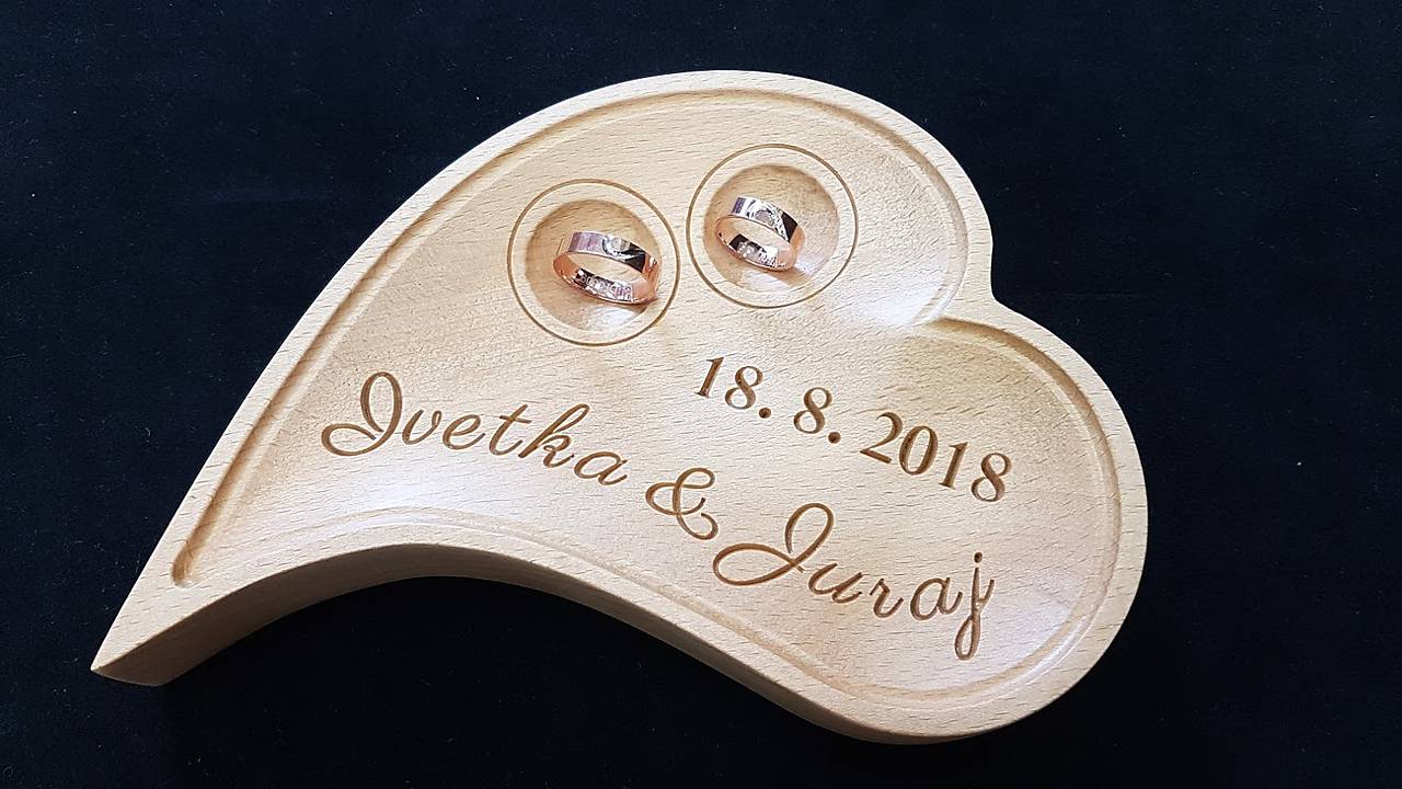 Srdiečko môžeme vyrobiť z bukového, dubového, orechového, čerešňového dreva s menami a dátumom svadobného dňa na požiadanie.