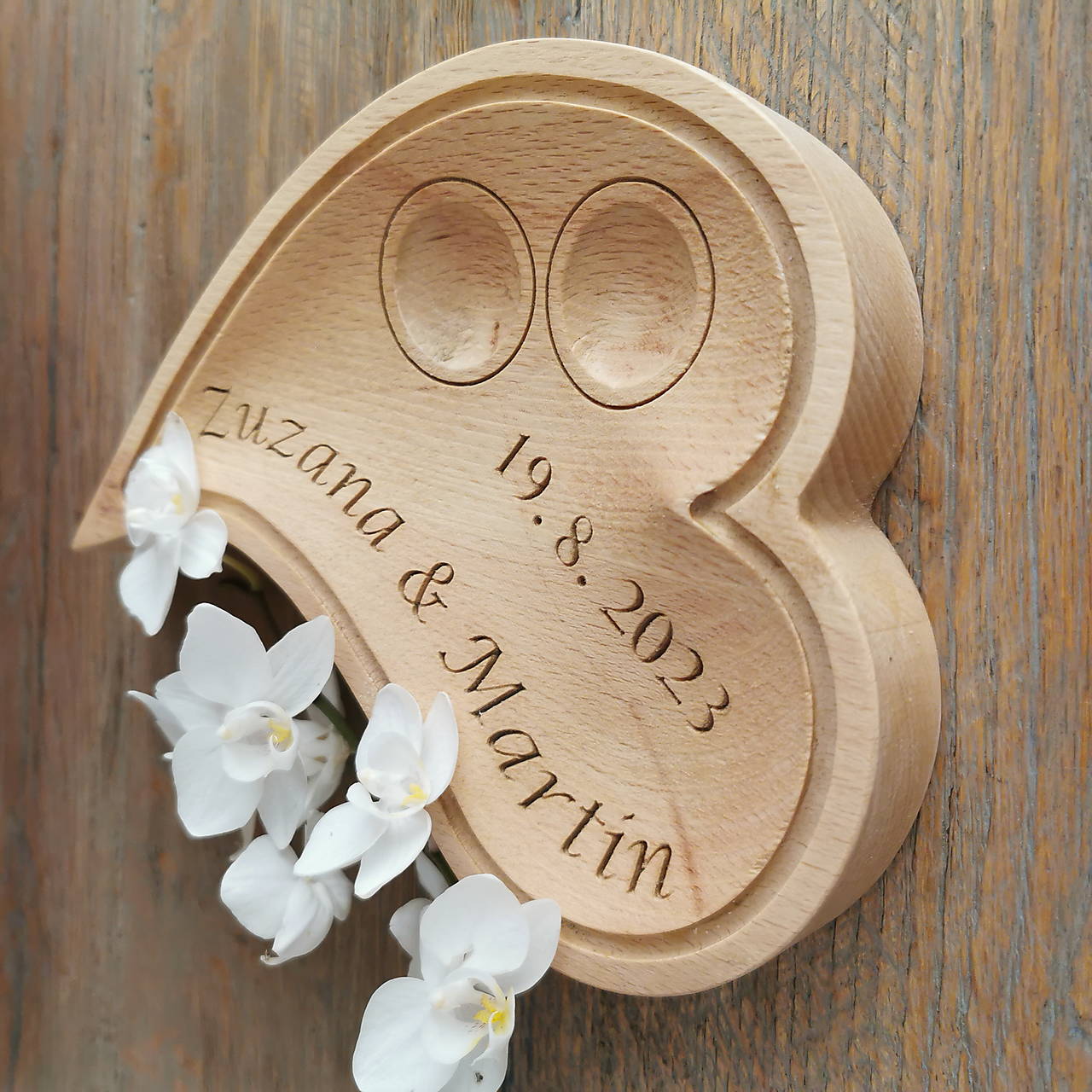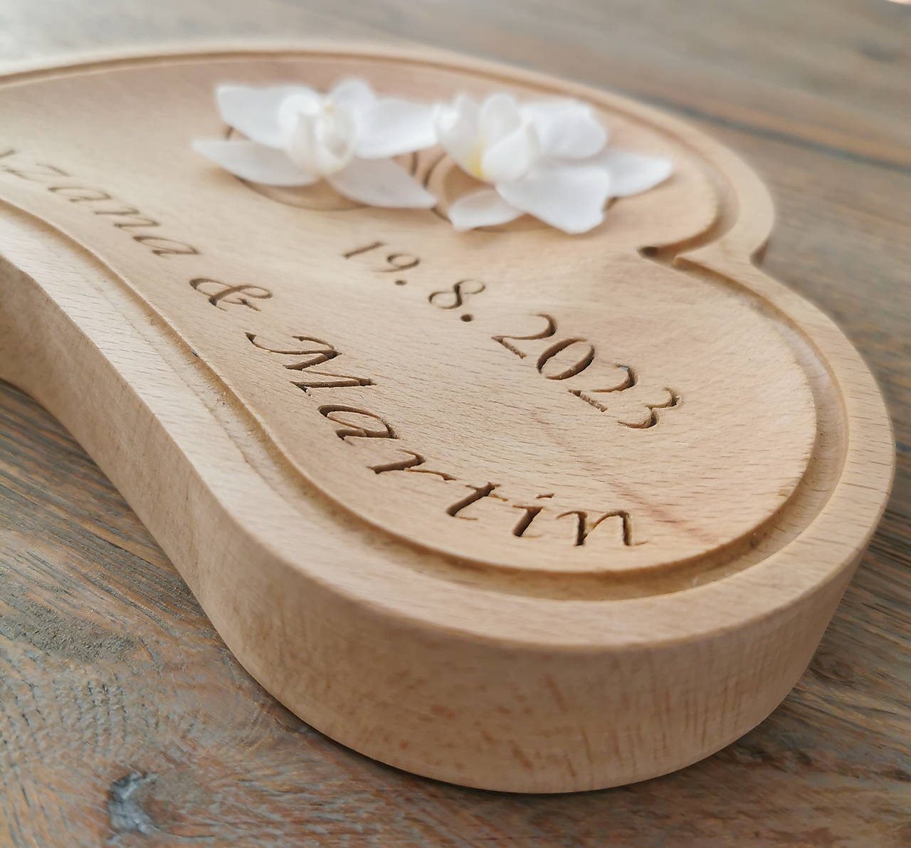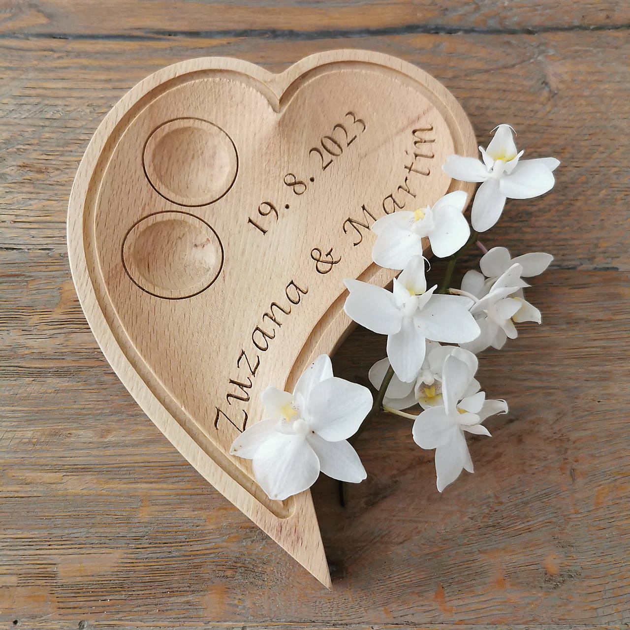 Srdiečko môžeme vyrobiť z bukového, dubového, orechového, čerešňového dreva s menami a dátumom svadobného dňa na požiadanie.