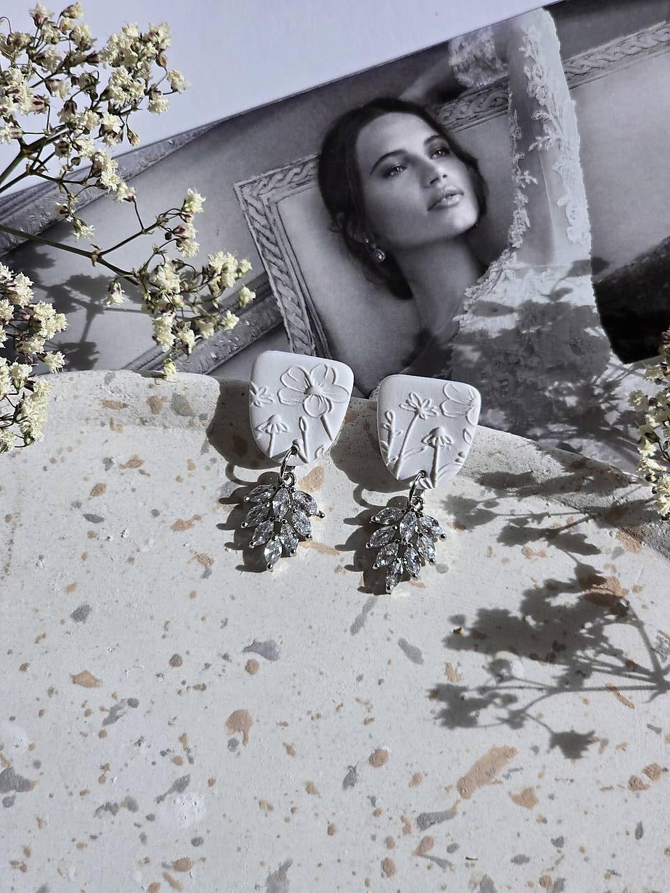 Ručne vytvorené náušnice z bielej polymérovej hmoty s jemným kvetinovým reliéfom.