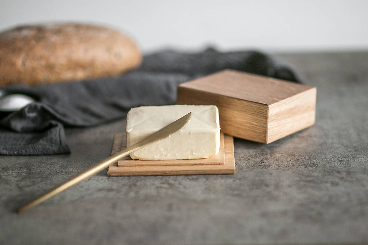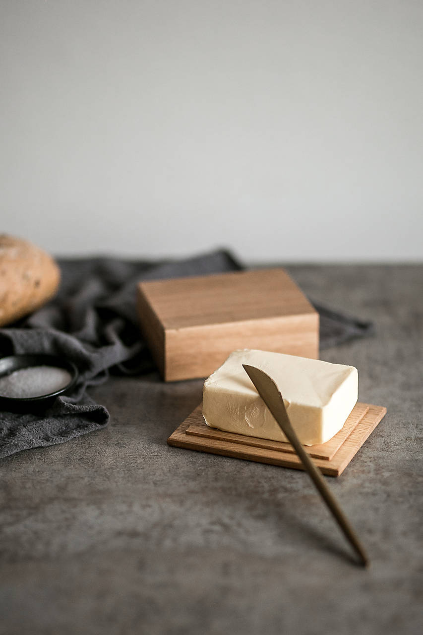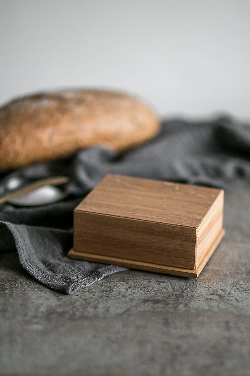 Dizajnová nádobka na uskladnenie masla vyrobená z dubového dreva. Maselnička je ošetrená bio olejom značky OSMO, ktorý je vhodný na styk s potravinami.