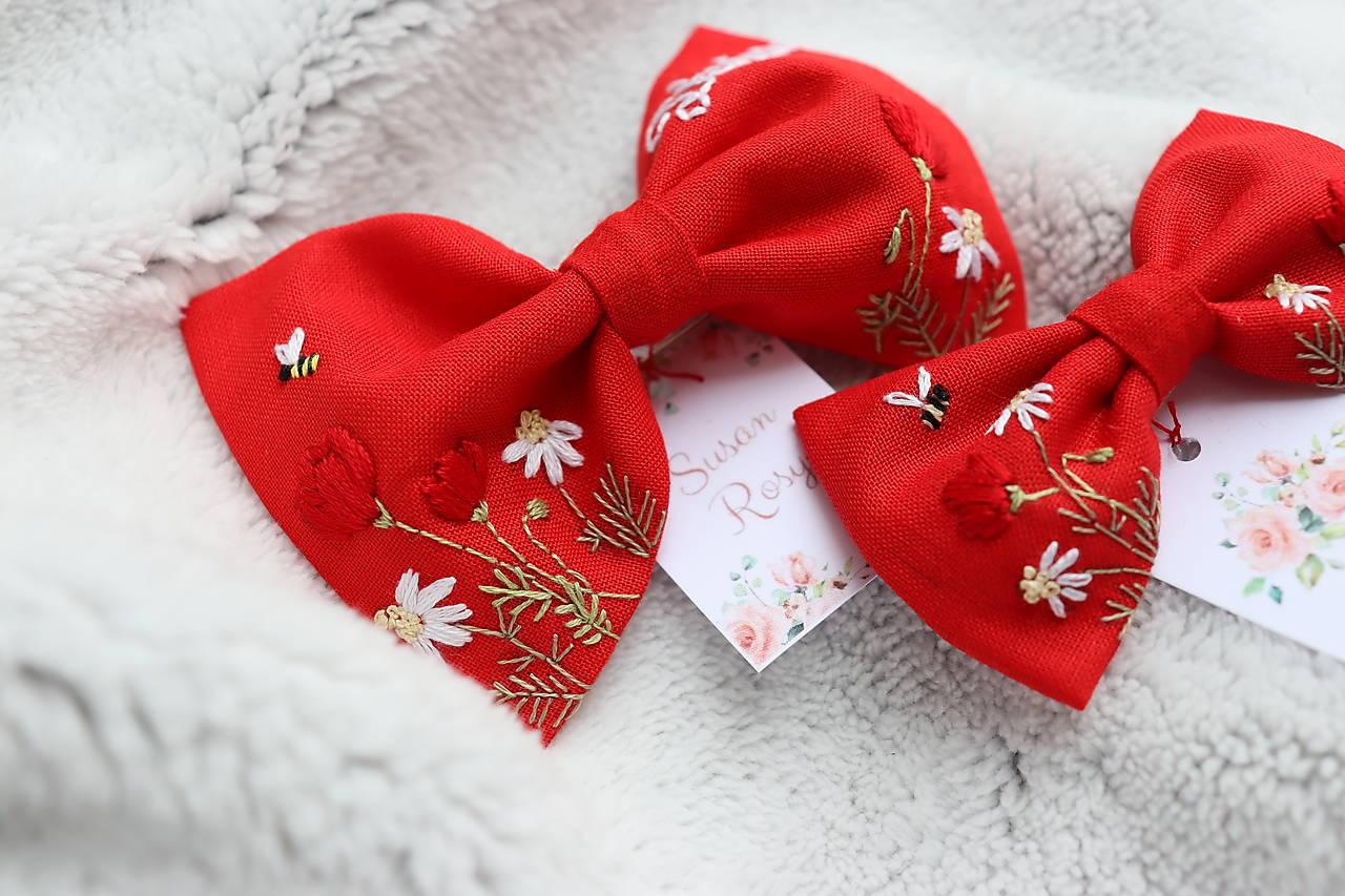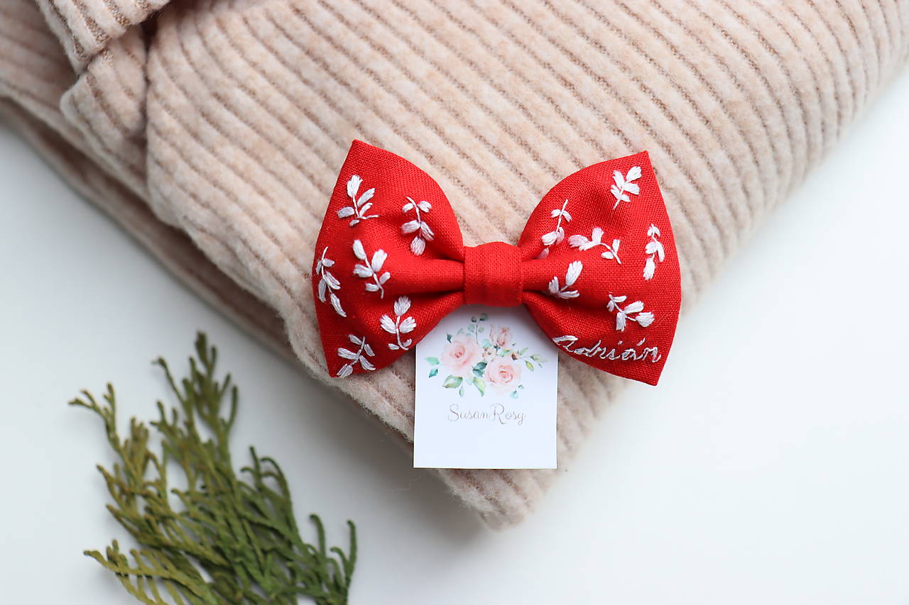 Mašličky sú vyšívané ručne a ušité z kvalitnej bavlnenej látky. Výšivka je pevná a odolná. Vyrobím Vám ich v rôznych farbách s rôznymi vyšívanými motívmi (kvety, lístky, symboly, iniciály...)