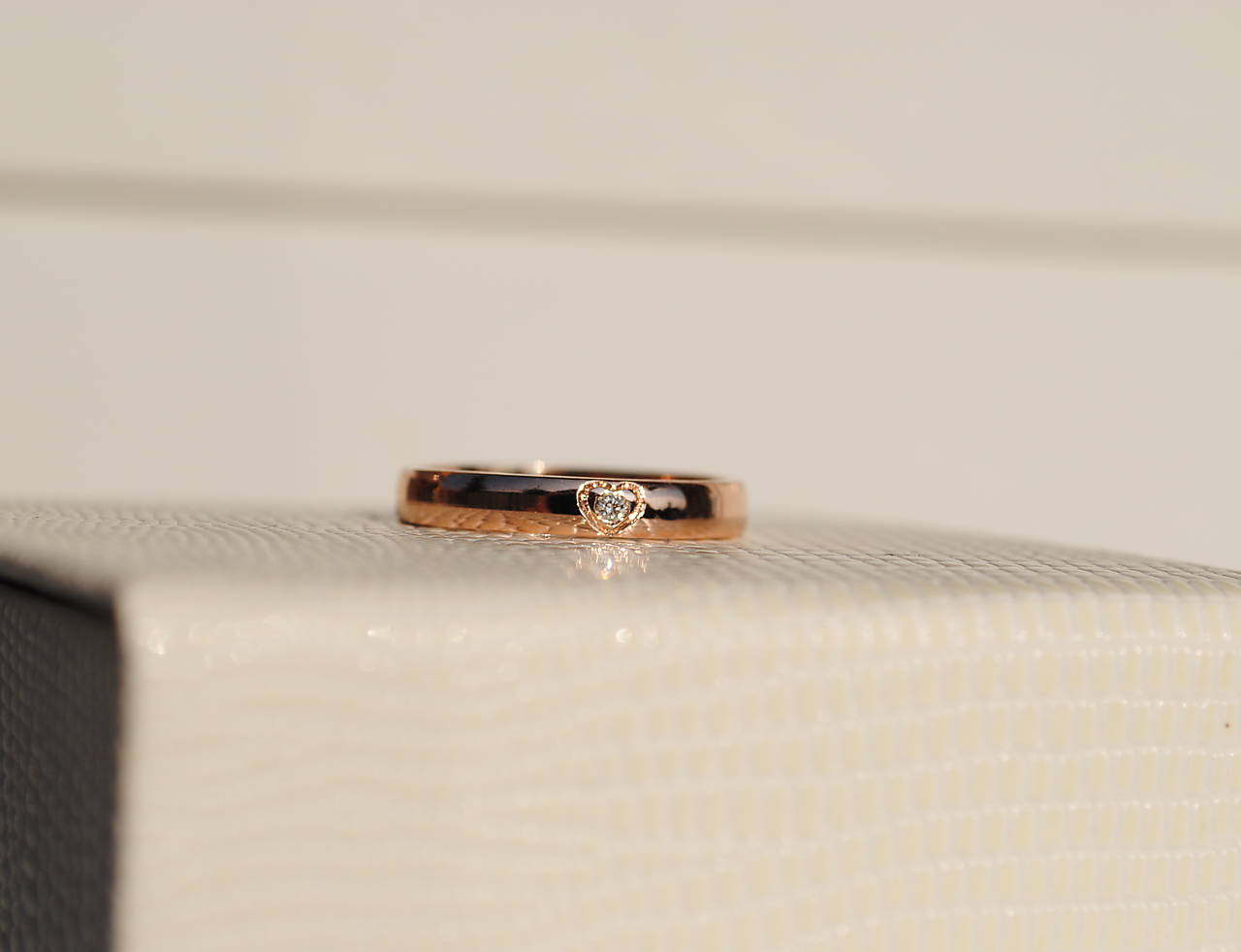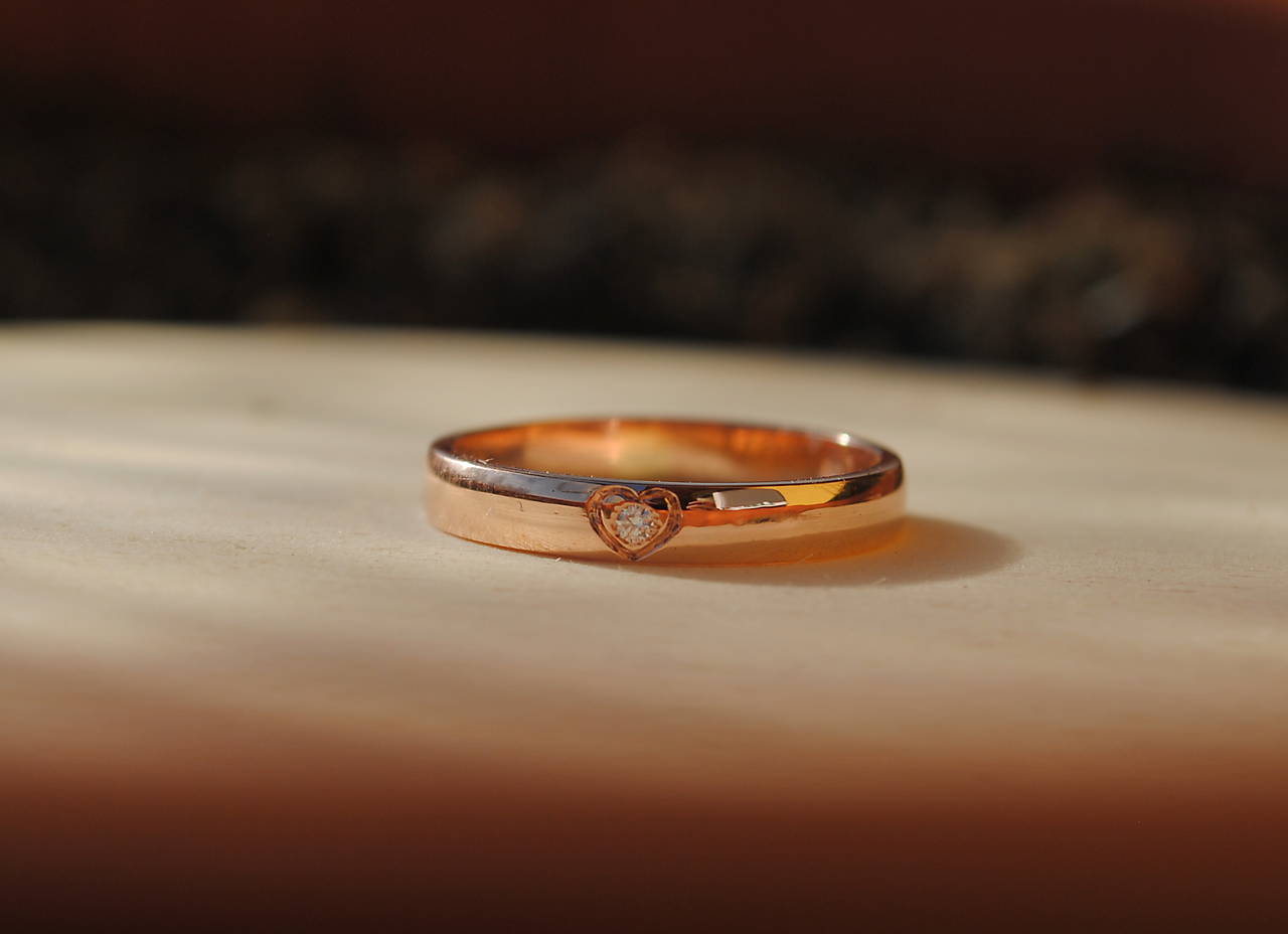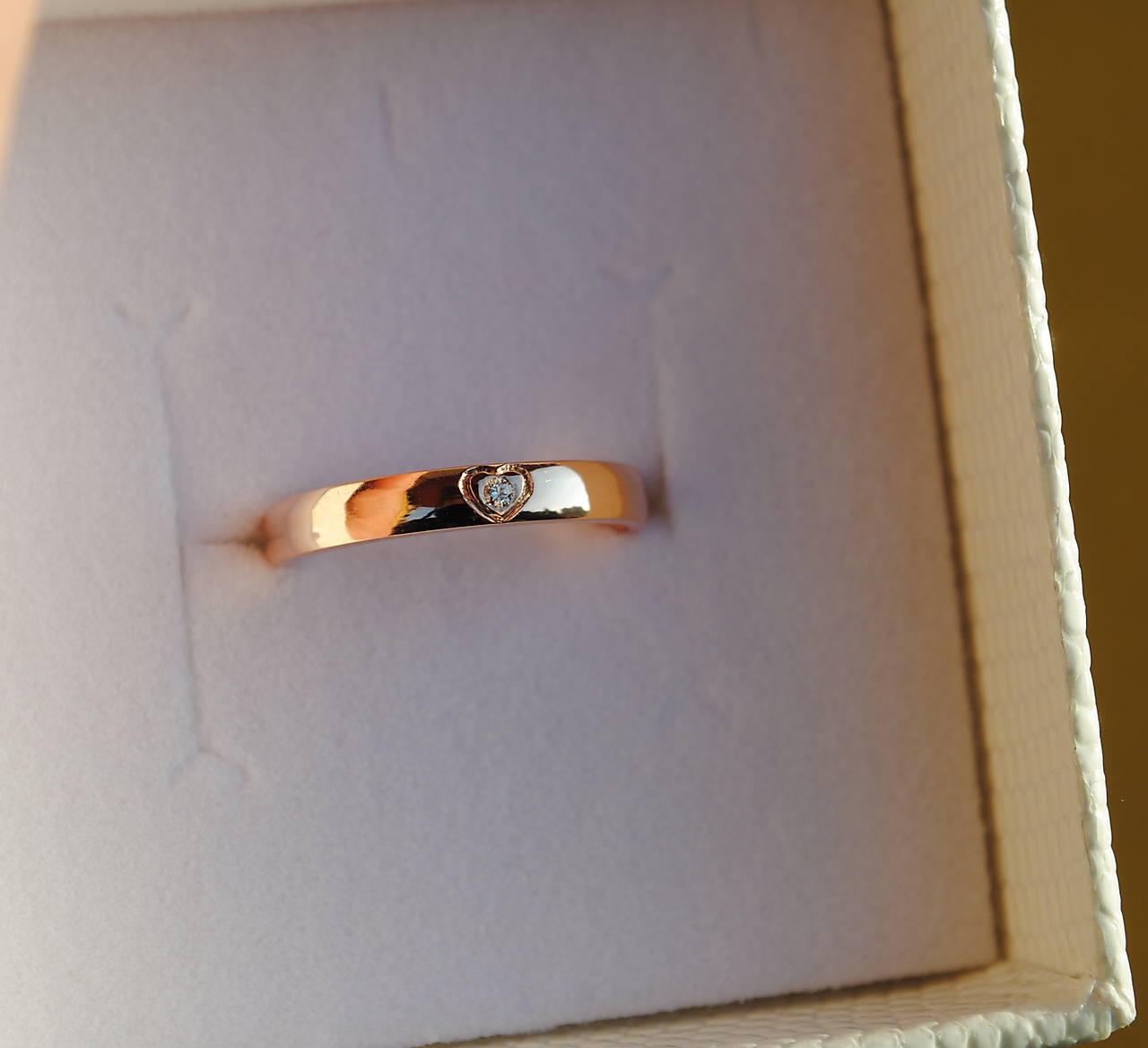Romantický a nežný prstienok z ružového zlata 585/1000 v šírke 3mm, zvonka zaoblený. Ručne ryté srdiečko a osadený diamant 1,5mm. farba zlata môže byť aj žltá, alebo biela. Miesto diamantu tiež zirkón.