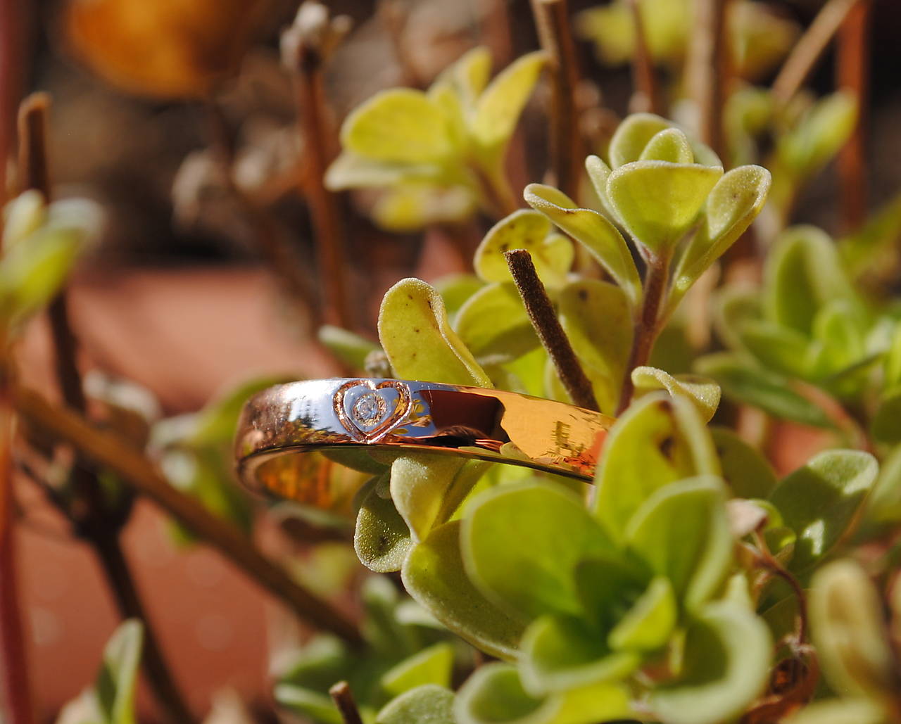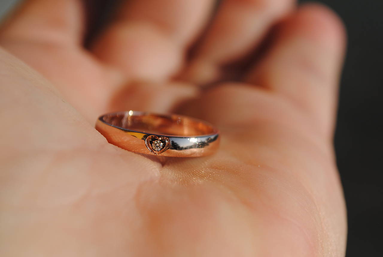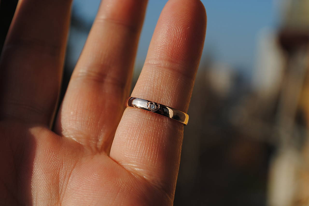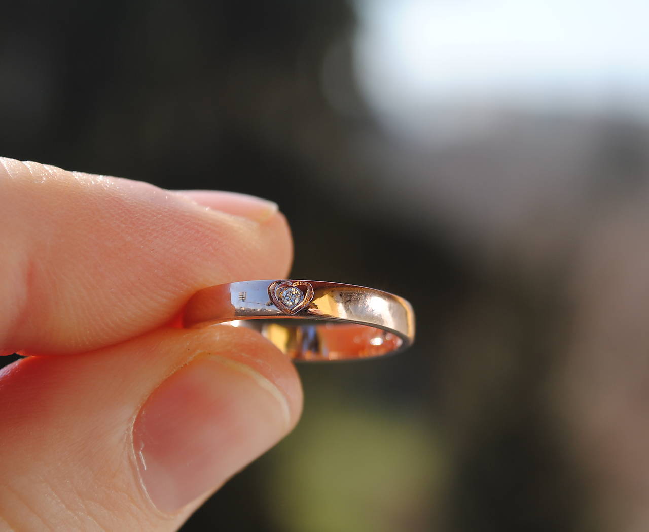 Romantický a nežný prstienok z ružového zlata 585/1000 v šírke 3mm, zvonka zaoblený. Ručne ryté srdiečko a osadený diamant 1,5mm. farba zlata môže byť aj žltá, alebo biela. Miesto diamantu tiež zirkón.