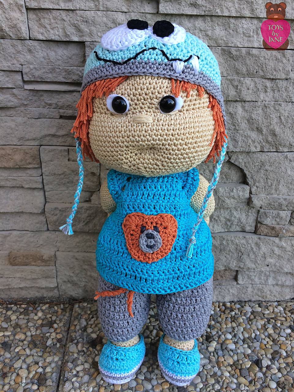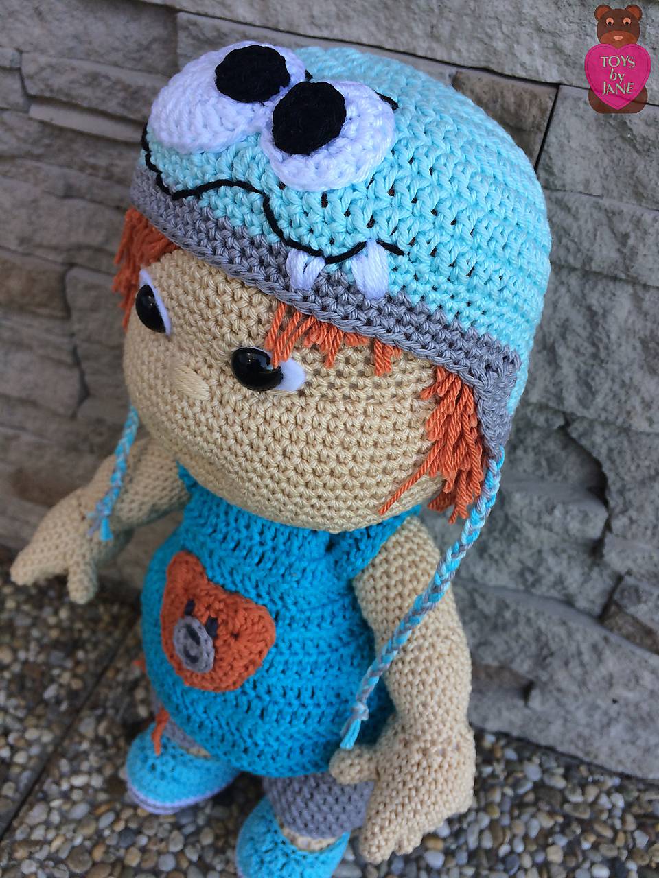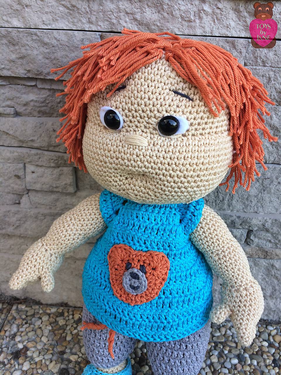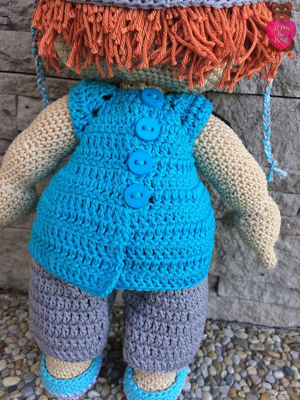 Oči sú bezpečnostné, so zarážkou, podšité bielym filcom. Vlásky sú viazané jednotlivo a je možné ich prečesať riedkym hrebeňom . Chlapček a aj celé oblečenie sú zo 100% bavlny.