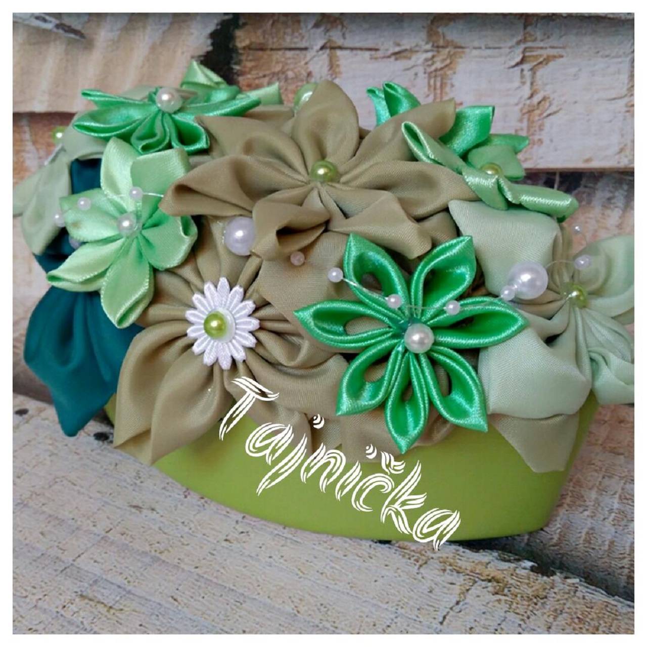 Ikebanka vyhotovená v keramickom kvetináči. Kvety sú ručne robené zo saténu a z polyestru.