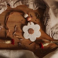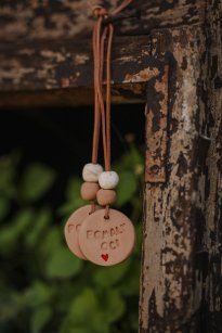 Každý z mojich difuzérov je ručne modelovaný z terakotovej hliny (príp. doplnený bielou), doplnený kožou na zavesenie a keramickými korálkami rovnako z tejto hliny. Každý kus je navrhnutý s dôrazom na estetickosť aj funkčnosť. V ponuke nájdete jednoduchý kruhový difuzér, originálny v tvare kvetu, ale napríklad aj darčekové difuzéry s vtlačeným textom. :)