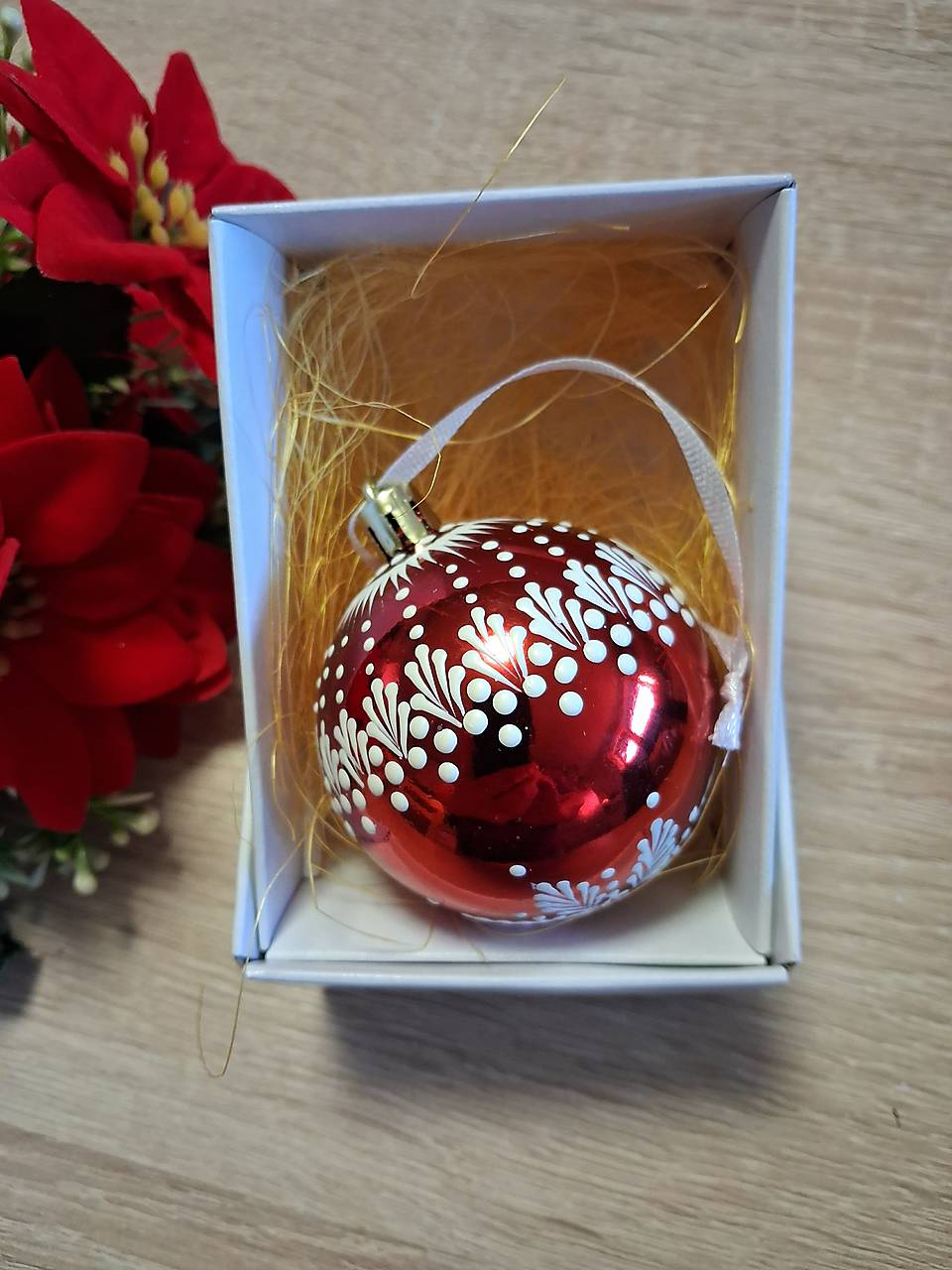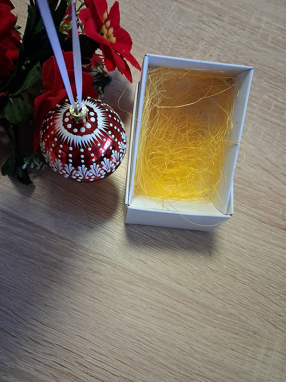 V krabičke je jedna vianočná gua . Maľovaná bielym horúcim voskom.