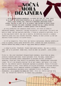 ...už to uprašné počasie naznačovalo, že dnešný deň bude iný. Viete, mohlo by sa zdať, že nočnou morou krajčírov je, že rozžeravná žehlička prejde po tenkej vrstve pokožky ruky, alebo že si nožničkami odstrihnete bruško pršteka. Mohlo by sa zdať, že to je situácia, kedy navíjate na stroji cievku a rýchlo kmitajúca ihla medzi niekoľkými vrstvami kovu sa v jednej stotinke sekundy vzprieči a zlomená vystrelí rovno do dúhovky...