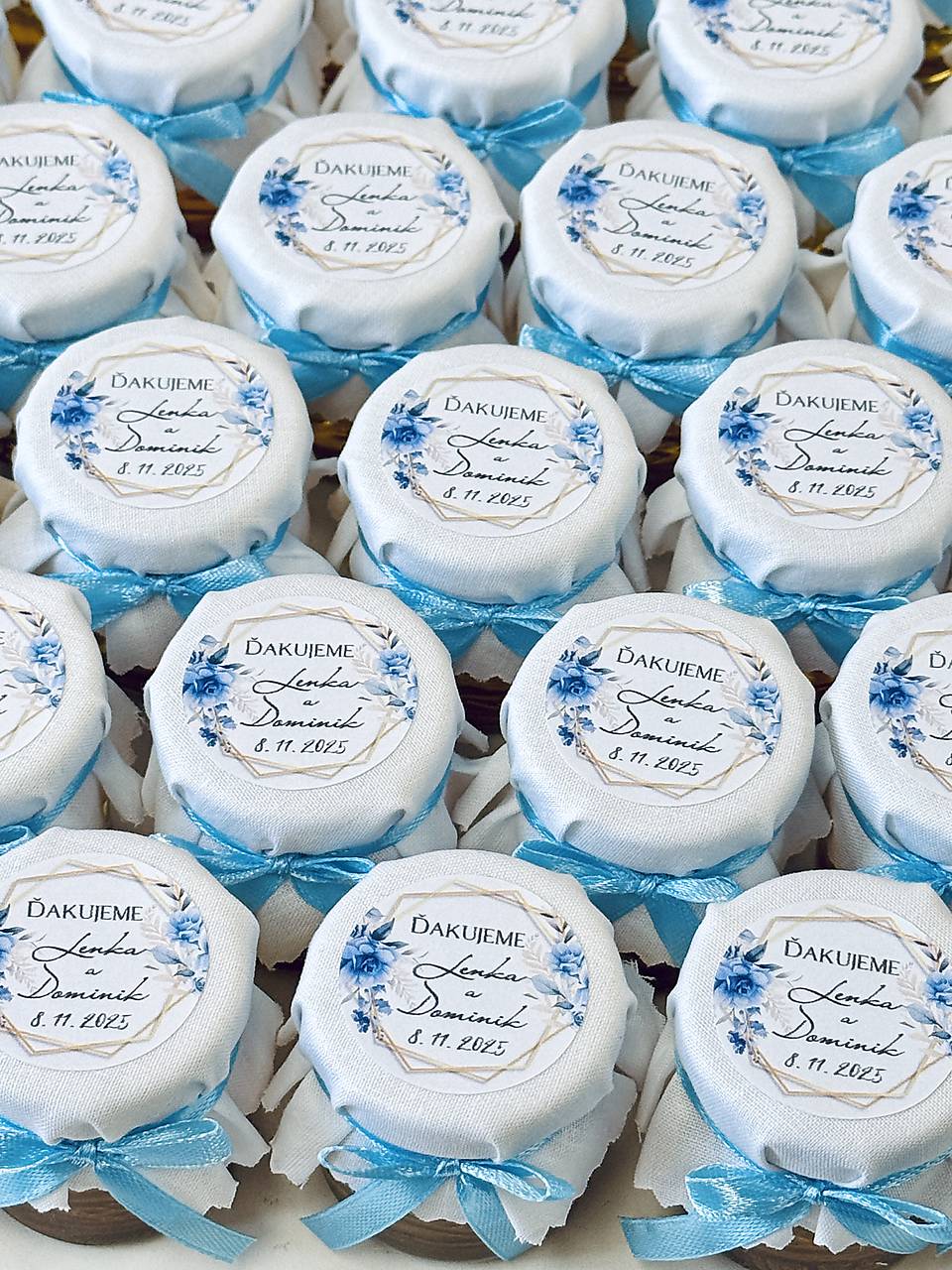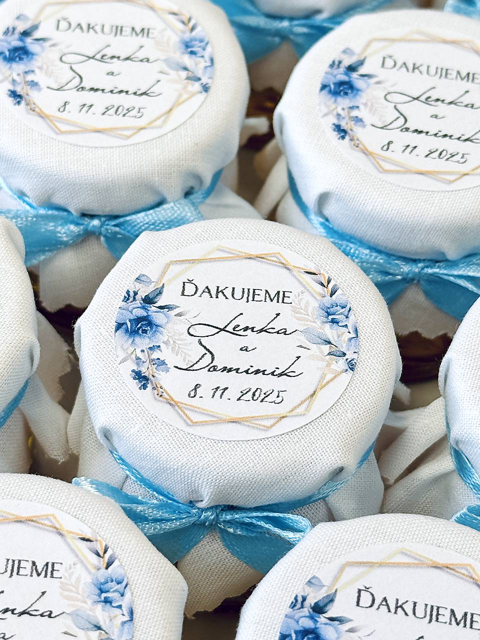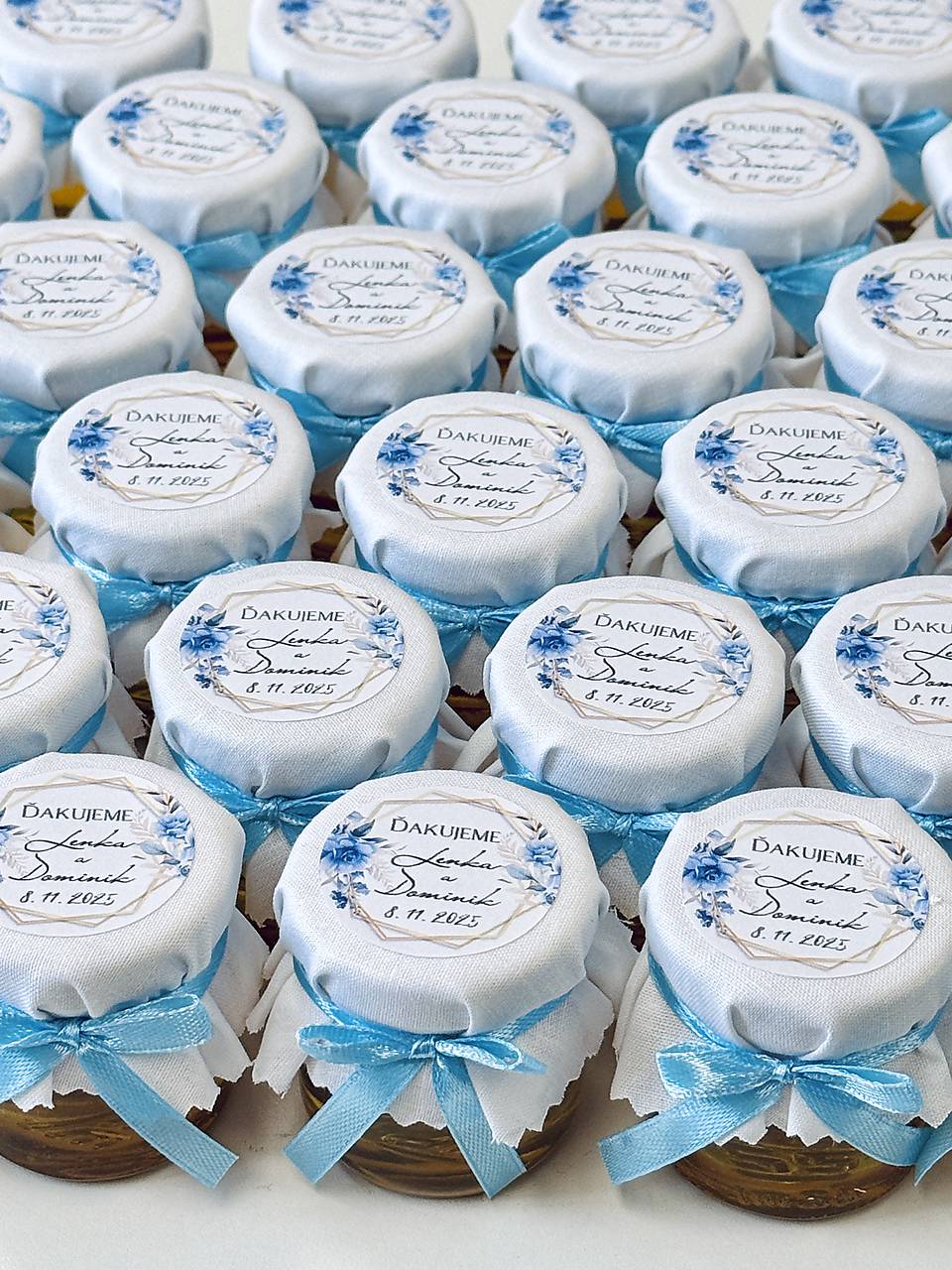 Sladké darčeky pre vašich hostí. Objem fľaštičky 40ml. Ozdobujem bielou alebo farebnou látkou, podľa vašej predstavy. Na medík vám pripravím etiketku s menami a dátumom svadby tiež vo zvolenej farbe.