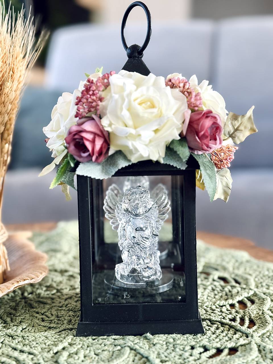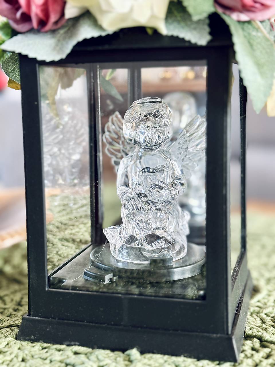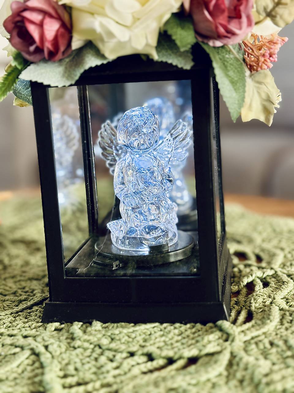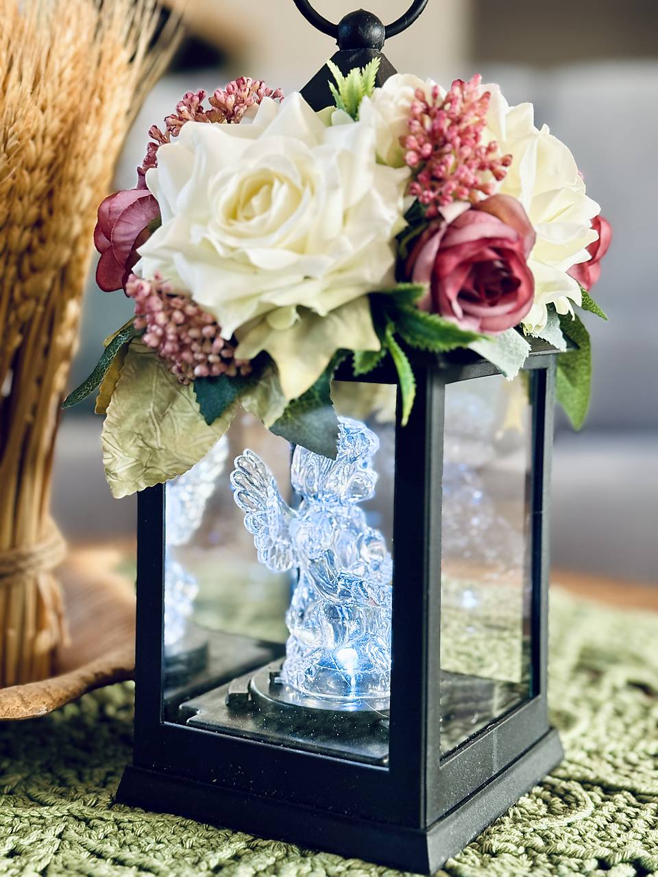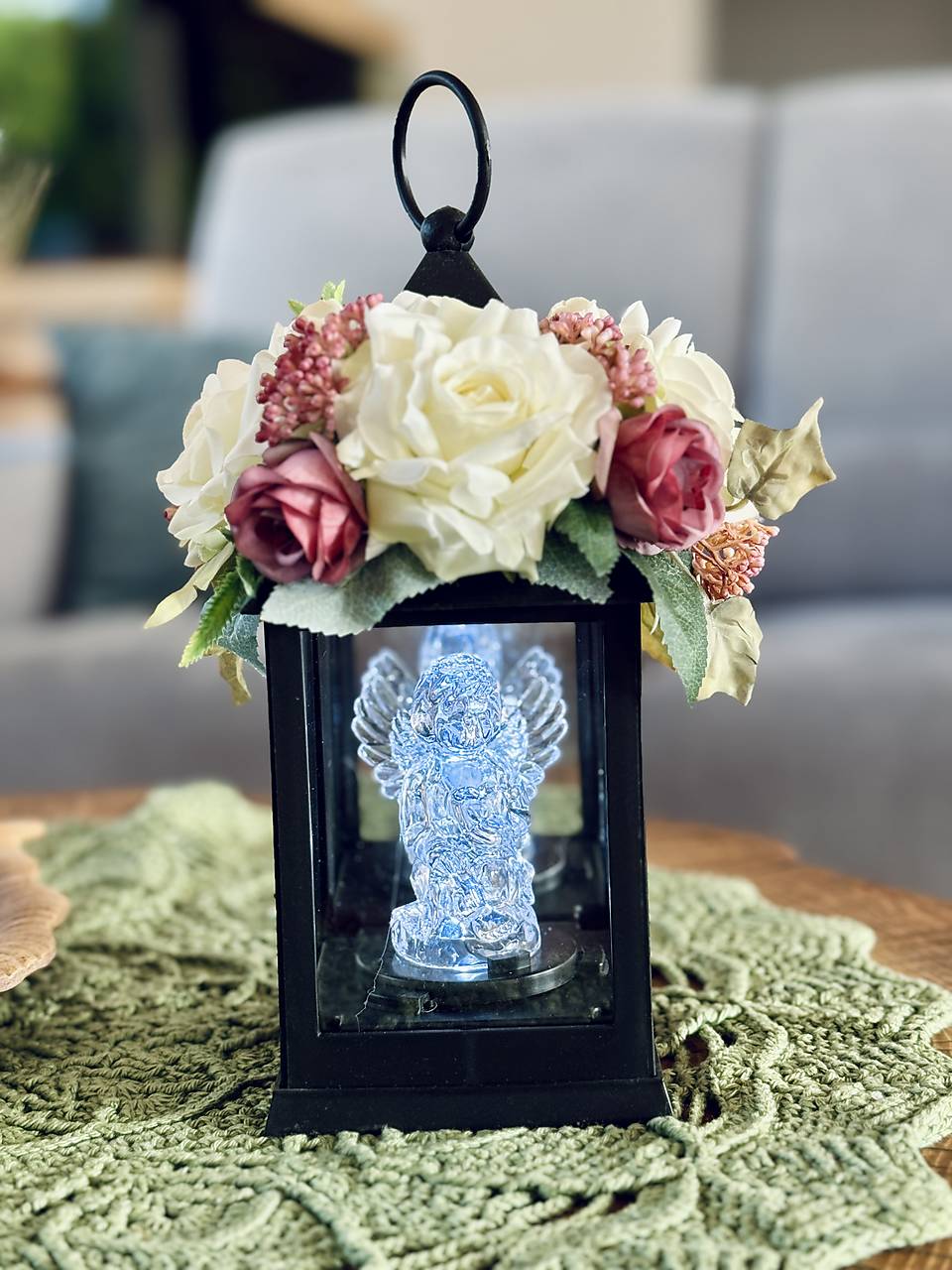 Spomienka zosnulým. Smútočný lampáš so zdobením a LED anjelikom vo vnútri, na batérie.