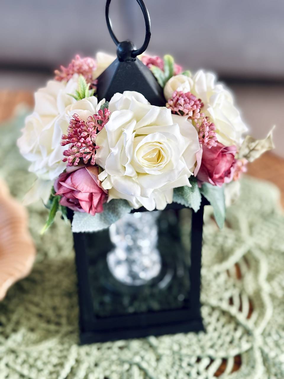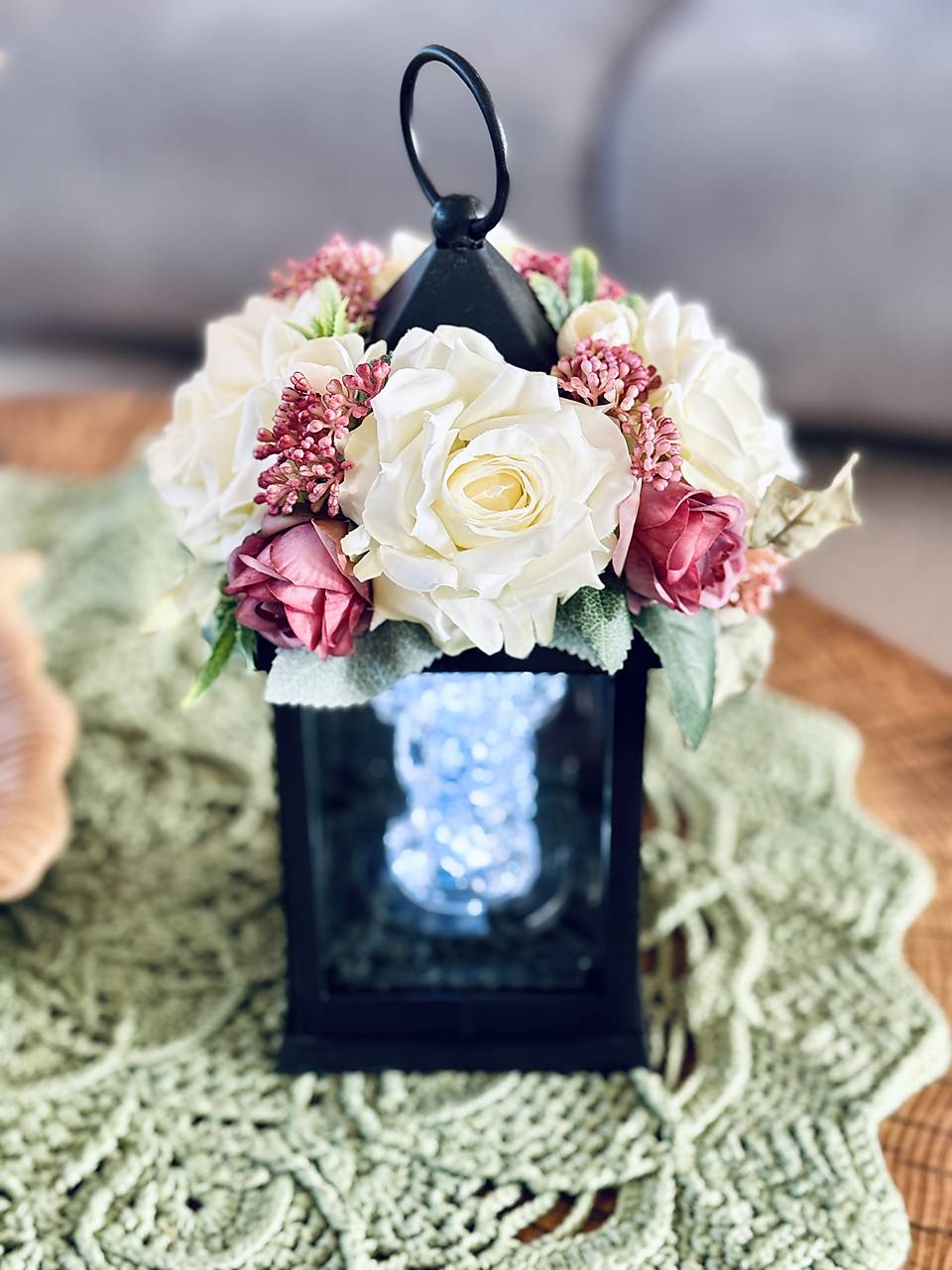 Lampáš je umelý so sklom a zrkadlom na zadnej strane. Ozdobený umelými kvetmi